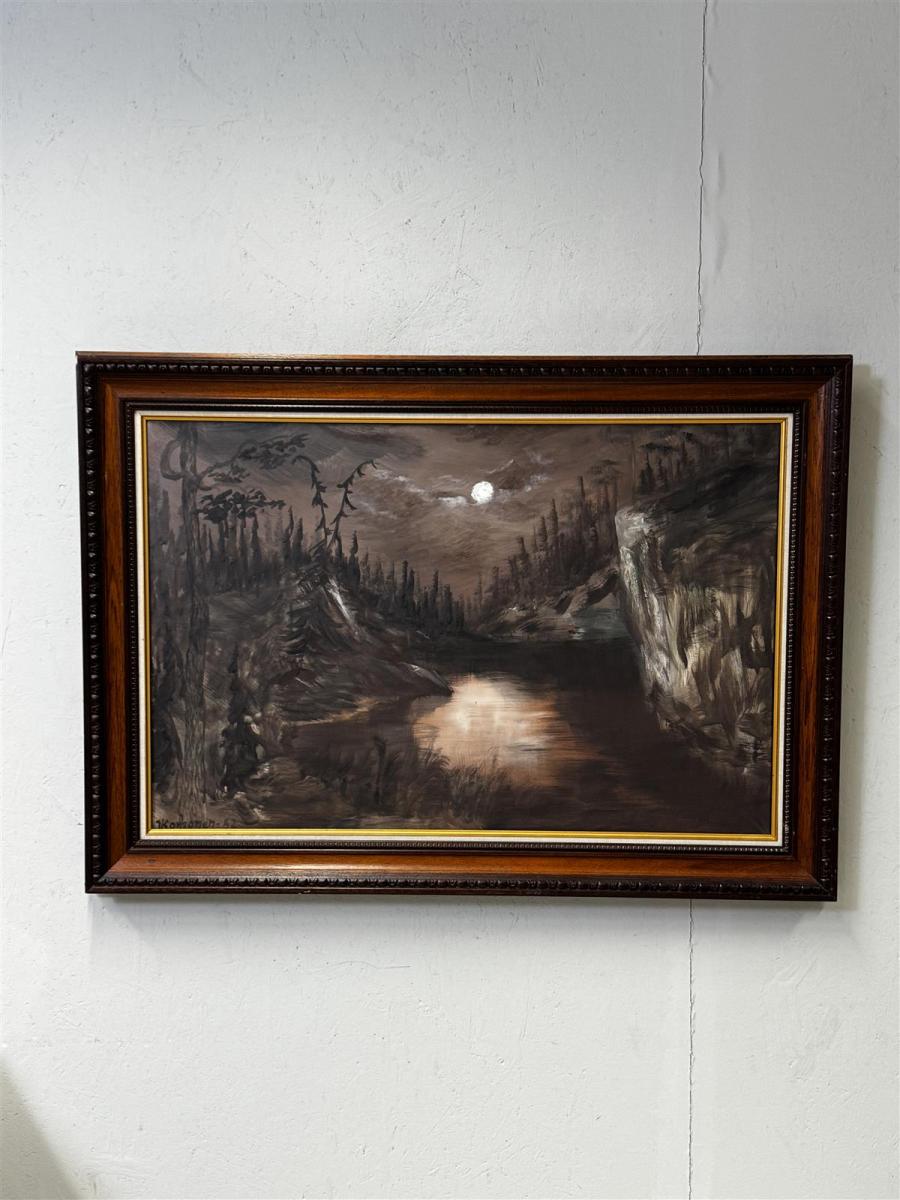 Iso kokoinen Öljyvärimaalaus, jossa on maisema kuutamolla. Kehyksessä on koristeellisia yksityiskohtia. Alareunassa on signeeraus ’Korhonen -52’.