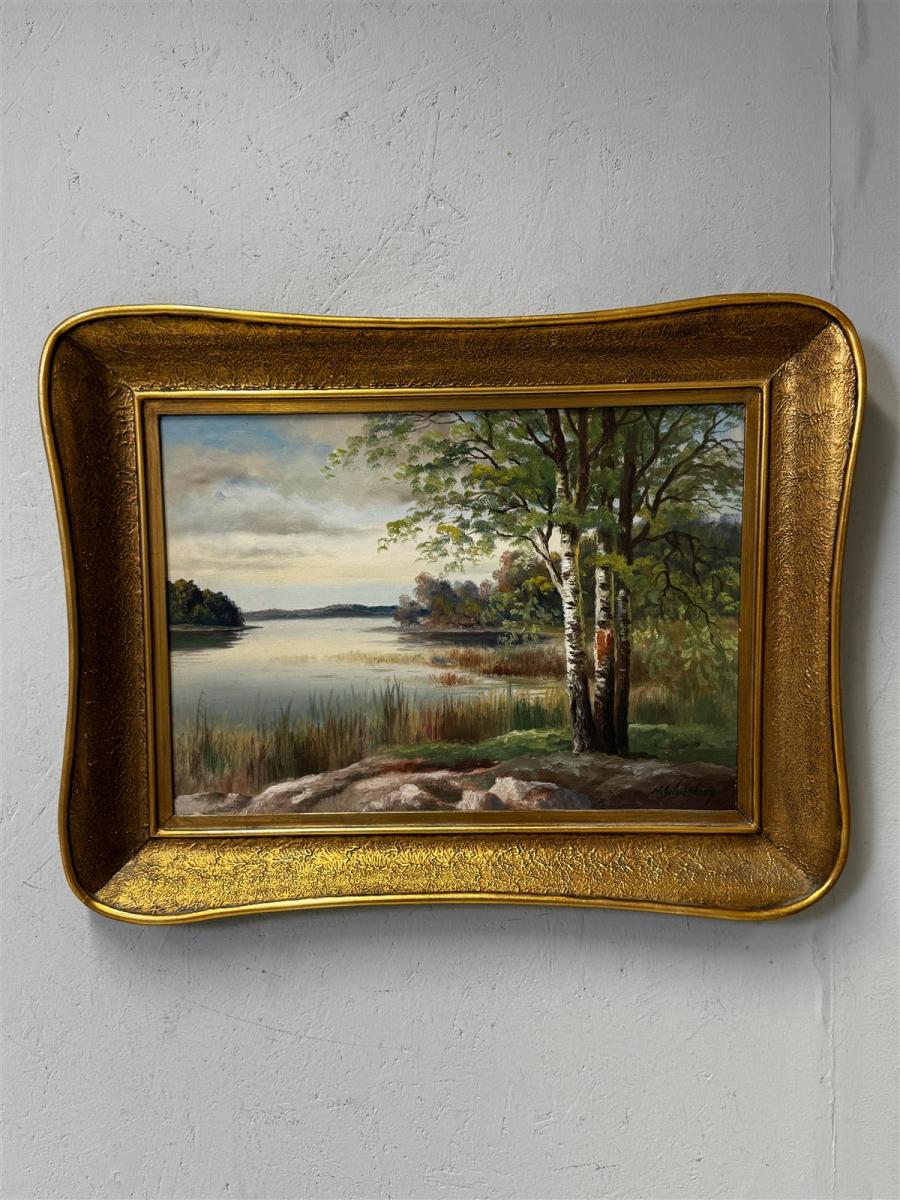 Öljyvärimaalaus kovapinnalle, joka esittää rauhallista järvimaisemaa taiteilija N Silverberg. Teos on kehystetty näyttävillä kultakehyksillä, jotka korostavat maalauksen yksityiskohtia ja värejä. Alareunassa on signeeraus, mutta taiteilijaa ei ole tunnistettu.