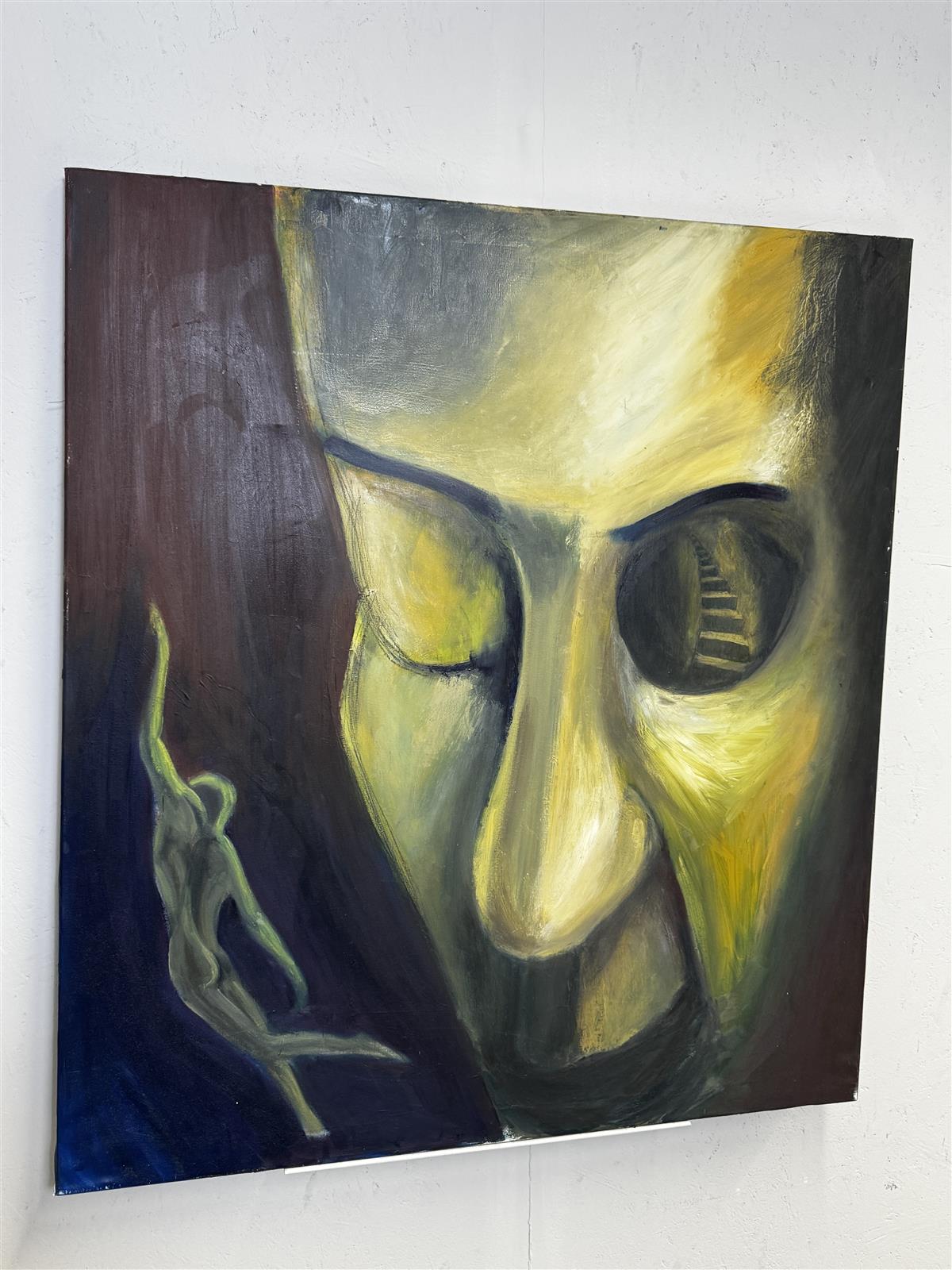 Surrealistinen öljyvärimaalaus, jossa on suuret kasvot ja abstrakteja elementtejä. Värimaailma on tumma ja mystinen, korostaen teoksen unenomaisuutta ja syvyyttä. Maalaus on toteutettu kankaalle, ja siinä on käytetty voimakkaita siveltimenvetoja, jotka luovat dynaamisen vaikutelman.