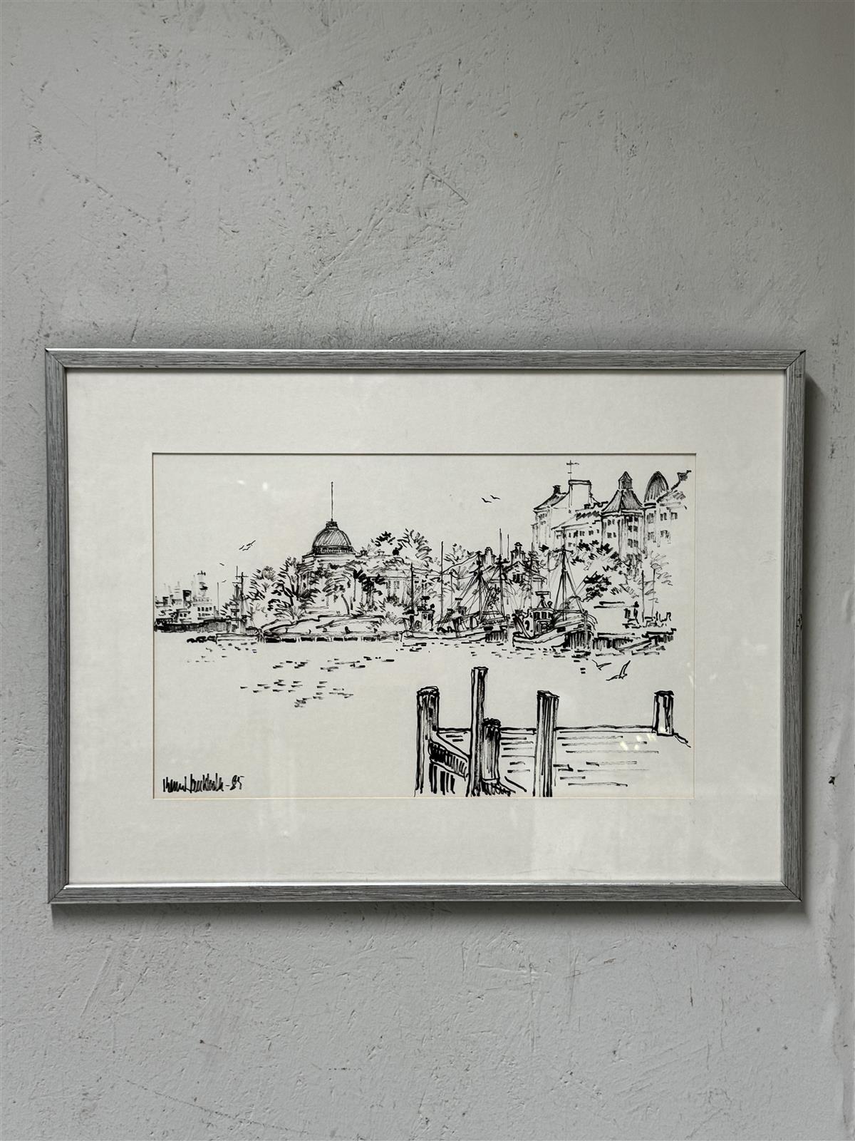 Taulu piirros signeerattu Mauri Kukkola vuodelta 1985. Teos esittää yksityiskohtaisen kaupunkimaiseman, jossa on satama ja rakennuksia.