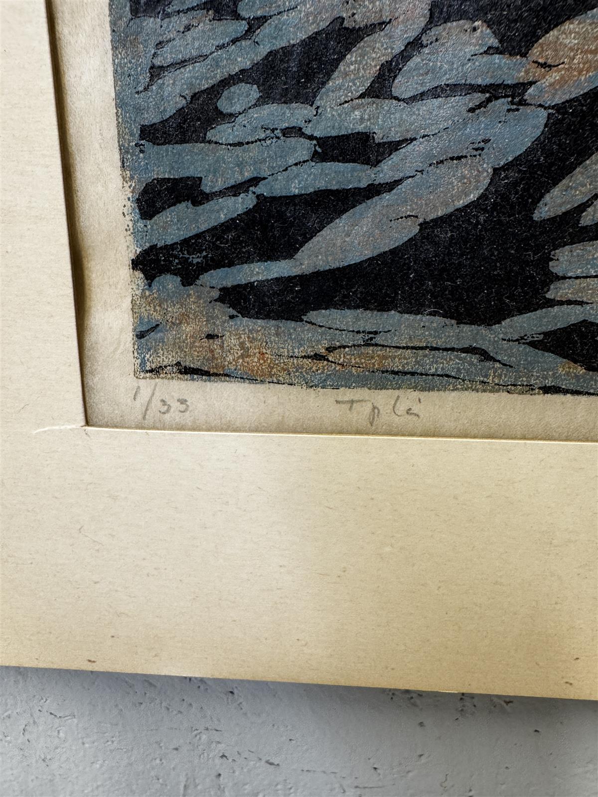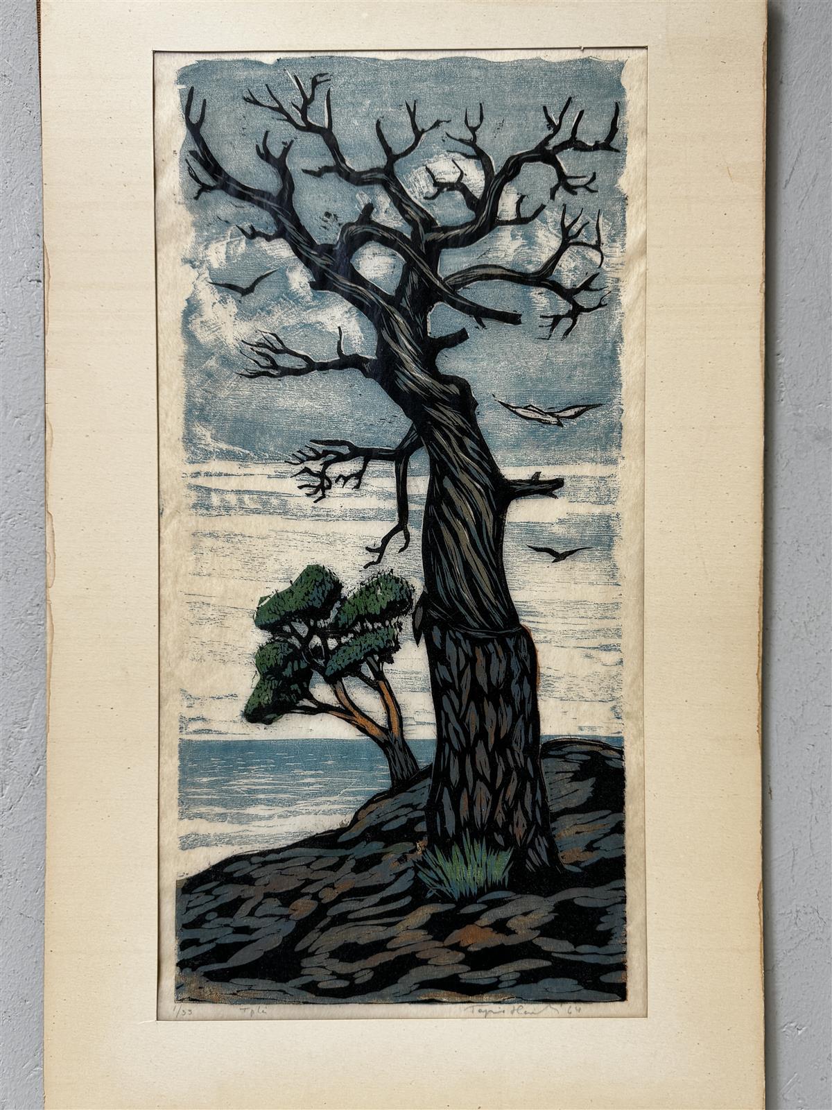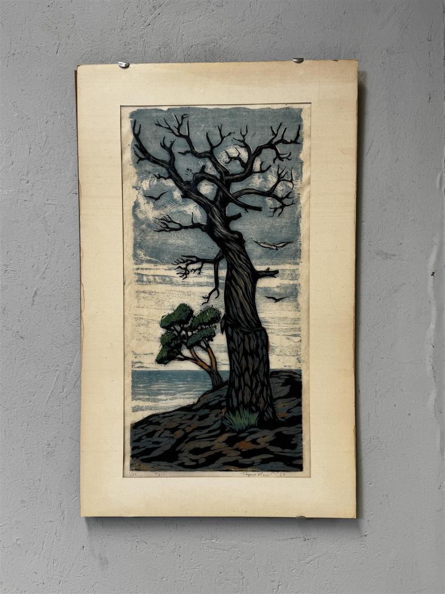 Puupiirros, jossa on kuvattuna vanha puu karulla kalliolla. Taustalla näkyy meri ja pilvinen taivas, mikä luo teokseen rauhallisen ja hieman melankolisen tunnelman. Teos on signeerattu Tapio Haili -64 ja numeroitu 1/33,