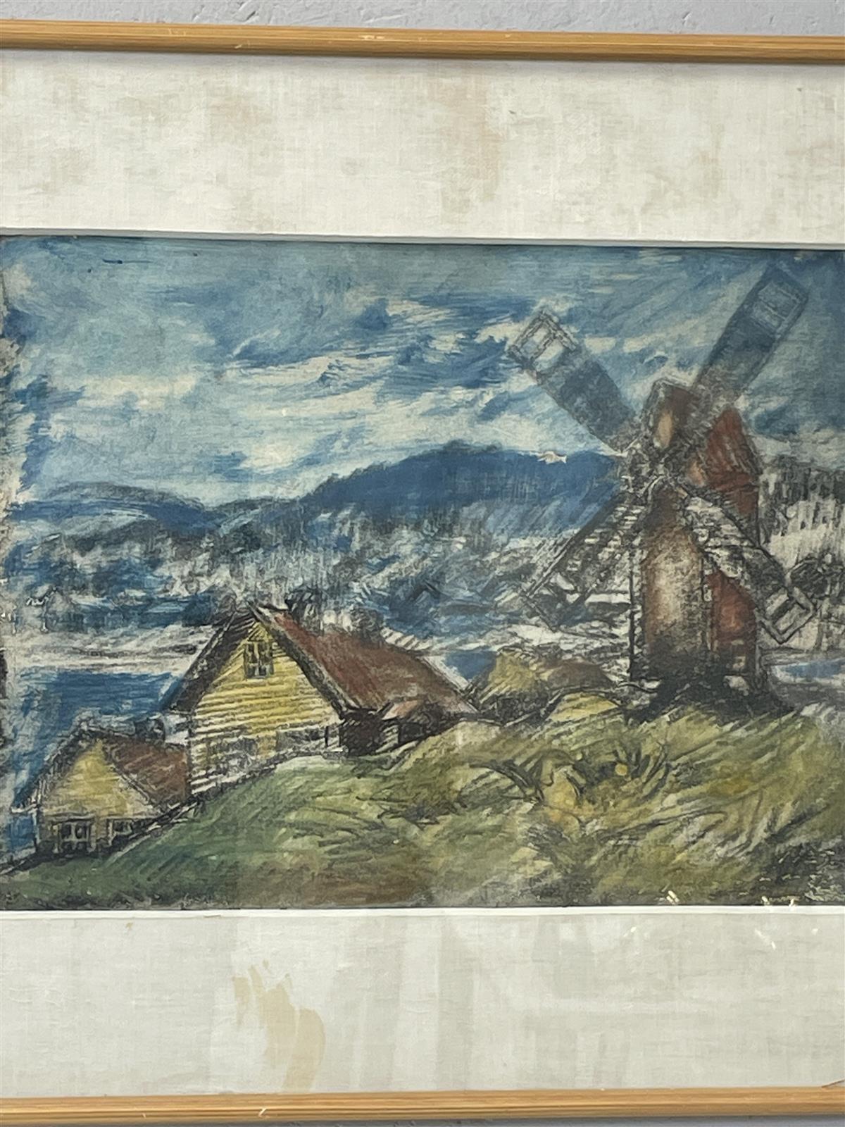 Taulu ”Tuulimylly maisema” värietsaus. Ei signeerausta näkyvissä.