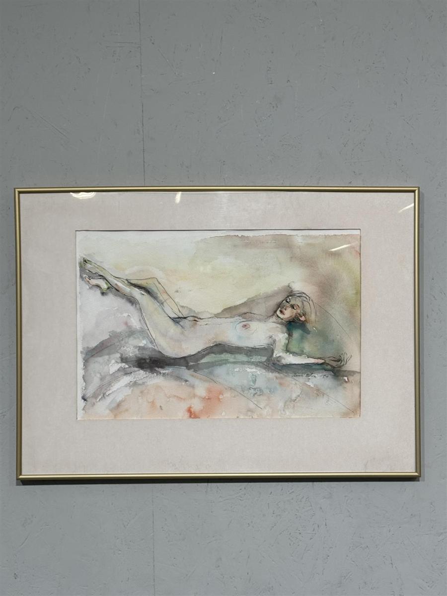Vesiväri teos naisesta. Teos on signeerattu ’Aino Elsa -94’, eli Aino Pihlajavaara. Taakse kiinnitetty tietoa taiteilijasta