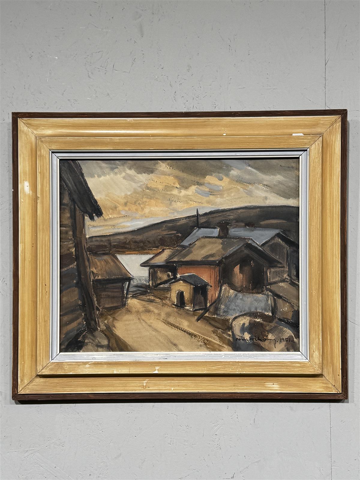 Vesiväriteos, jonka on signeerannut Nils Wikberg vuonna 1951. Teos esittää maisemaa, jossa on useita rakennuksia ja taustalla näkyvä järvi tai joki.