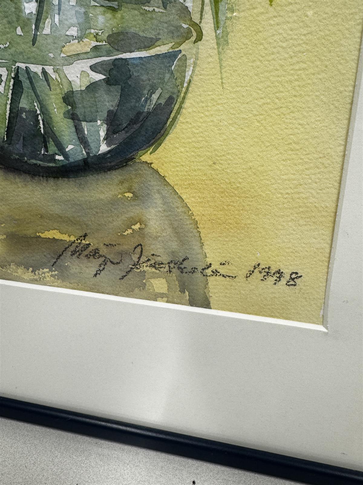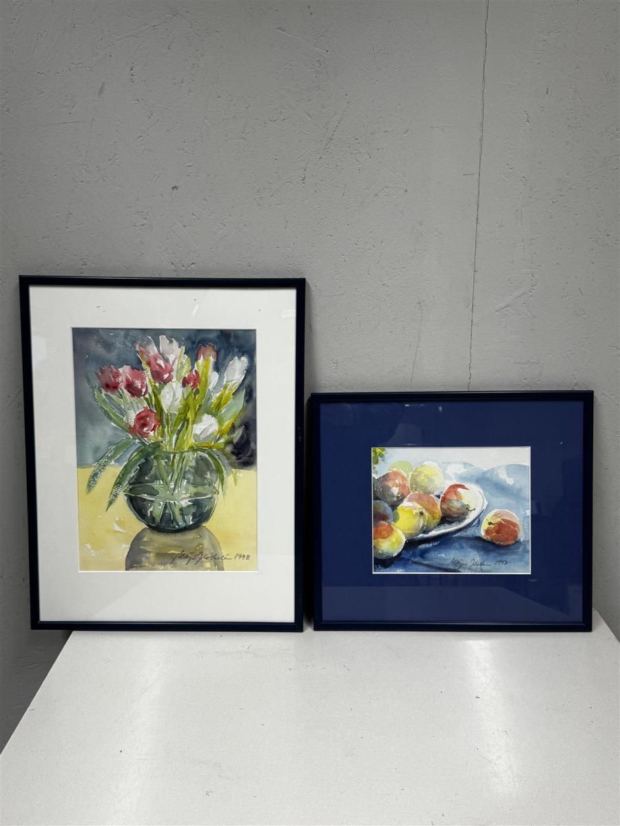 Kaksi vesivärimaalausta, joissa on kukkia ja hedelmiä. Molemmat maalaukset ovat kehystettyjä ja signeerattuja Maija Jääskelä (?) vuosina 1997 ja 1998.