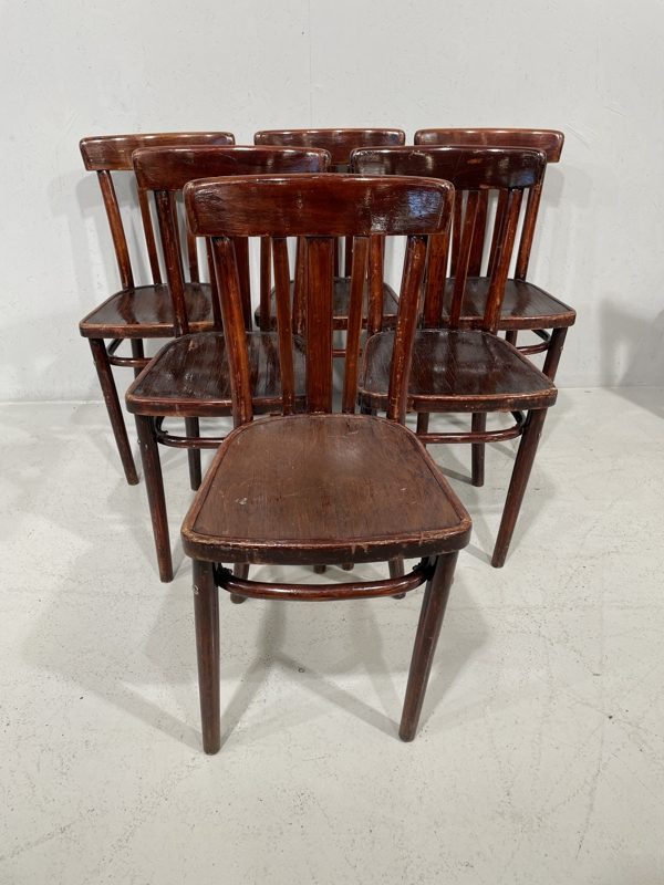 Nämä Thonet-tuolit ovat aidot arviolta 1920-luvun sodan jälkeiset mallit, jossa yhdistyvät tyylikäs viimeistely ja funktionaalisuus. Tuolit on valmistettu taivutetusta puusta ja niiden selkänojissa on tunnusomainen kaarevuus sekä pystysuuntaiset selkärimat. Tuolien pinnassa näkyy selvää kulumaa, naarmuja sekä lohkeamia puussa. Mahdollisesti pieniä puukuituja tai liitosten löystymistä voi esiintyä. Alla aito leima.