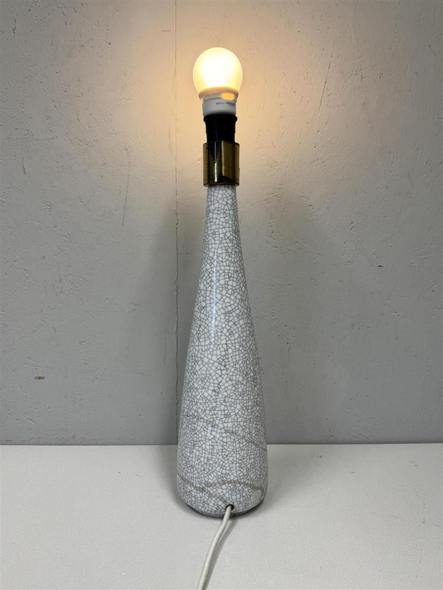 Tyylikäs vintage pöytävalaisin, jossa on keraaminen jalka. Valaisimen pinta on mielenkiintoisesti krakeloituneella kuvioinnilla, mikä antaa sille ainutlaatuisen ilmeen. Yläosassa on messinkinen yksityiskohta, joka tuo kontrastia valaisimen vaaleaan sävyyn. Valmistaja mahdollisesti Arabia, Design Toini Muona.