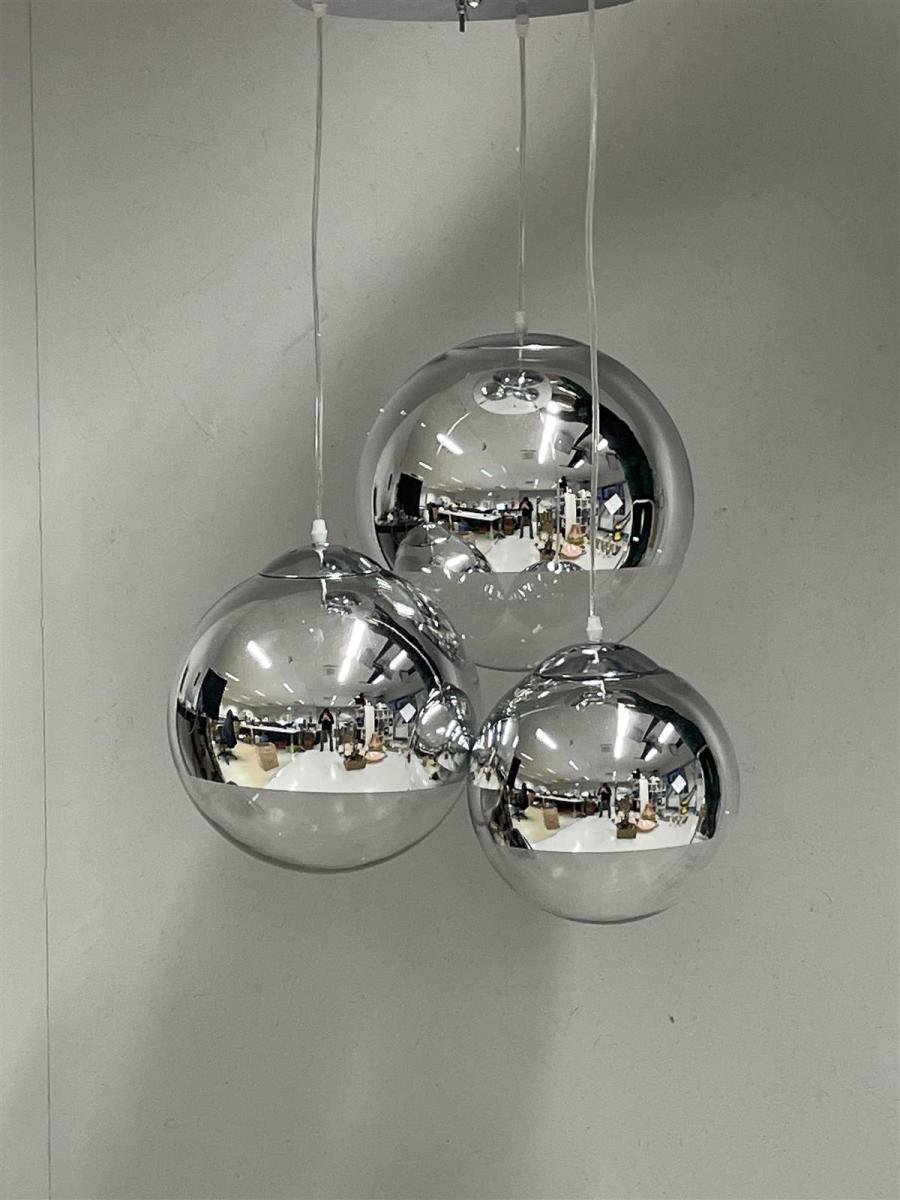 Tom Dixon Mirror Ball valaisimen replica, jossa kolme erikokoista valopalloa kattokiinnikkeessä. Ollut käyttämättömänä varastossa, joten pintakunto todella hyvä. Normaalikantainen lamppu, kattoon kiinnitykseen suositellaan ammattilainen. Mahdollista, myös irroittaa pallot yläosasta ja käyttää kolmena erillisenä pallovalaisimena.