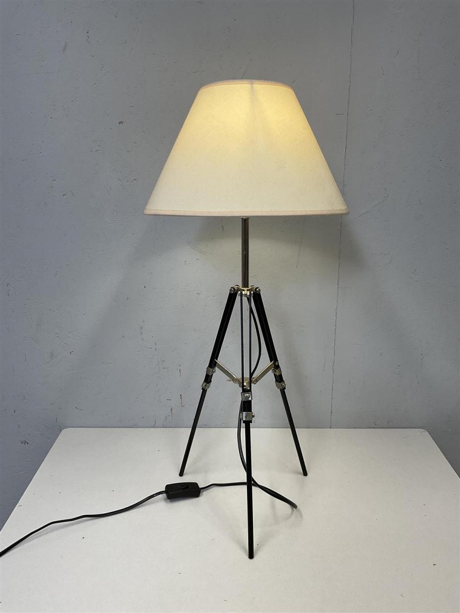 Tripod-pöytävalaisin, jossa on valkoinen varjostin ja mustat säädettävät metallijalat.