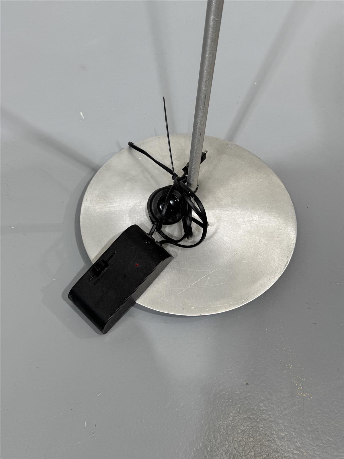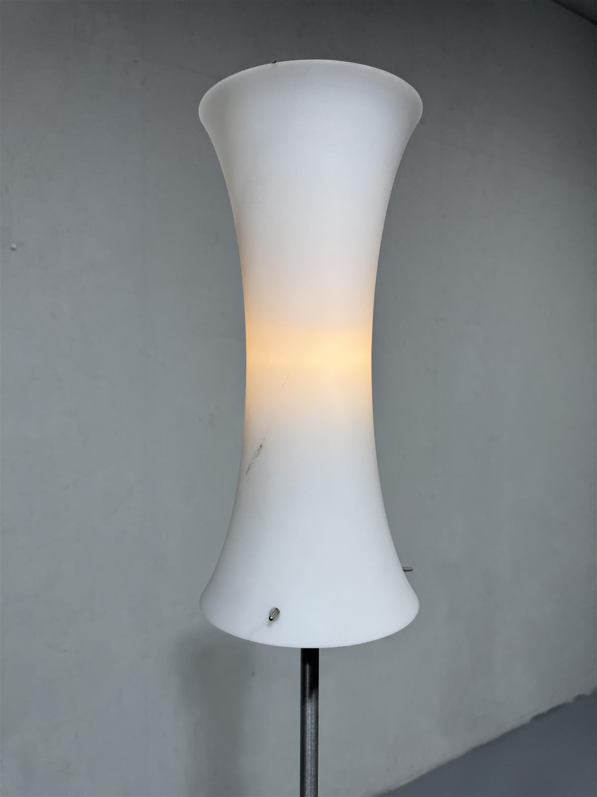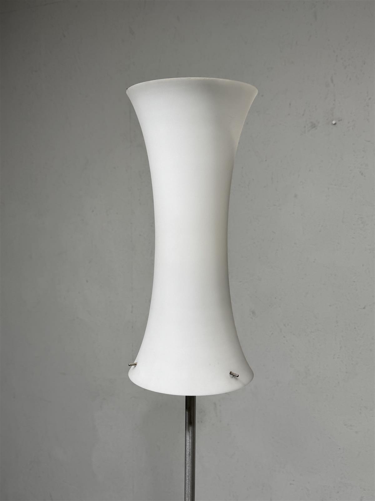 Tunnelmaa luova lattiavalaisin himmentumellä, jossa on valkoinen matta lasivarjostin ja metallinen jalka. Valaisin seisoo vakaasti pyöreällä jalustalla, ja siinä on yksinkertainen virtakytkin jalustassa. Tämä valaisin sopii hyvin moderniin sisustukseen ja tuo pehmeää valoa huoneeseen. Valmistajaa ei tiedetä, mutta muotoilu viittaa moderniin retrotyyliin, joka on suosittu 2000-luvun alussa. Tämä tyyli yhdistää minimalistisen muotoilun ja käytännöllisyyden, mikä tekee siitä ajattoman valinnan monenlaisiin tiloihin. Kunto on hyvä, mutta varjostimessa on pieniä naarmuja, jotka eivät vaikuta valaisimen toimintaan.