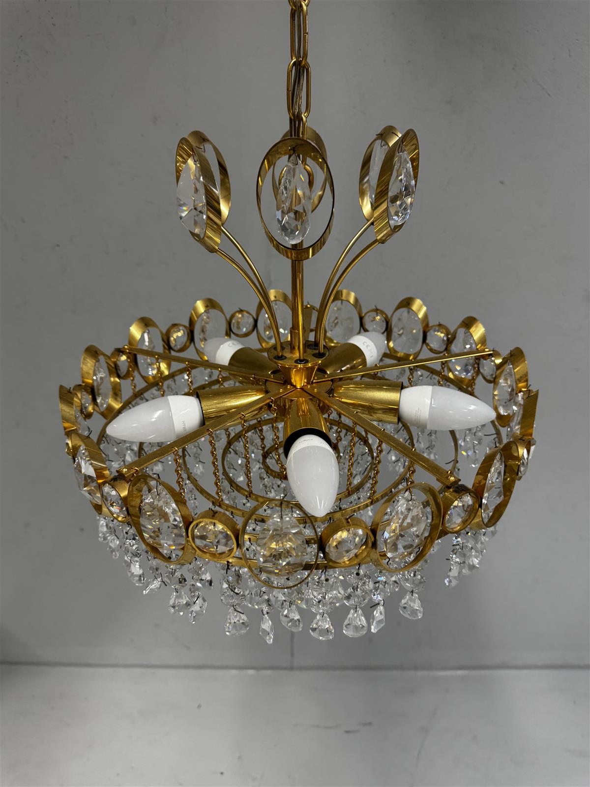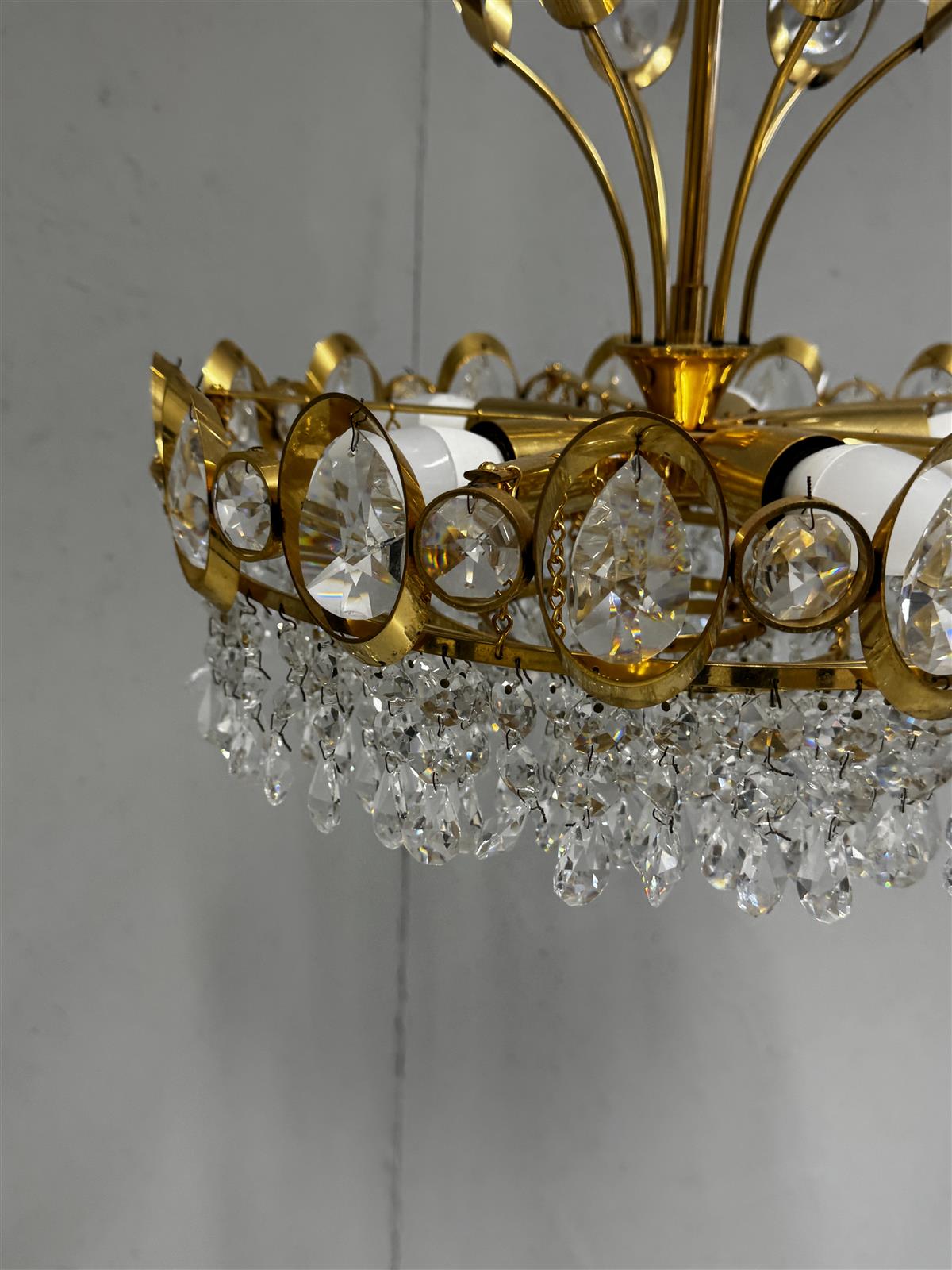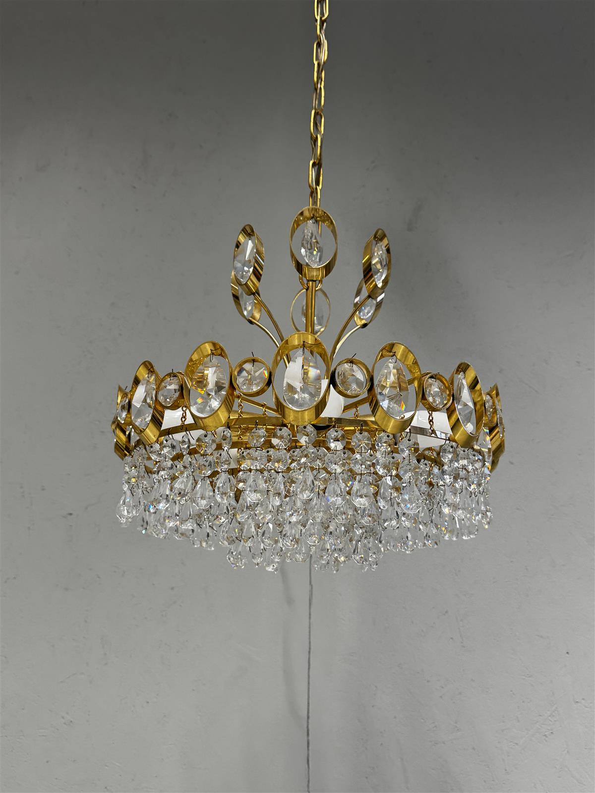 Kattokruunu, jossa on kullanvärinen runko ja useita kristalleja. Valaisimessa on useita valonlähteitä ja se on ripustettu ketjulla kattoon. Mitat ovat noin 40 cm halkaisijaltaan.