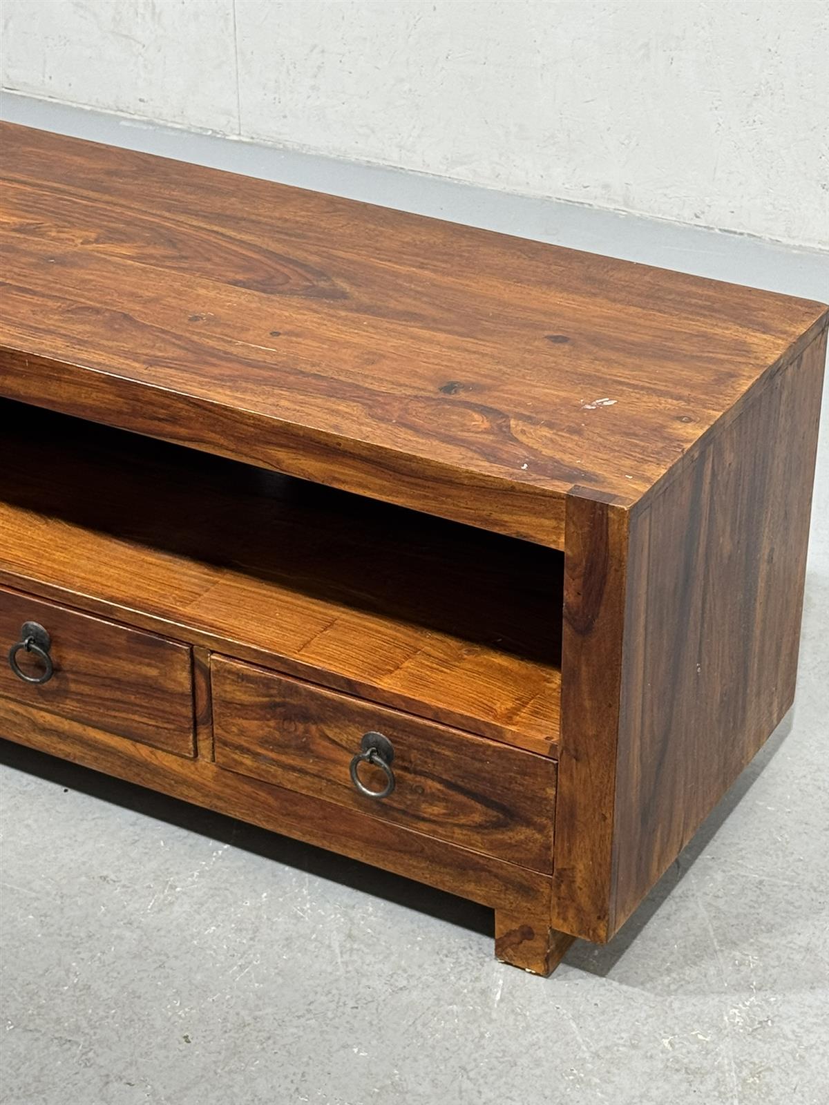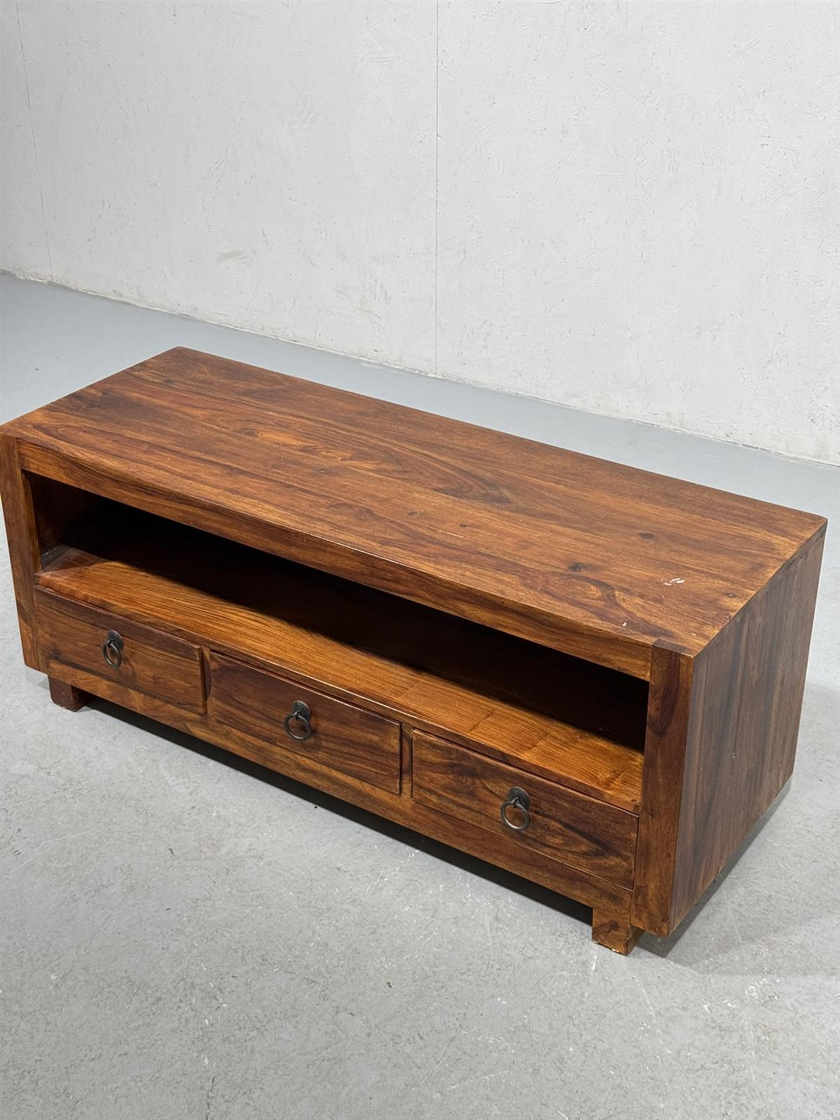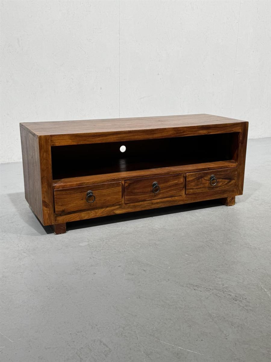 TV-taso, jossa on kolme vetolaatikkoa ja avohylly. Valmistettu akaasiapuusta, mikä antaa sille luonnollisen ilmeen.