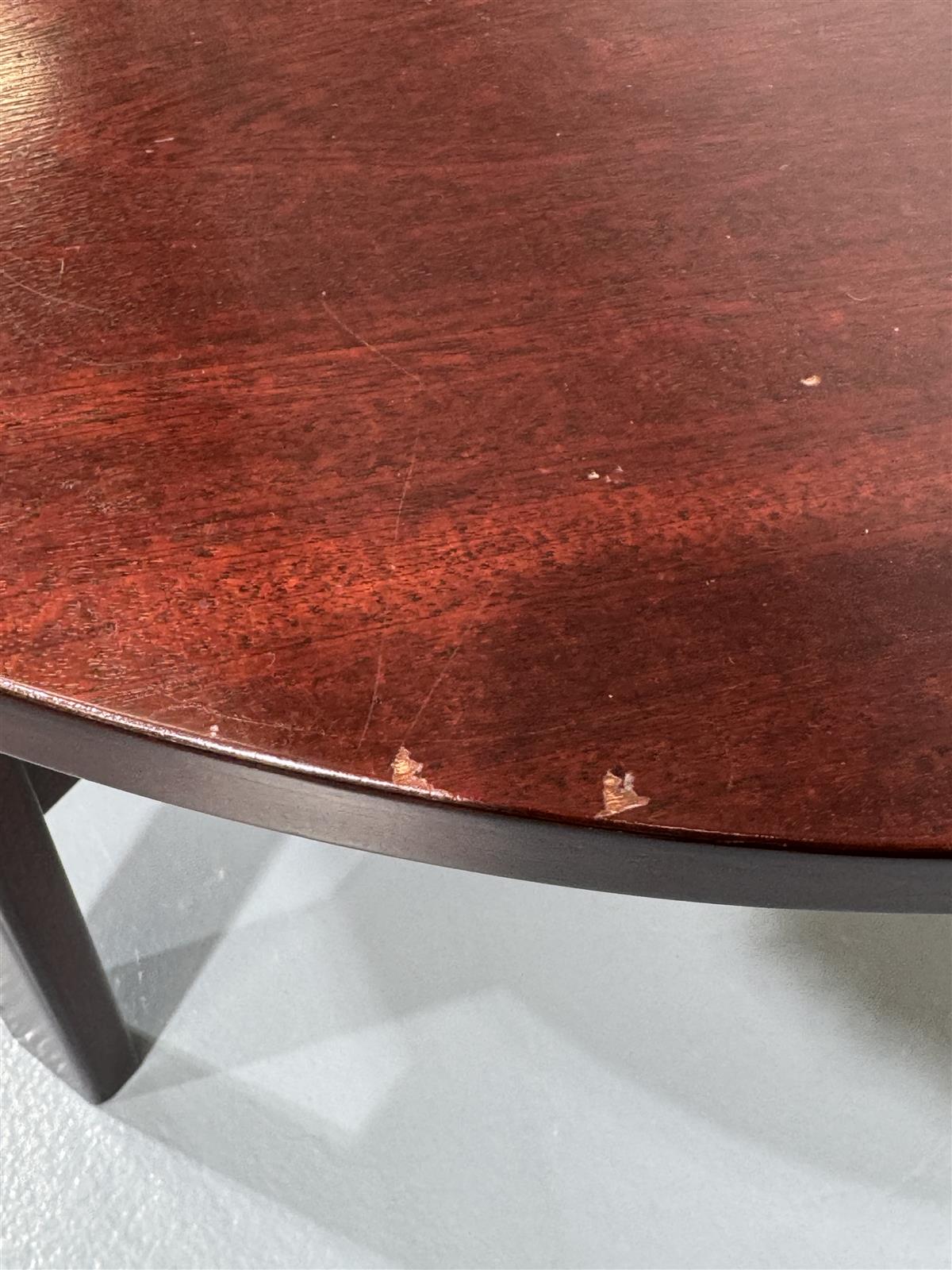Pöydässä on muutamia naarmuja ja pieniä kolhuja reunassa, jotka ovat tyypillisiä käytön jälkiä. Yleiskunto on kuitenkin hyvä, ja pöytä on edelleen käyttökelpoinen ja näyttävä.