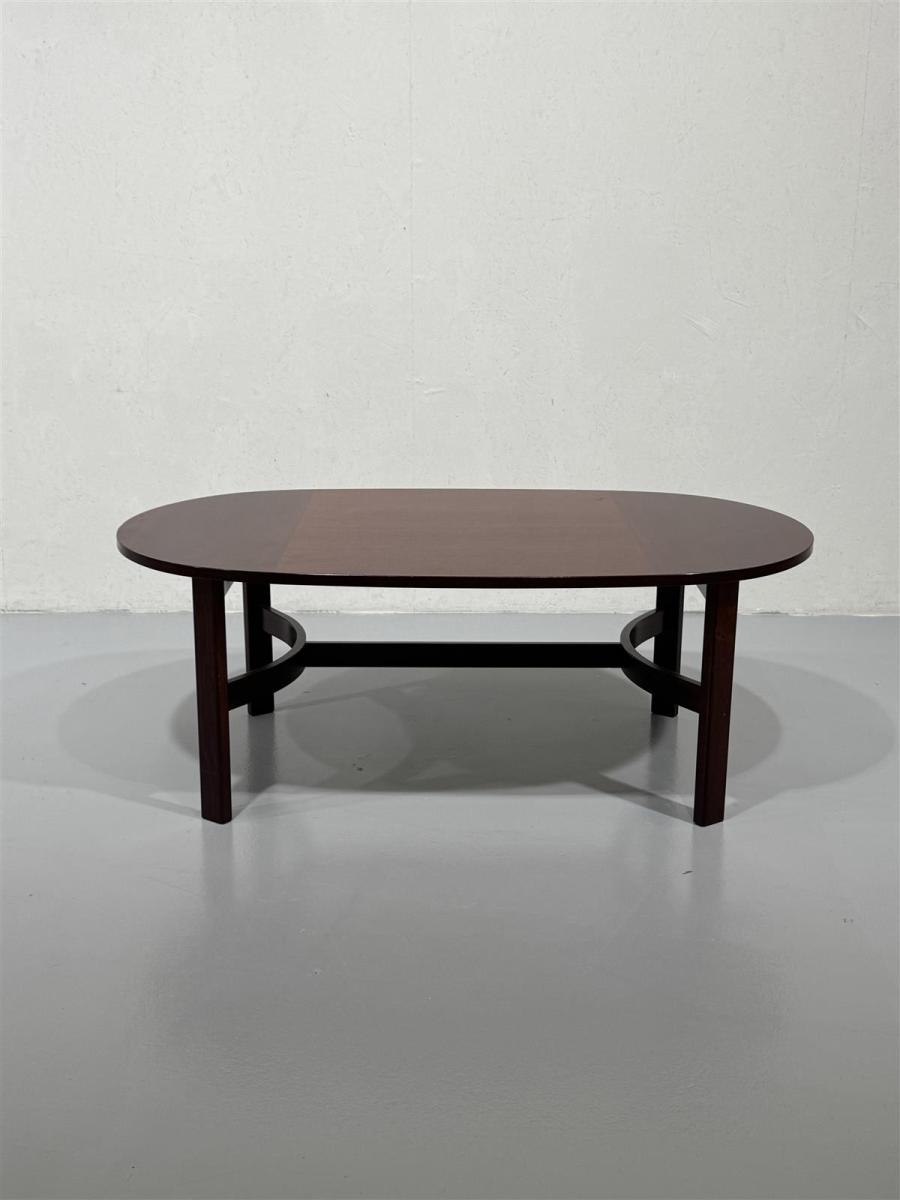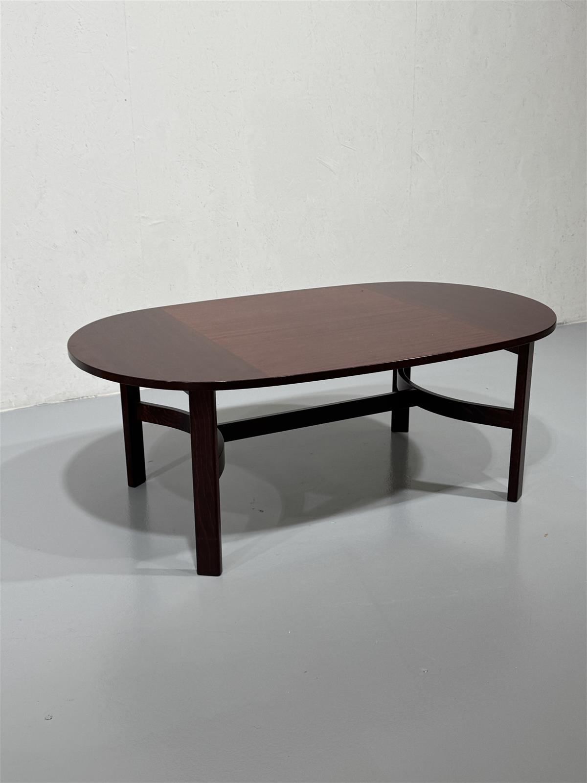 Tyylikäs Ulferts sohvapöytä, jossa on tummanruskea pinta ja ovaali muoto. Pöydän jalat ovat tukevat ja niissä on kaareva tukirakenne, joka lisää vakautta ja visuaalista kiinnostavuutta.