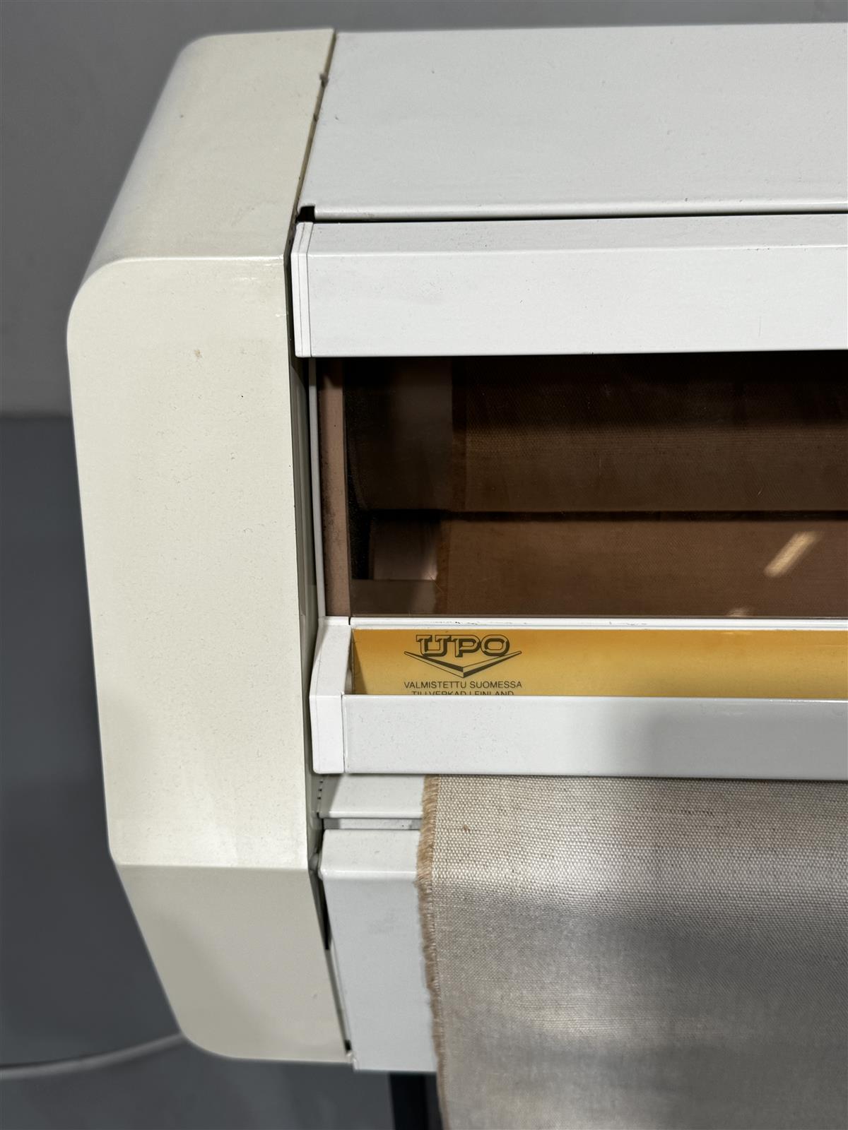 UPO mankelikone, valmistettu Askolle Suomessa. Laite on valkoinen ja siinä on metallinen runko. Mankeli on varustettu kankaalla, joka on kiinnitetty rullien ympärille.