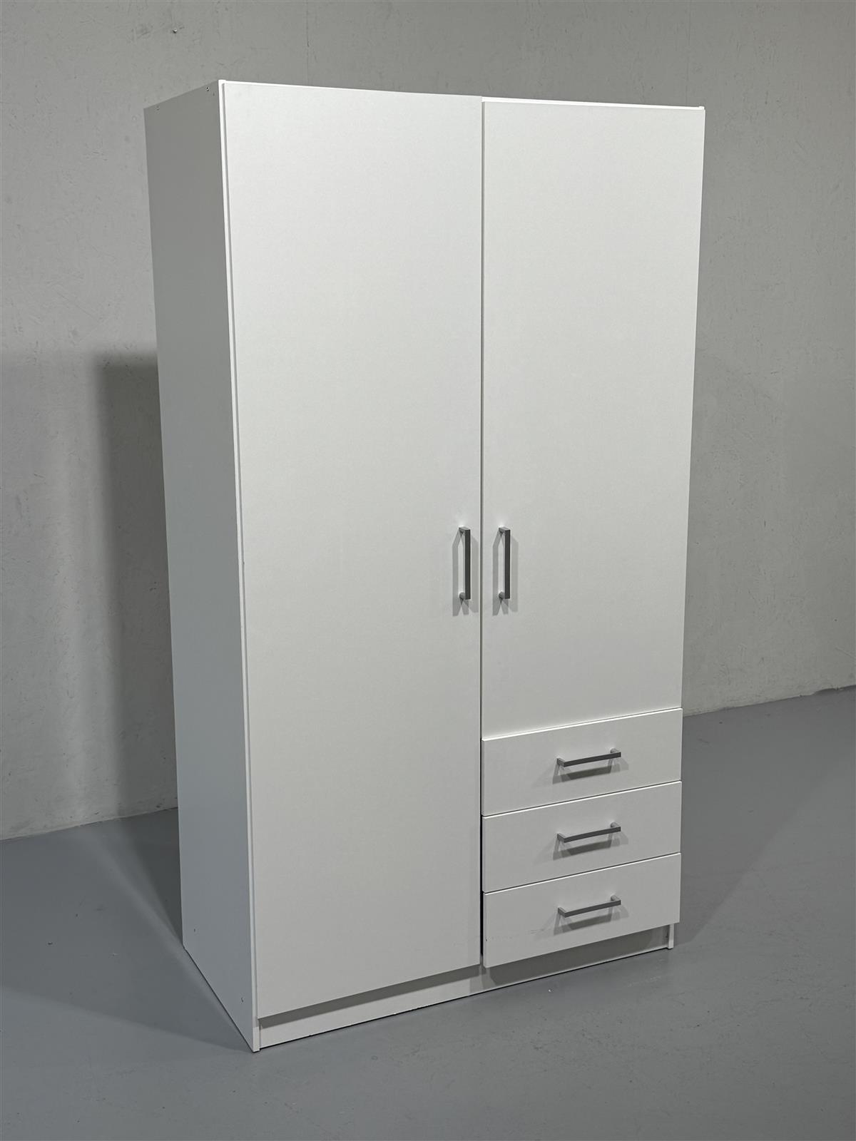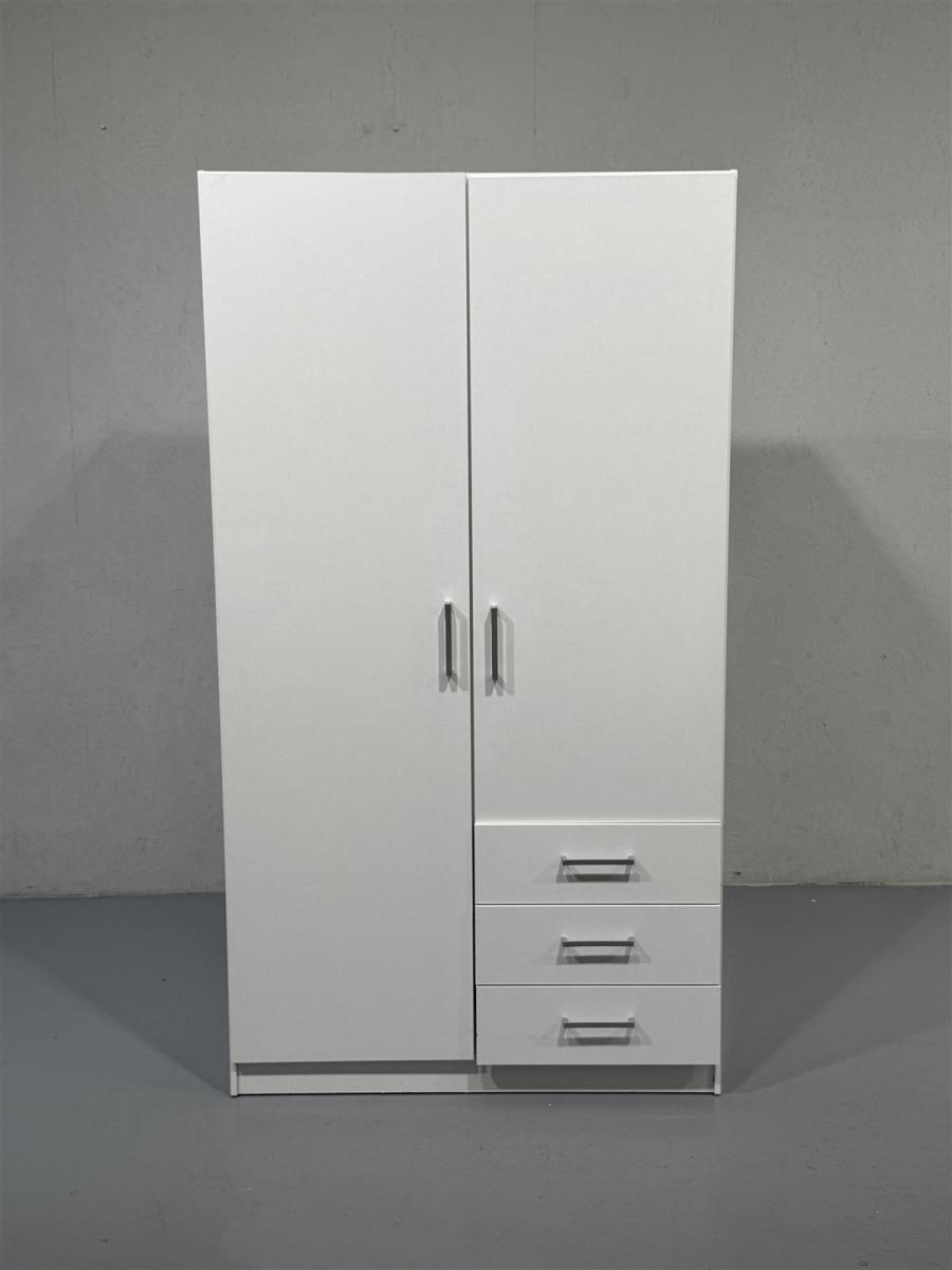 Korkea valkoinen vaatekaappi, jossa on kaksi ovea ja kolme vetolaatikkoa. Sisällä on vaatetanko ja useita hyllyjä, jotka tarjoavat runsaasti säilytystilaa vaatteille ja muille tavaroille.