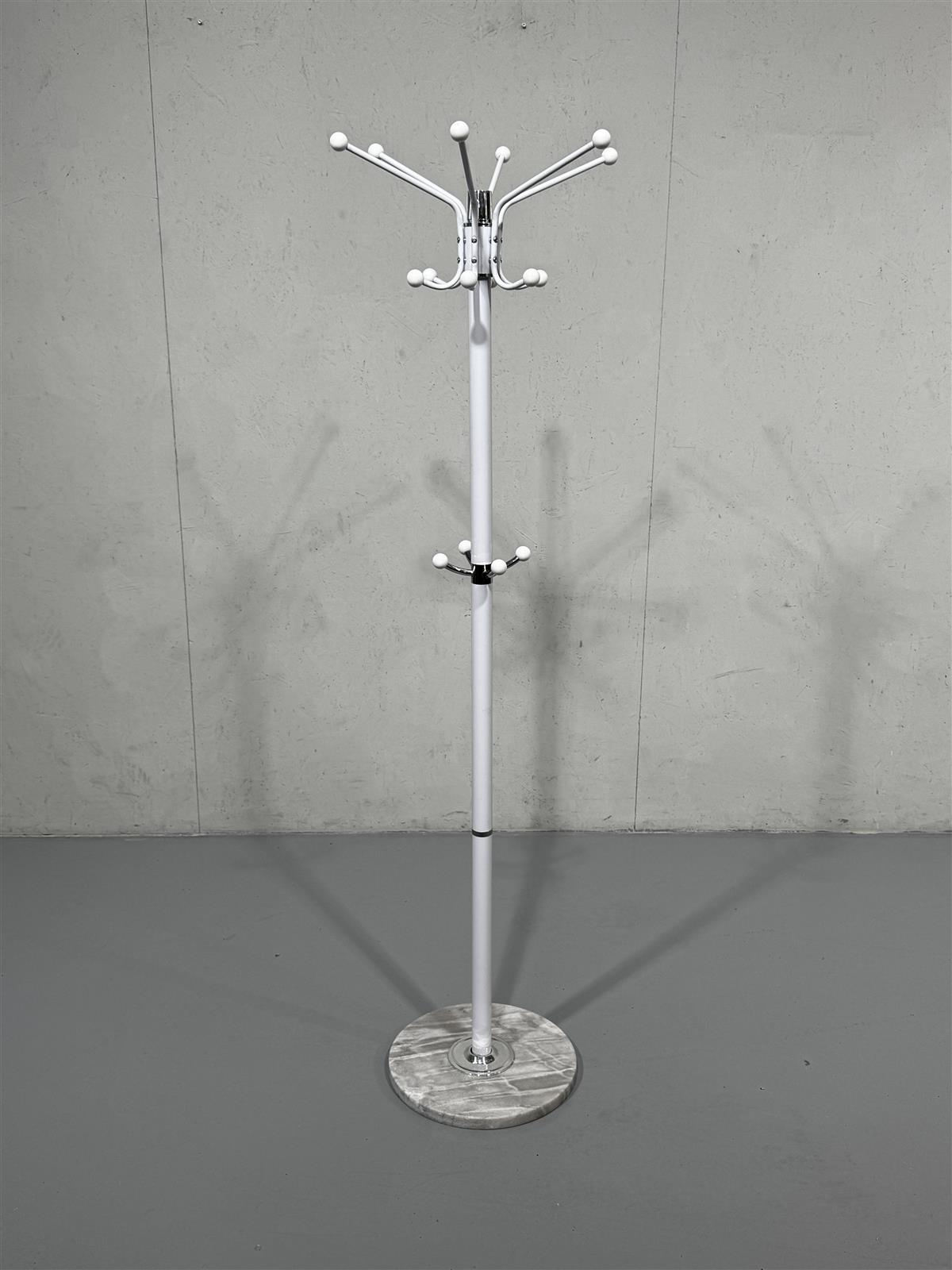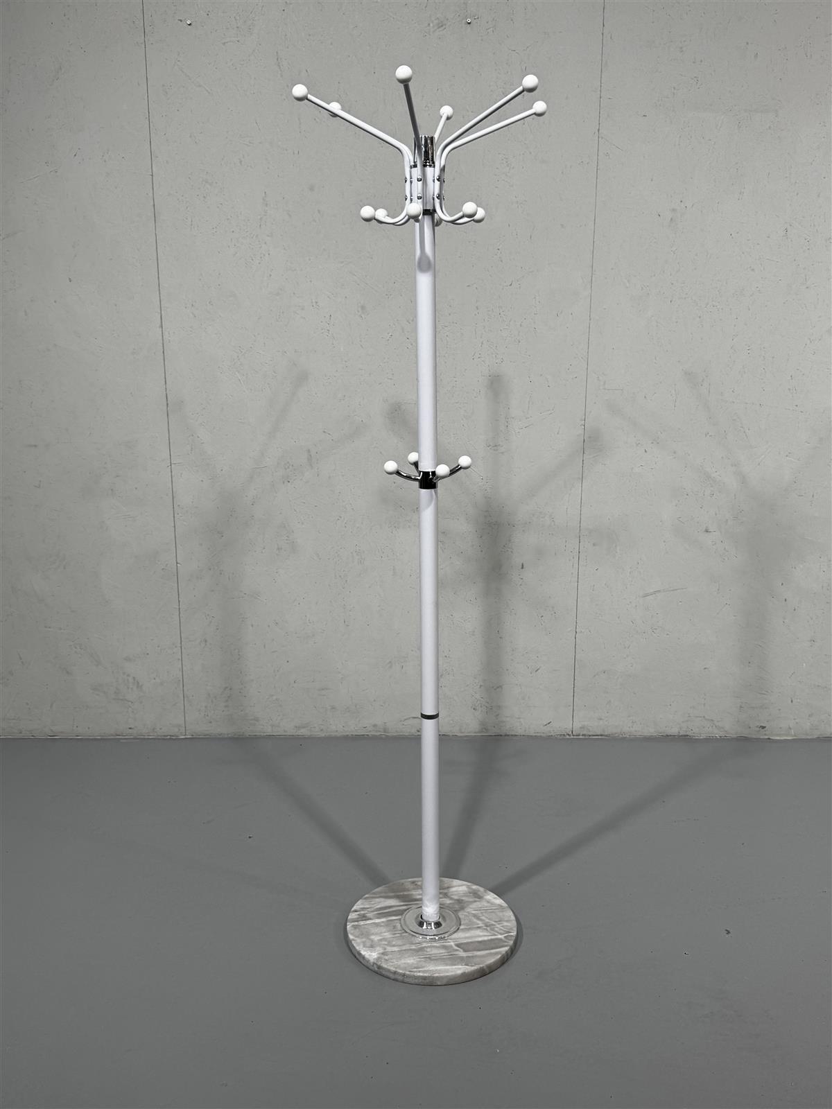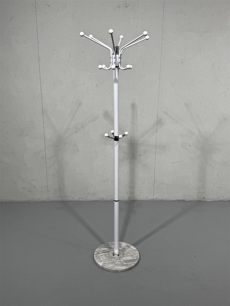 Valkoinen naulakko, jossa on useita koukkuja vaatteiden ripustamiseen. Naulakko seisoo tukevasti pyöreällä marmorijalustalla.