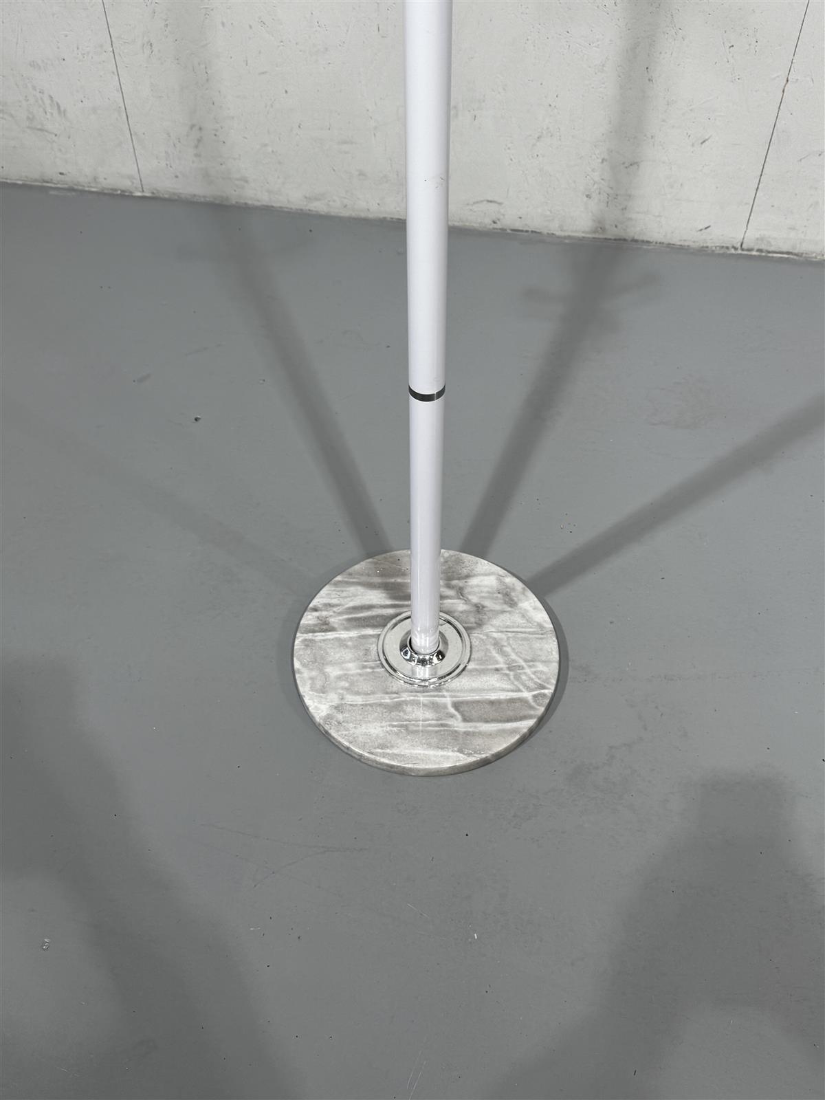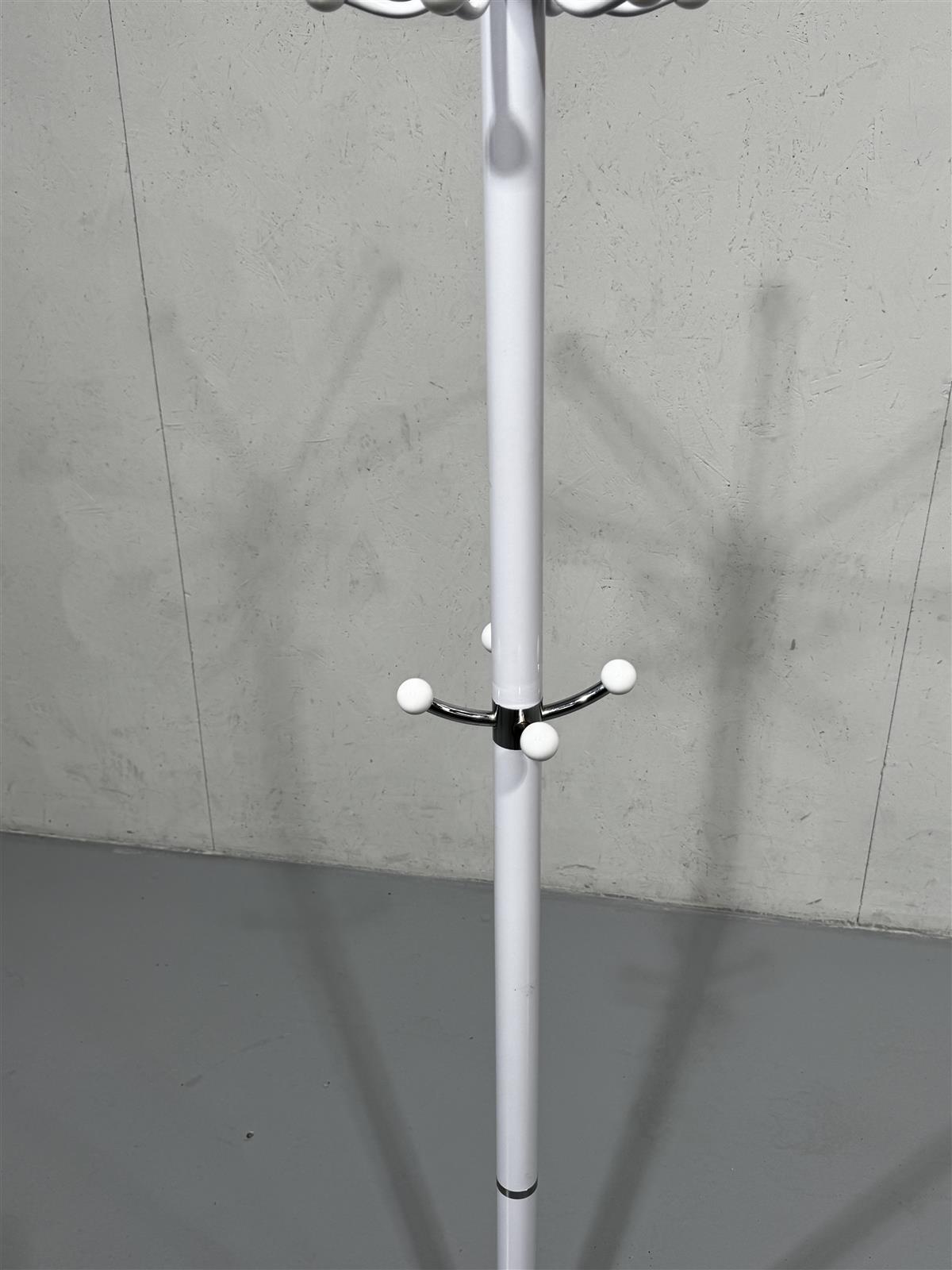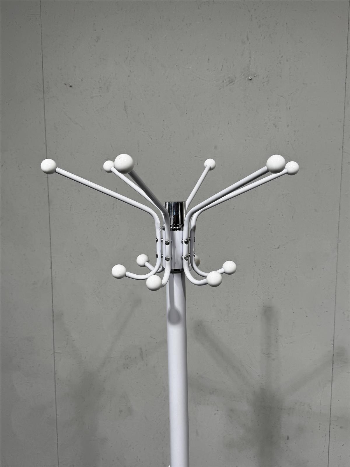Valkoinen naulakko, jossa on useita koukkuja vaatteiden ripustamiseen. Naulakko seisoo tukevasti pyöreällä marmorijalustalla.