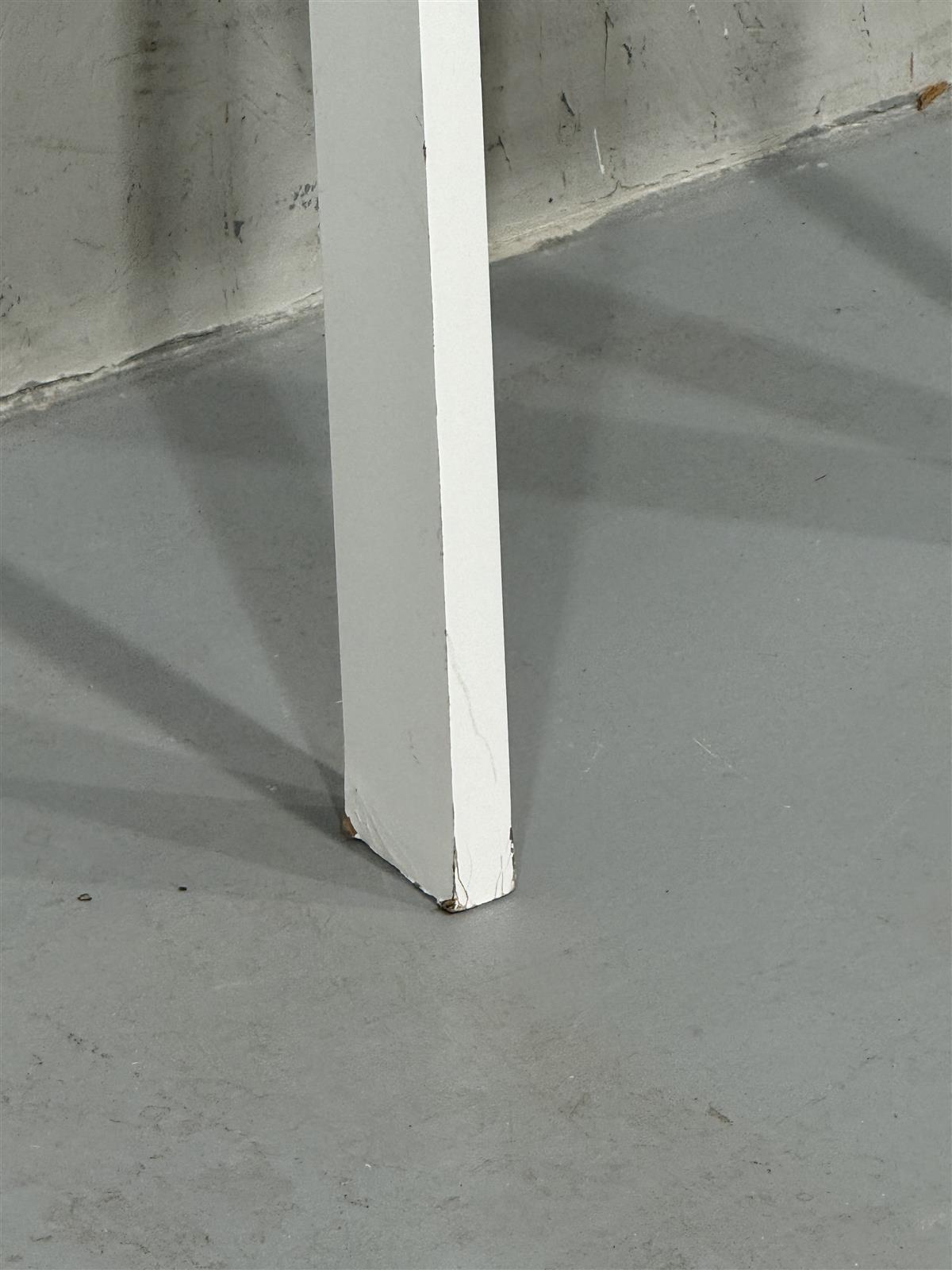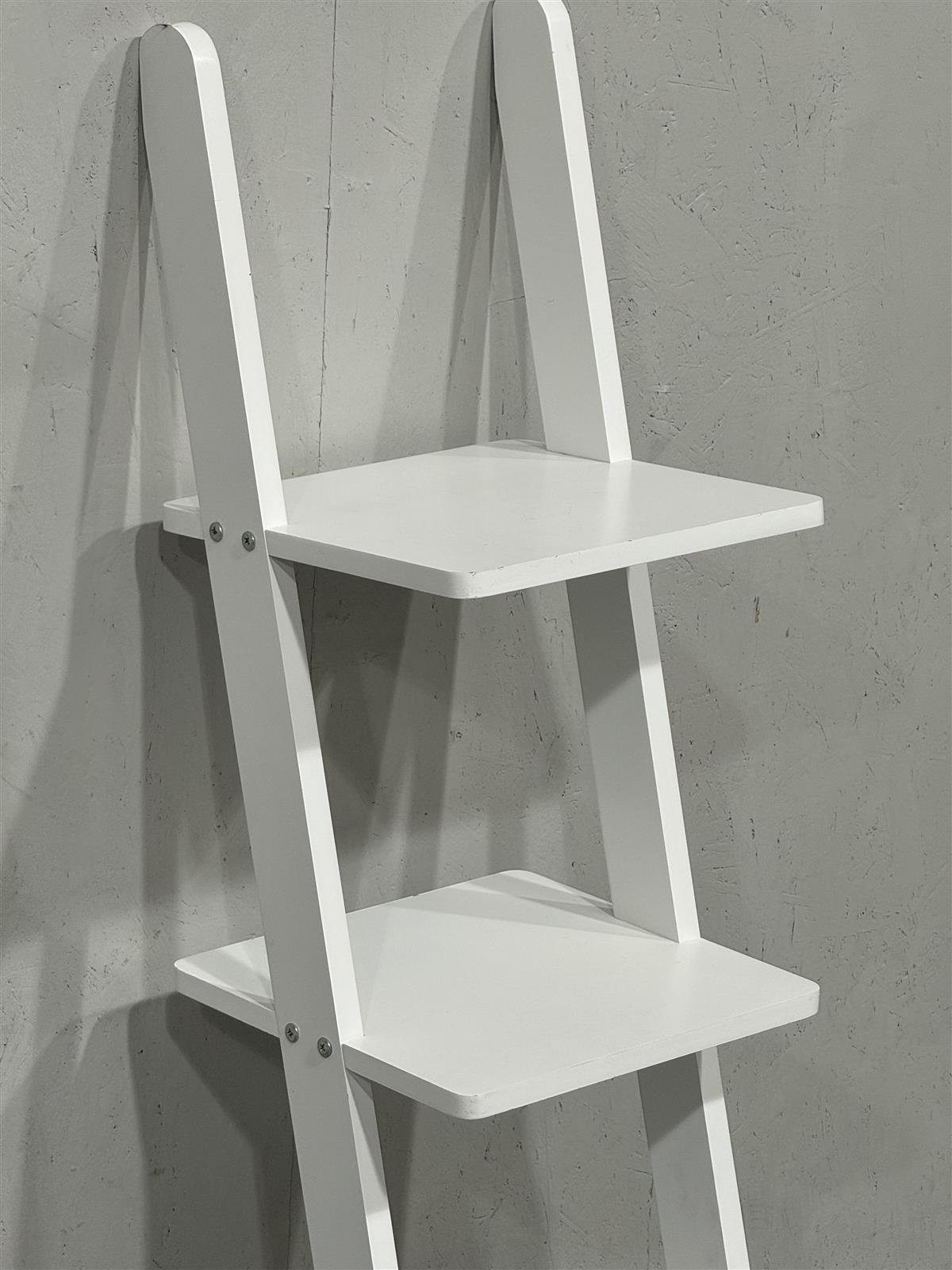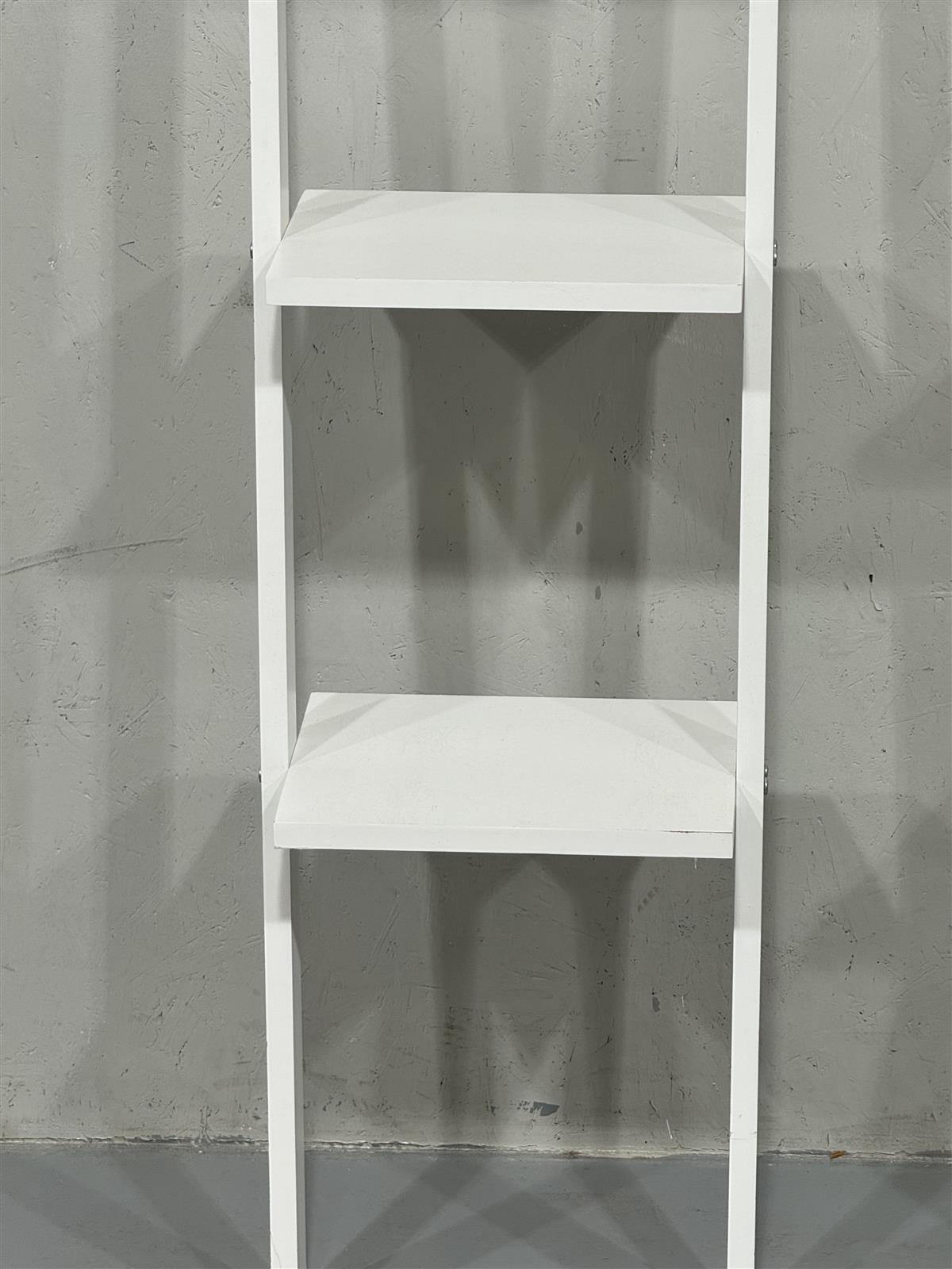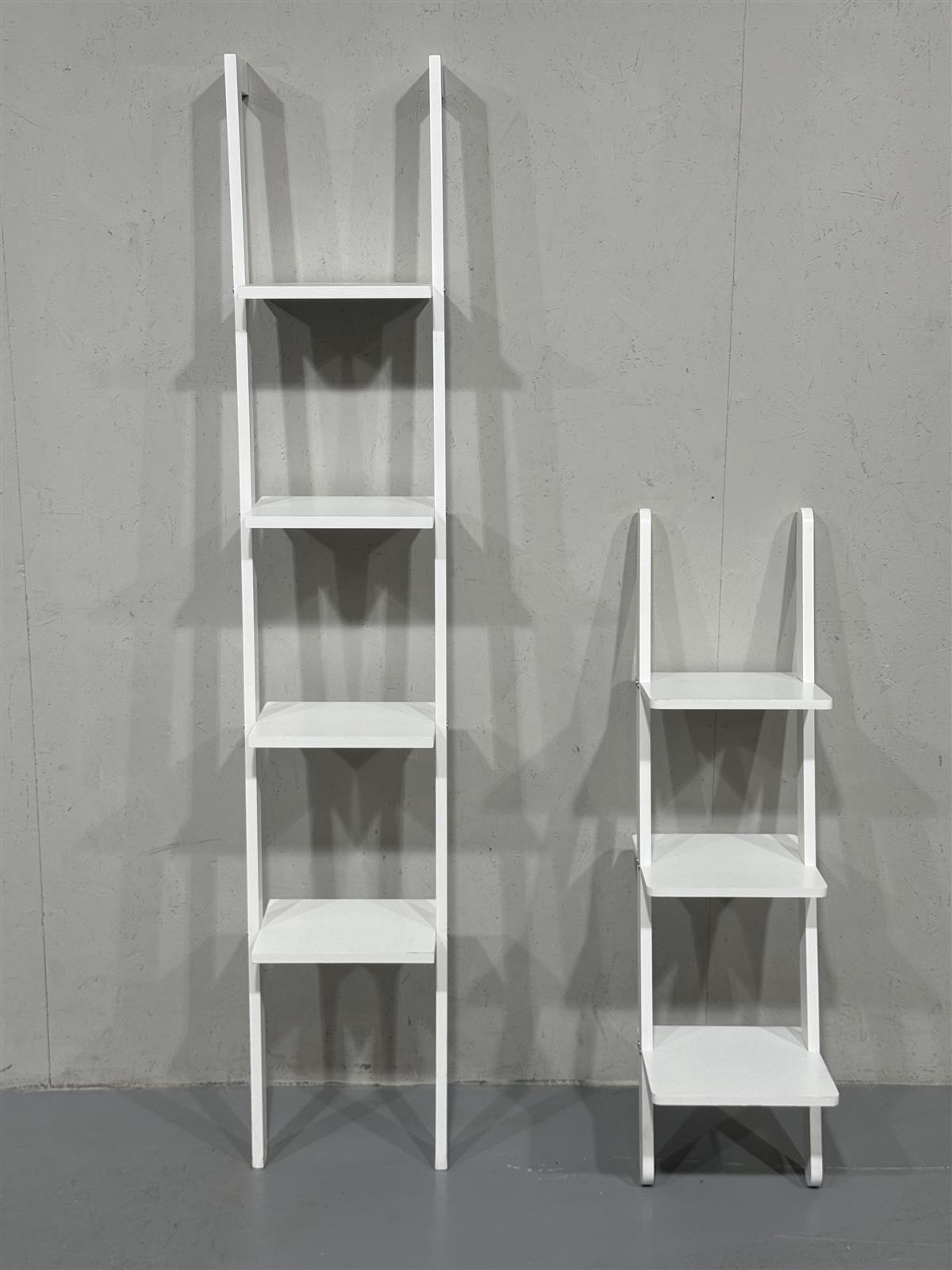 Kaksi valkoista hyllykköä, joissa on useita tasoja. Hyllyköt ovat erikokoisia ja ne nojaavat seinään.