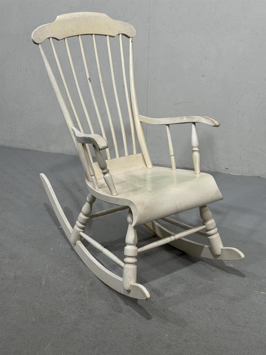 Valkoinen keinutuoli, jossa on korkea selkänoja ja kaarevat jalakset. Tuolissa on käsinojat ja se on suunniteltu mukavaan keinumiseen.