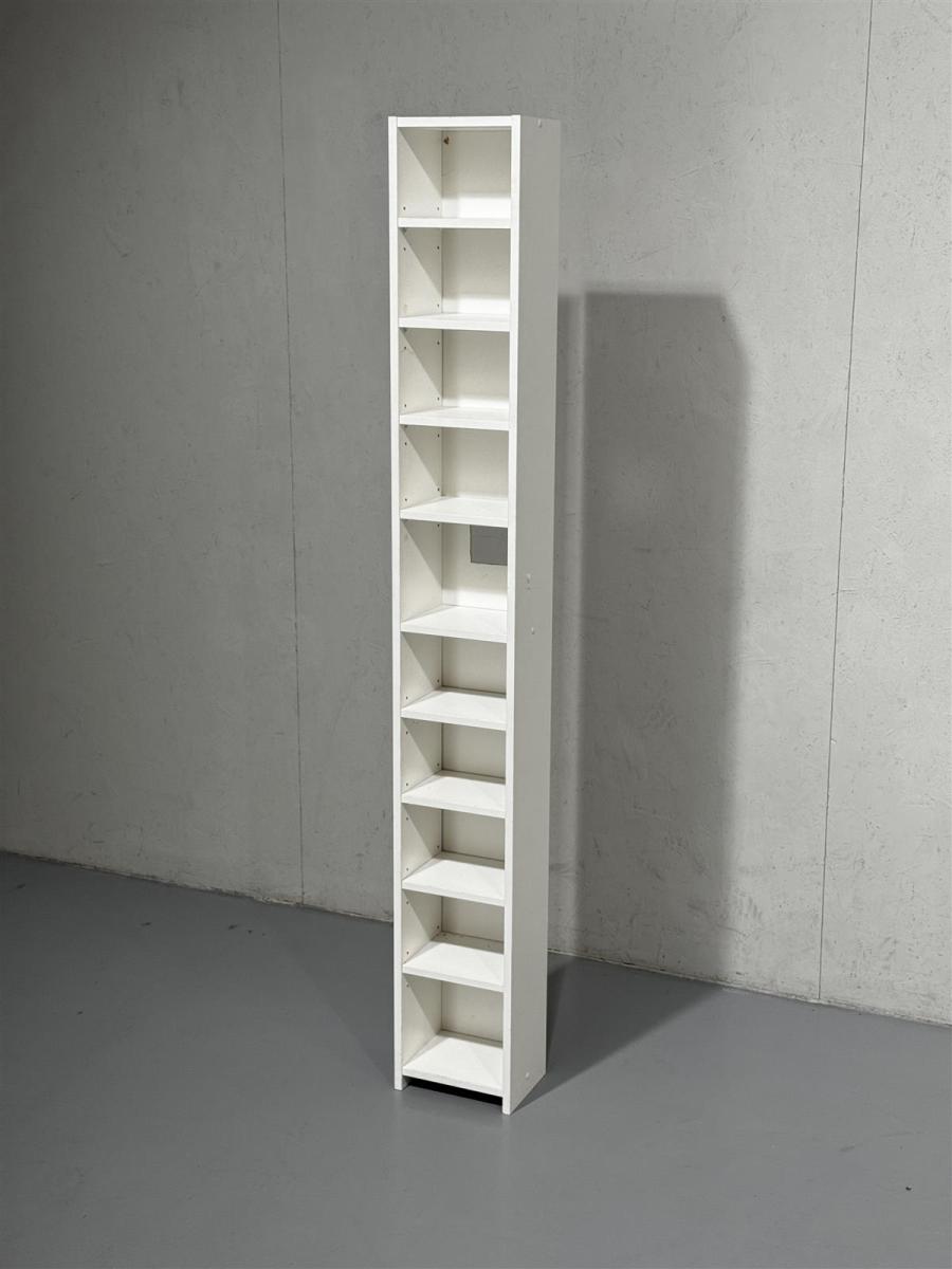 Kapea valkoinen hyllykkö, jossa on useita siirreltäviä hyllytasoa. Hyllykkö on suunniteltu tilaa säästäväksi 23cm tilaan ja se sopii hyvin pieniin tiloihin.