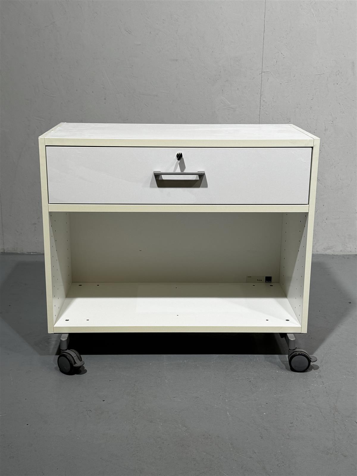Laadukas valkoinen Martelan laatikosto, jossa on yksi vetolaatikko, sisällä jakajia ja avohylly. Laatikosto on varustettu tukevilla pyörillä, mikä helpottaa sen siirtämistä. Valmistaja on Martela, sisältää 2 kpl.