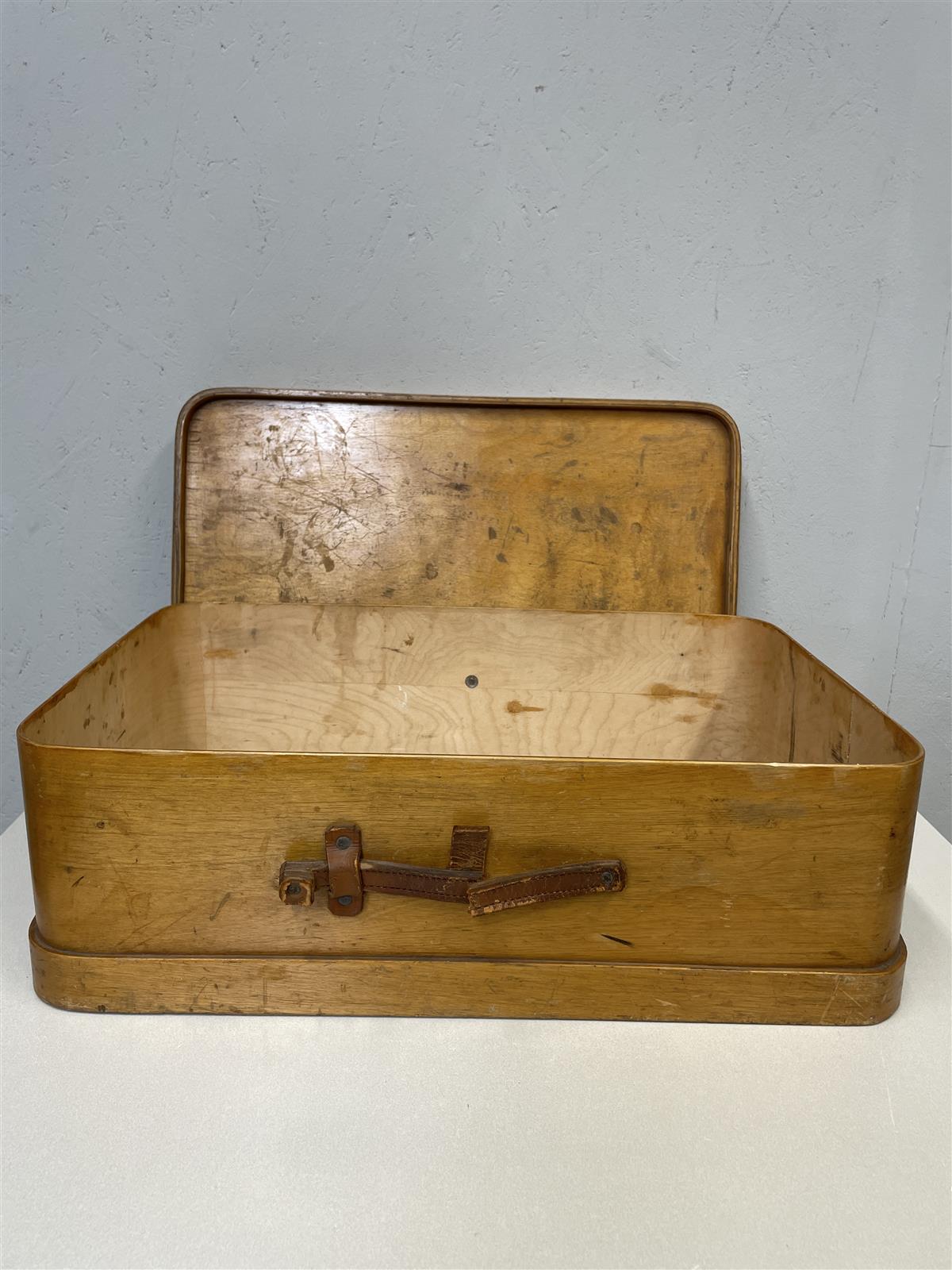 Vanha puinen matkalaukku, jossa on nahkaiset kiinnikkeet. Laukun pinta on kulunut ja siinä on näkyviä naarmuja ja jälkiä käytöstä. Nahkaiset kiinnikkeet ovat hapertuneet ja poikki. Laukun sisäpuoli on siisti, mutta siinä on muutamia pieniä tahroja ja kulumajälkiä. Kannen sisäpuolella tussikirjoitusta.
