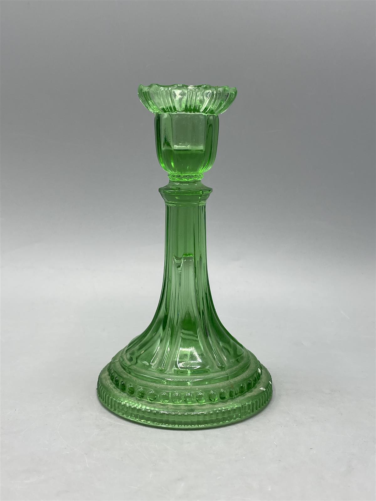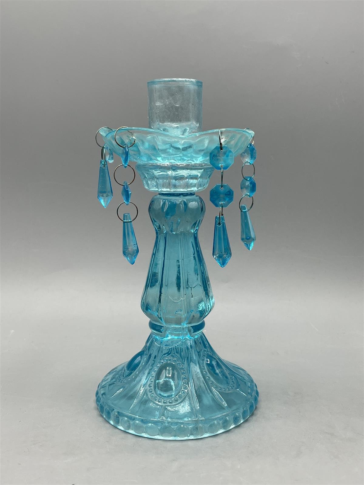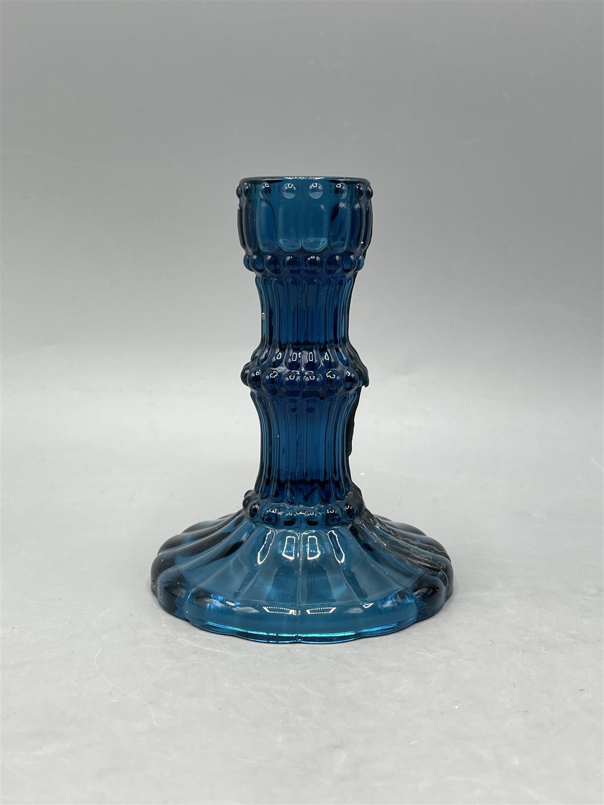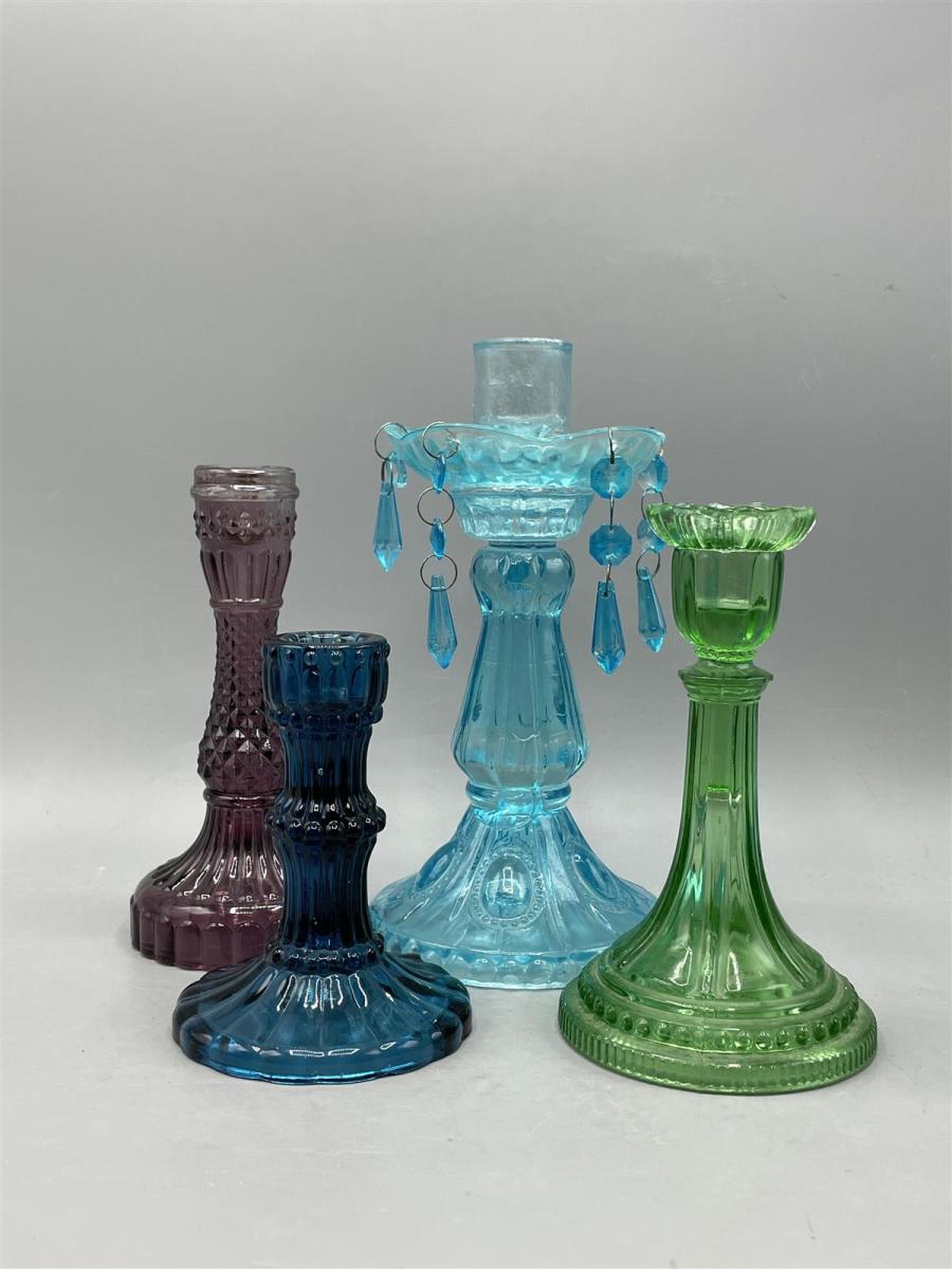 Neljä eriväristä ja kokoista kynttilänjalkaa, joista yksi on koristeltu sinisillä riippuvilla koristeilla. Kynttilänjalat ovat eri muotoisia ja niissä on koristeellisia yksityiskohtia.