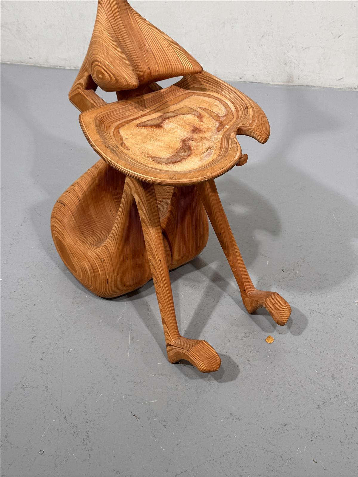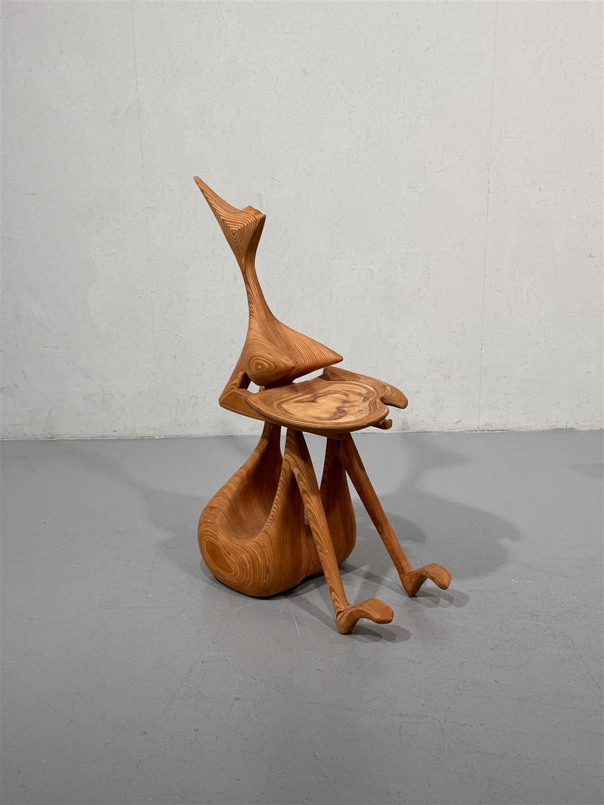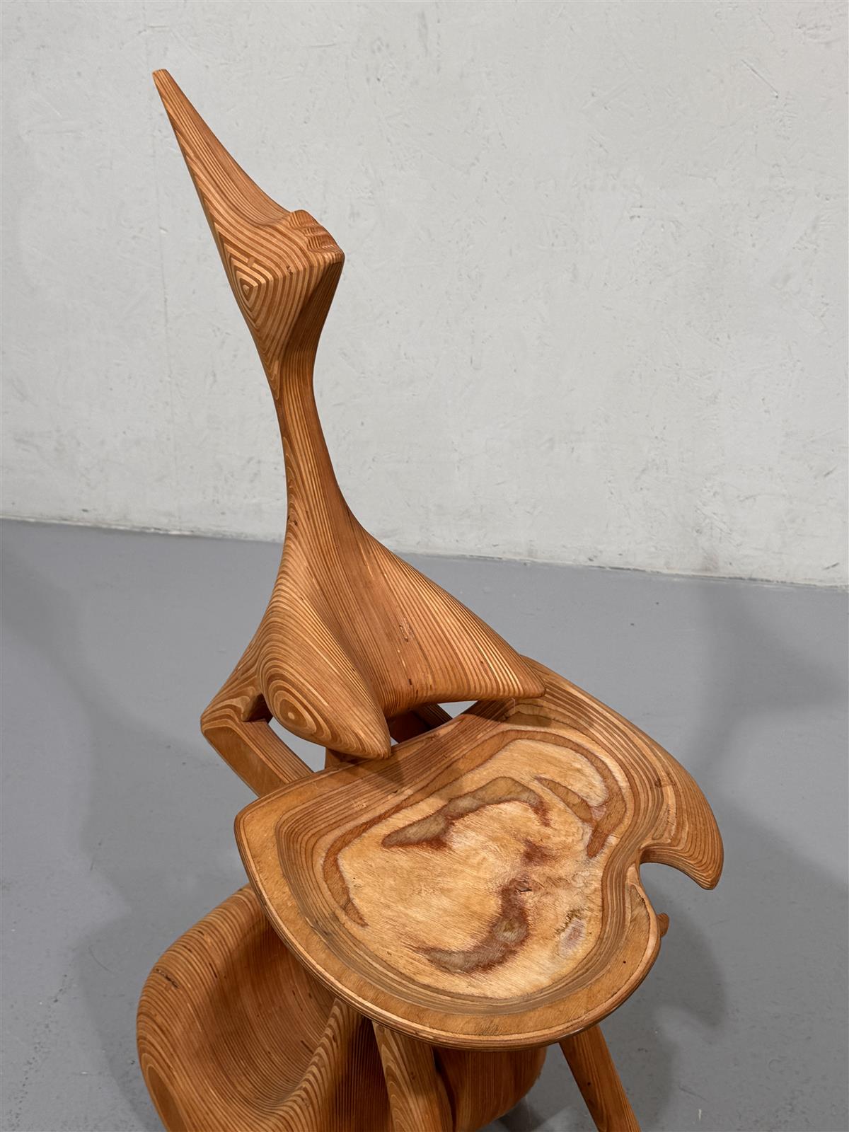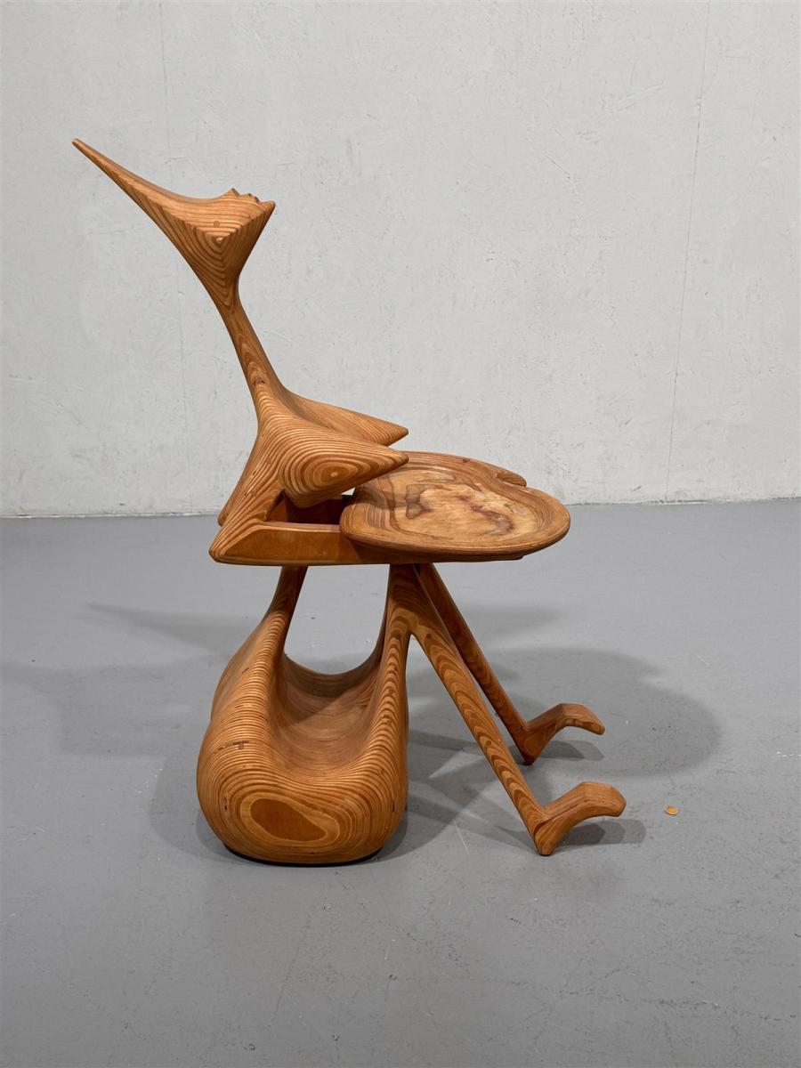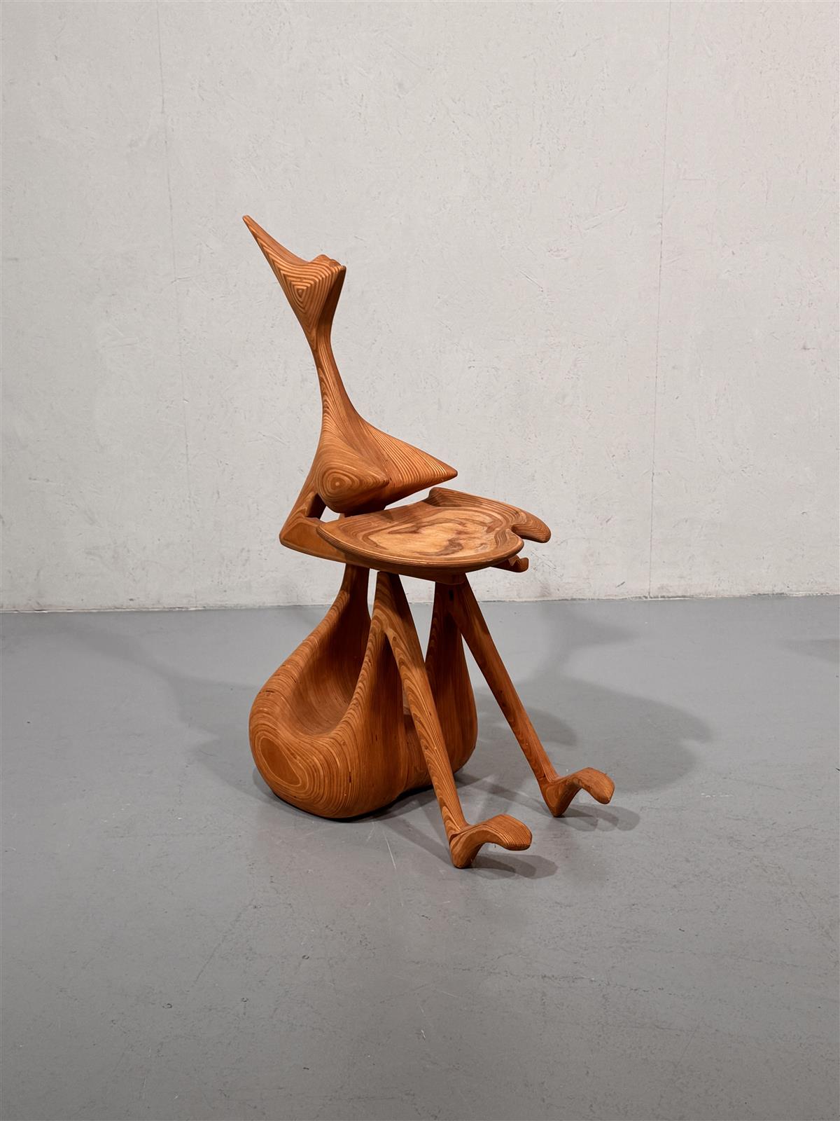 Veistoksellinen mäntypuusta tehty tarjoilutaso, joka on valmistettu kauniisti muotoillusta puusta. Sen ainutlaatuinen muotoilu tekee siitä erottuvan sisustuselementin, joka herättää huomiota missä tahansa tilassa. Tuolin muotoilu on moderni ja futuristinen, mikä tekee siitä mielenkiintoisen keskustelunaiheen vieraille. Tekijä tuntematon