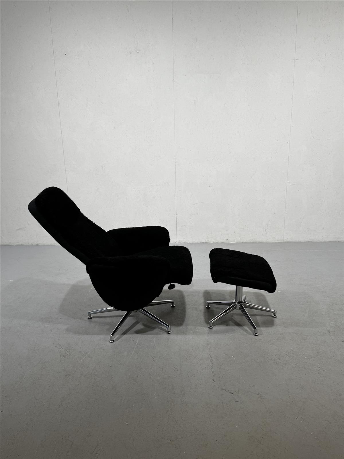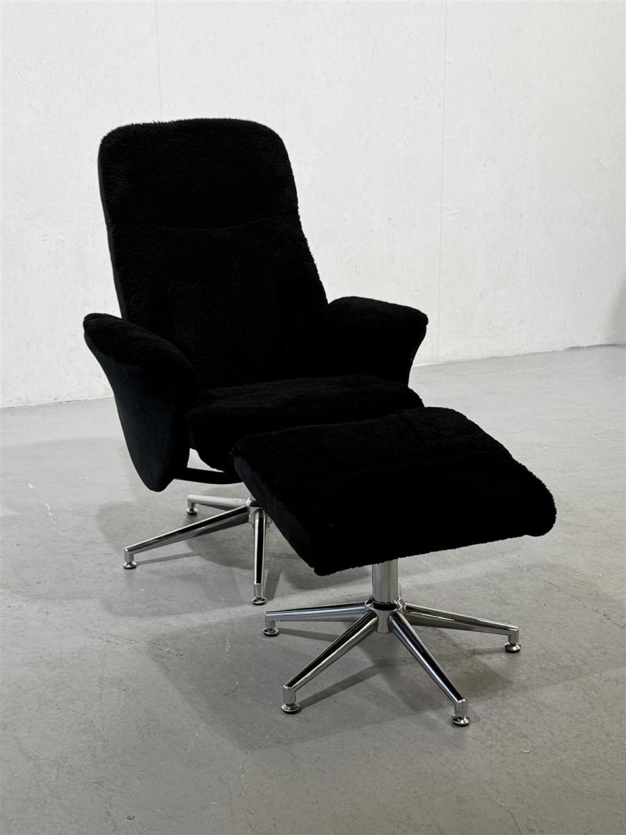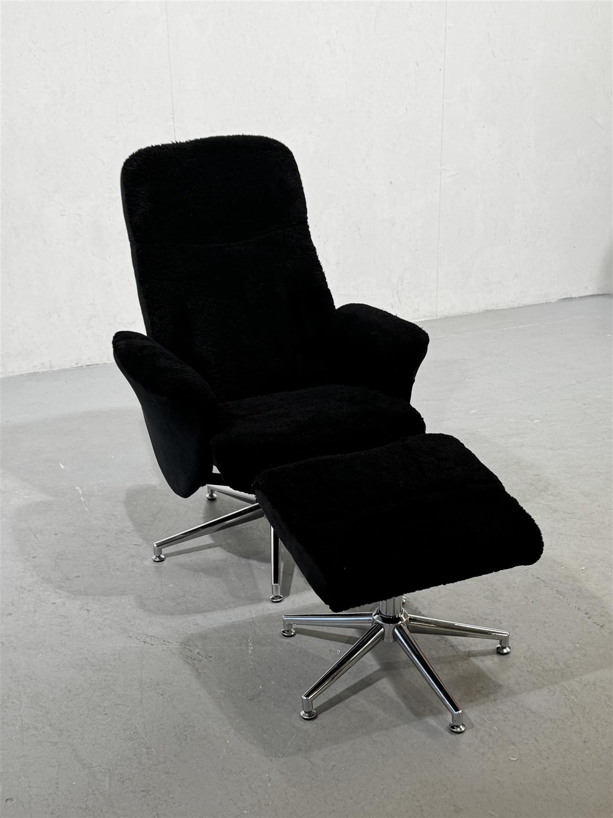 Venture design Rolf mekanismituoli rahilla. Musta teddykankainen nojatuoli ja rahi, joissa on pehmeä verhoilu ja metalliset jalat. Nojatuolin selkänojan saa taitettua hieman taakse mukavaan lepoasentoon. Moderni retrotyyli yhdistyy mukavuuteen ja käytännöllisyyteen.