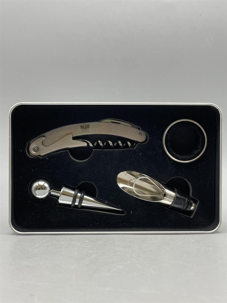 PM-International viinisetti, joka sisältää korkkiruuvin, viinikaatimen, pullon sulkijan ja tipparenkaan.