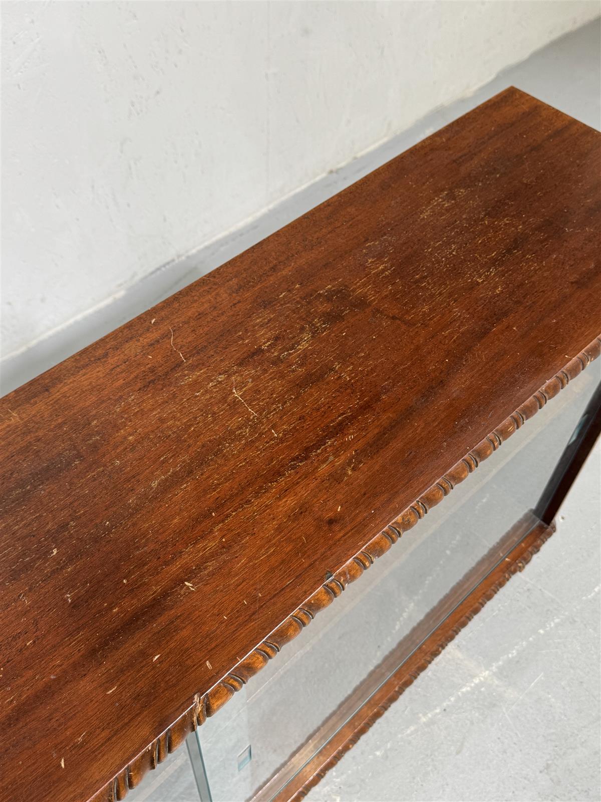 Tyylikäs 50-luvun vitriinikaappi, jossa on liukuvat lasiovet ja koristeelliset jalat. Kaapissa on kaksi hyllyä, jotka tarjoavat runsaasti säilytystilaa astioille tai koriste-esineille. Yksi tason tukitappi puuttuu sisältä, helppo vaihtaa.