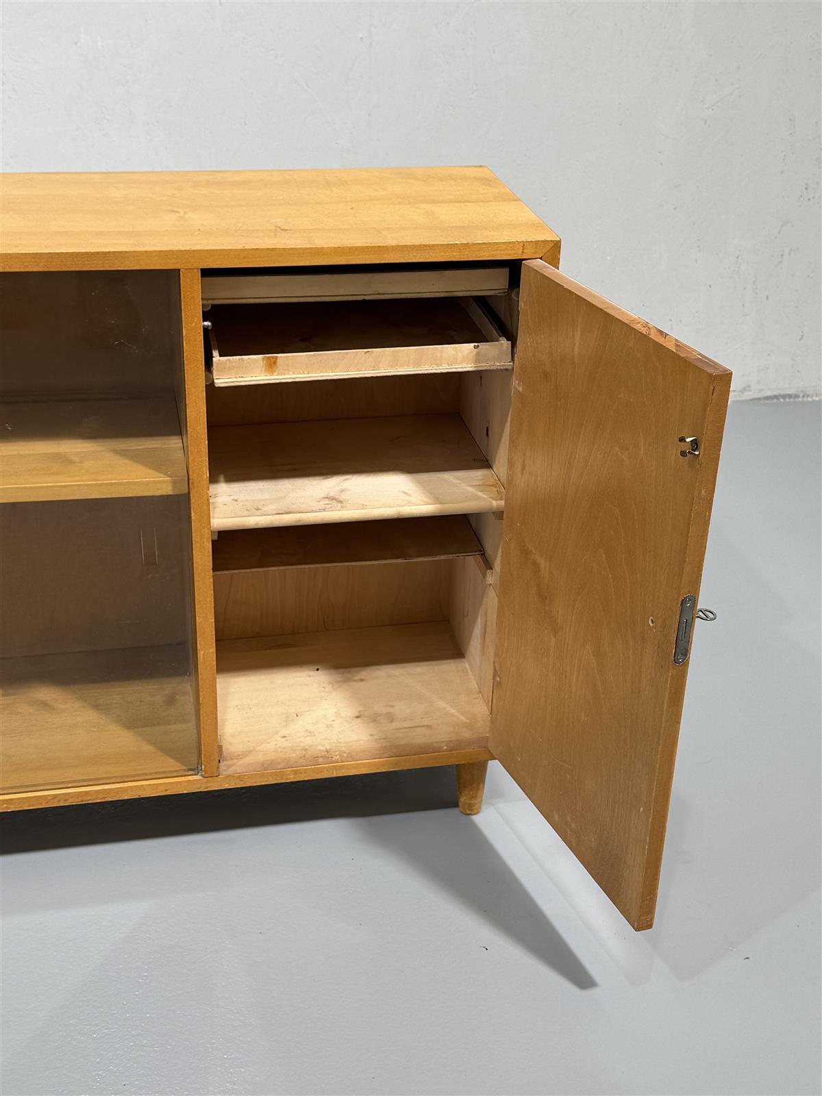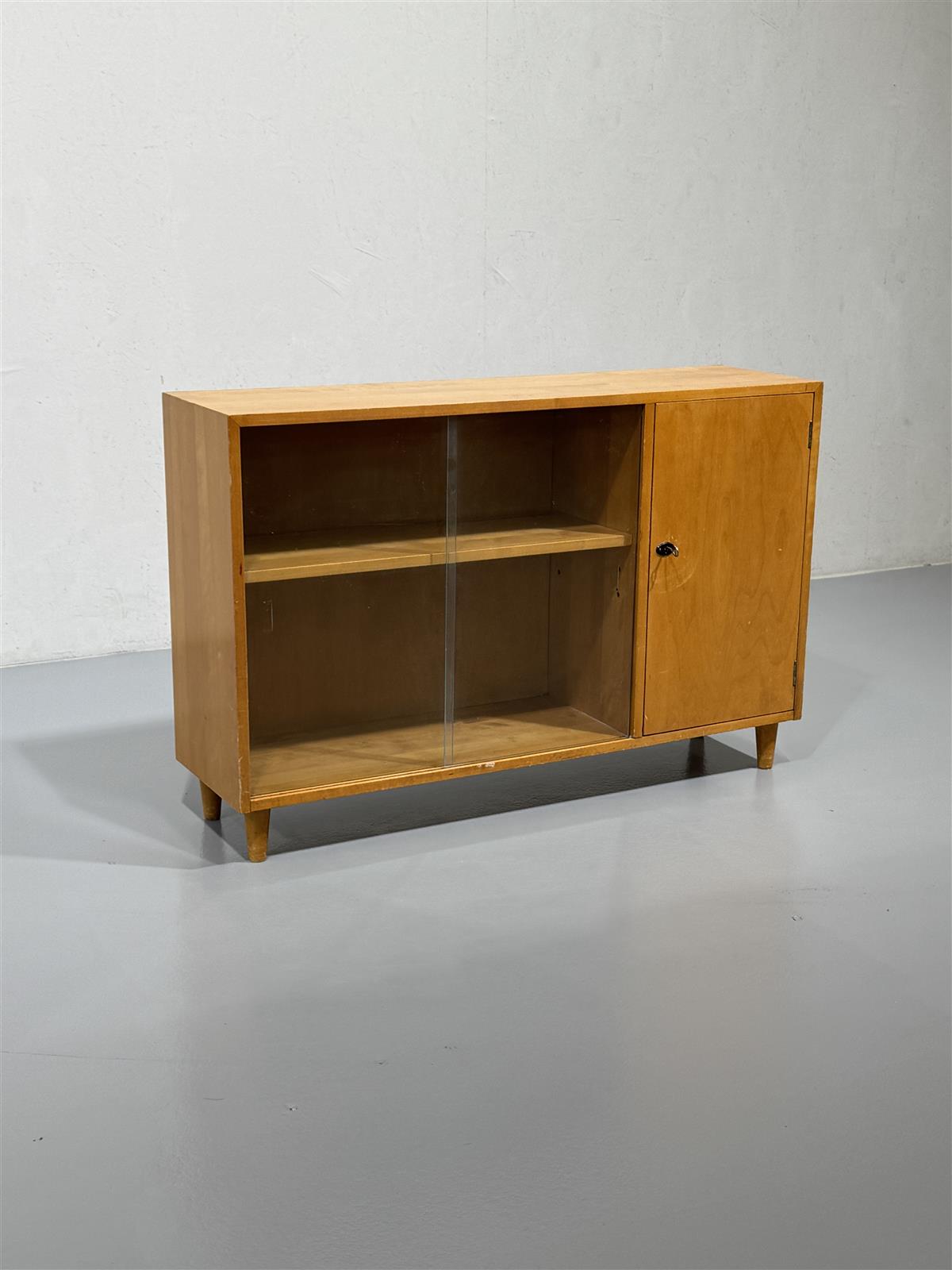 Tyylikäs 60-luvun kaappi, jossa on lasiovet ja vaaleapuinen runko. Kaapissa on yksi lukollinen puuovi, lasiset liukuovet ja avohylly, mikä tekee siitä käytännöllisen säilytysratkaisun. Sen yksinkertainen muotoilu ja puun sävy tuovat lämpöä tilaan.
