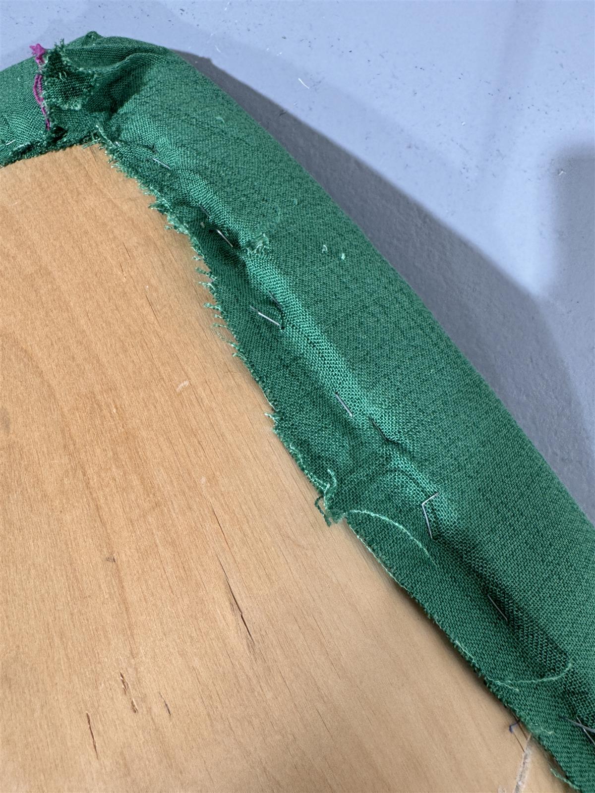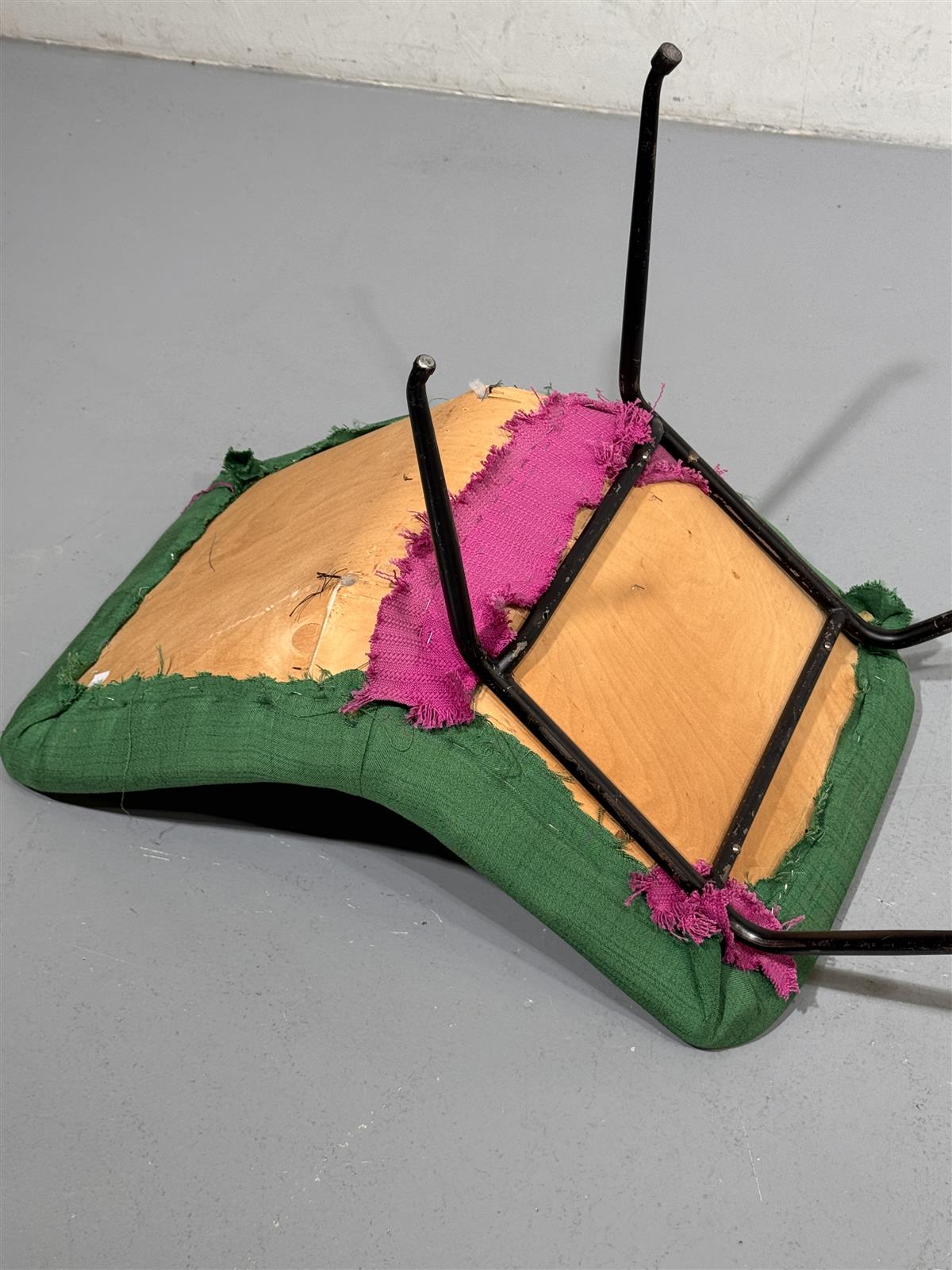 Tuolin kangas on kulunut ja se ei peitä koko tuolia, suositellaan uudelleenverhoilu. Metallijaloissa on kulumaa ja naarmuja, mikä kertoo käytön jäljistä.