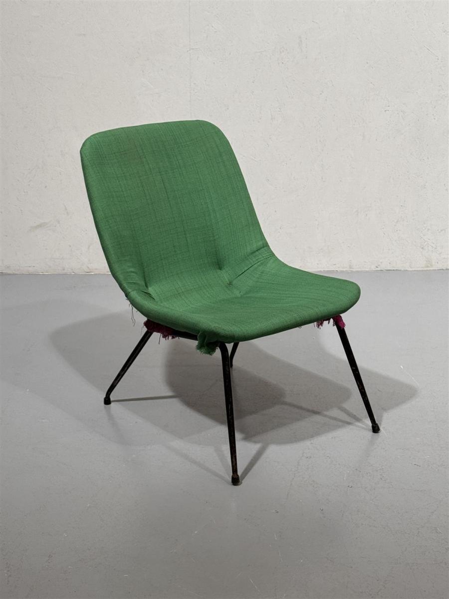 Tyylikäs arviolta 50/60-luvun tuoli, jossa on vihreä kangasverhoilu ja mustat metallijalat.