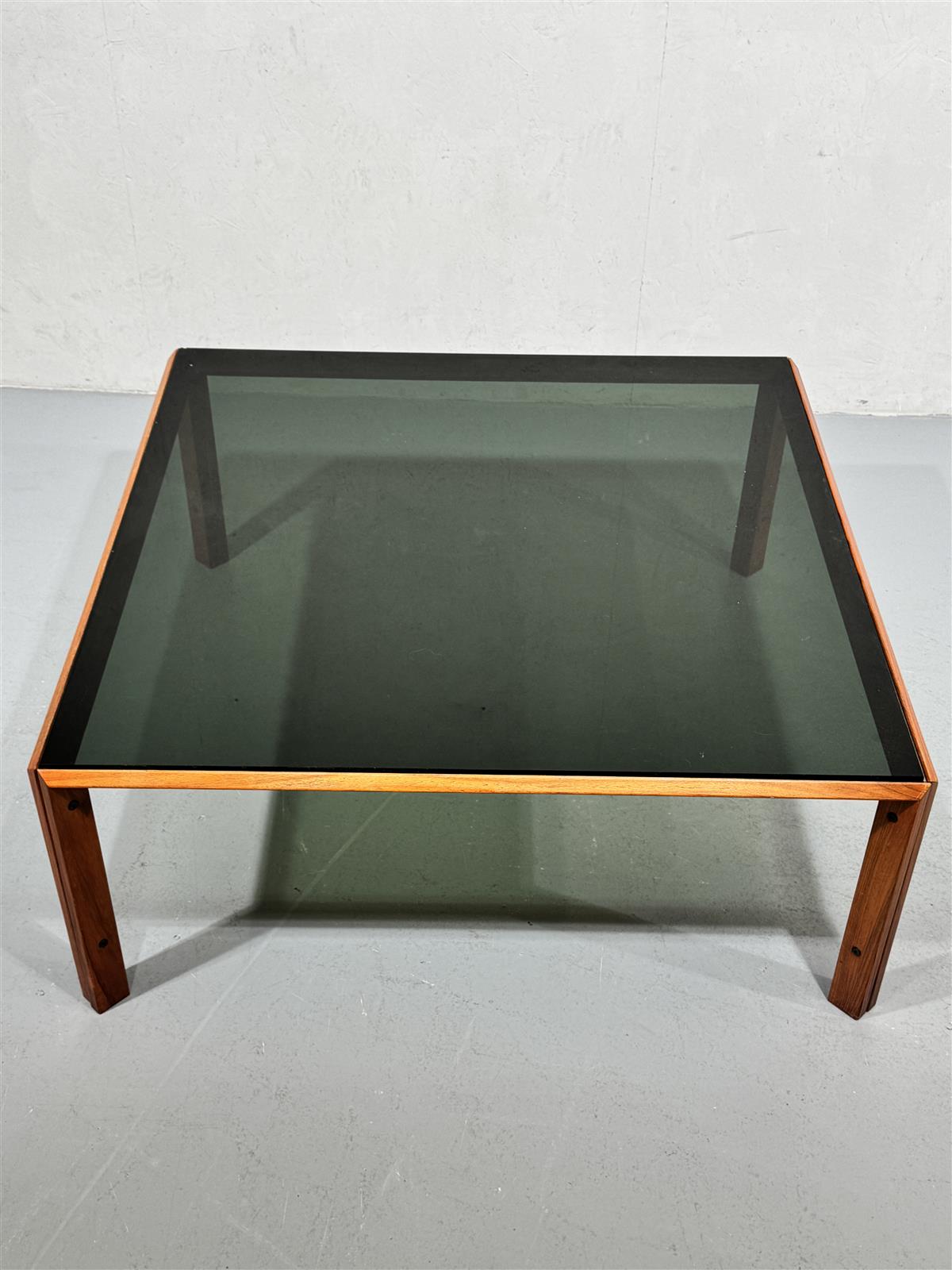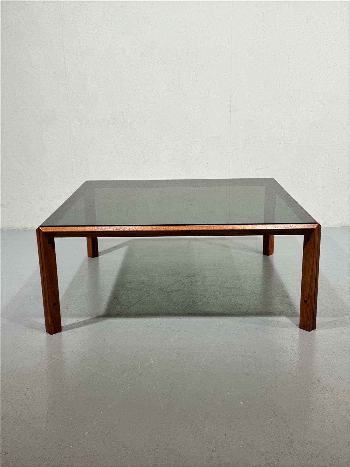 Tyylikäs 70-luvun sohvapöytä, jossa on tumma savulasinen pöytälevy ja tiikkipuu runko. Pöydän muotoilu on yksinkertainen ja ajaton, mikä tekee siitä monikäyttöisen sisustuselementin moneen tilaan. Lasipinta tuo keveyttä ja modernia ilmettä, kun taas puurunko lisää lämpöä ja luonnonläheisyyttä.