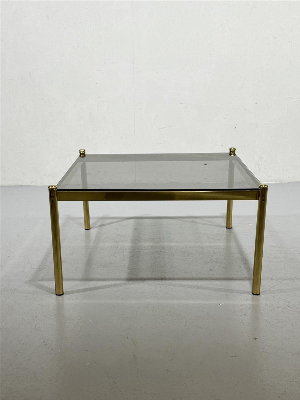 Tyylikäs vintage 70-luvun sohvapöytä, jossa on savulasinen pöytälevy ja messinkiset / kultaiset jalat. Pöydän kulmissa on koristeelliset metallinupit, jotka tuovat lisää ilmettä kokonaisuuteen.