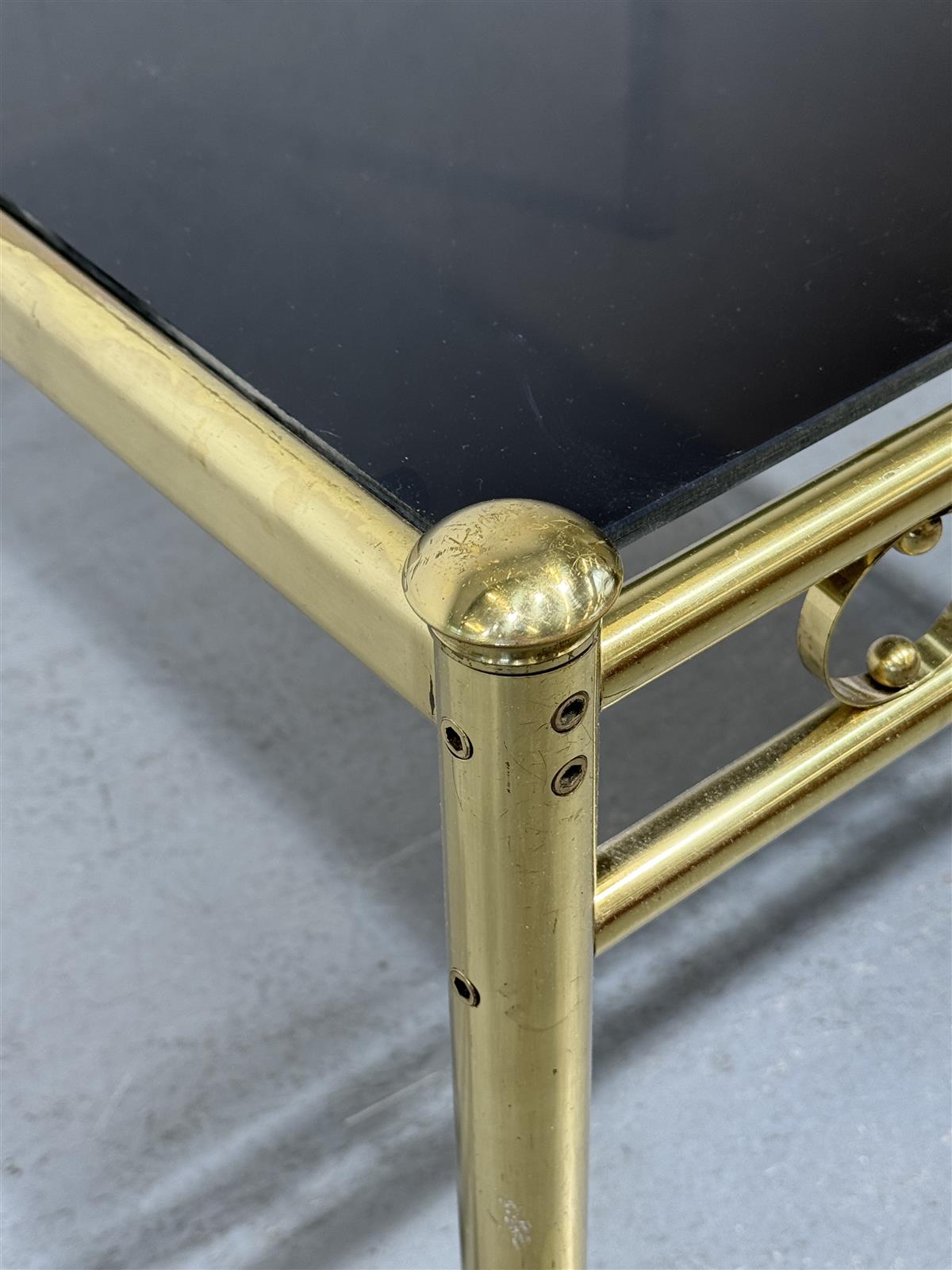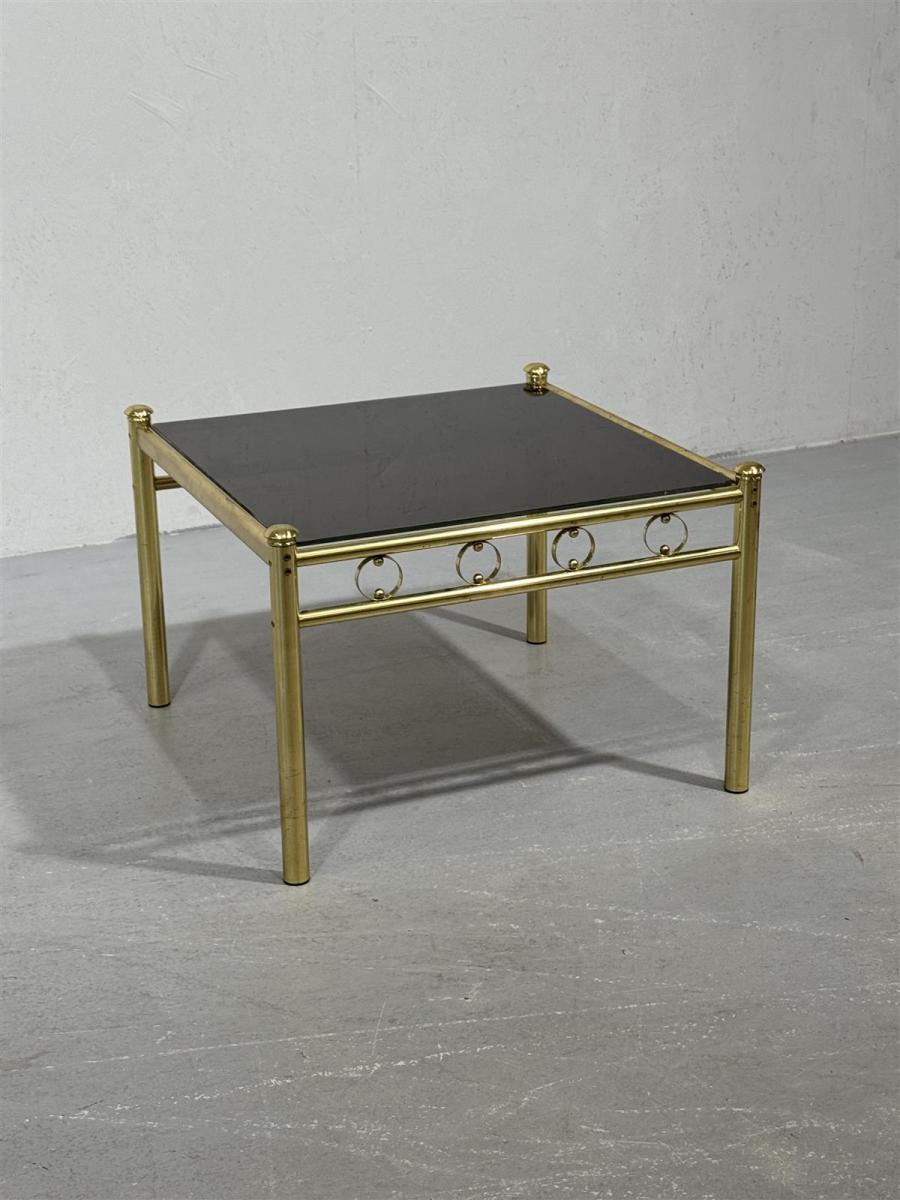 Tyylikäs 70-luvun sohvapöytä, jossa on lasinen pöytälevy ja kullan värinen, metallinen runko. Pöydän kultainen sävy tuo esiin aikakauden muotoilun hienostuneisuuden ja yksityiskohtien rikkauden. Pöydän alareunassa on koristeellisia ympyräkuvioita, jotka lisäävät visuaalista kiinnostavuutta.