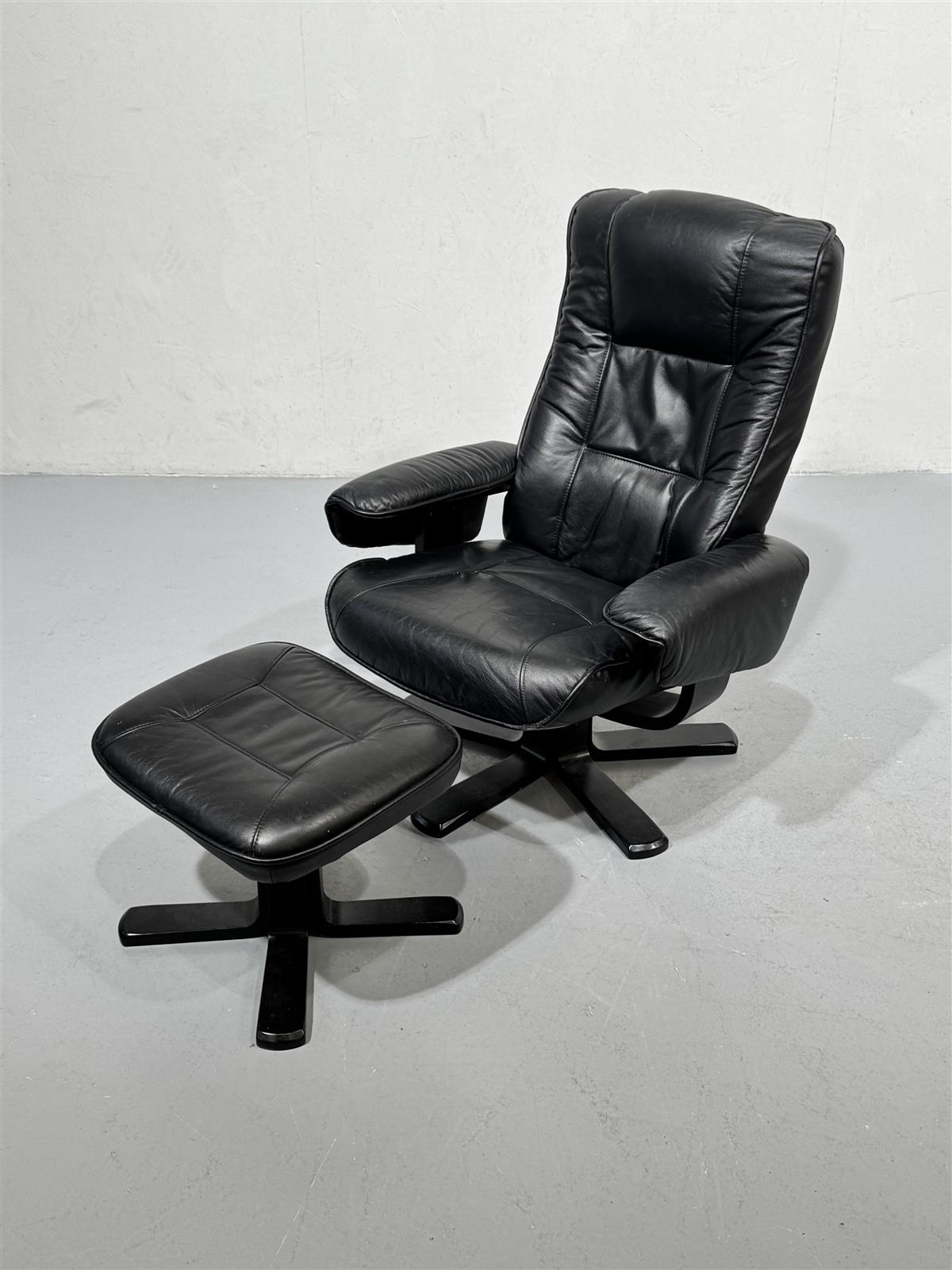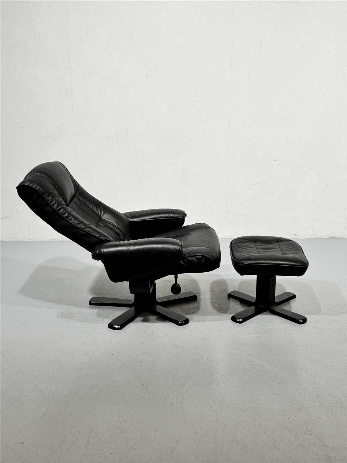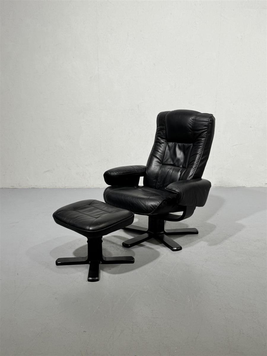 Tyylikäs 80-luvun nojatuoli, jossa on musta nahkaverhoilu ja yhteensopiva rahi. Tuolin muotoilu on ajaton ja mukava, täydellinen rentoutumiseen pitkän päivän jälkeen. Rahi tarjoaa lisämukavuutta ja tukea jaloille. Mekanismi sallii nojan painamisen hieman makuuasentoon.