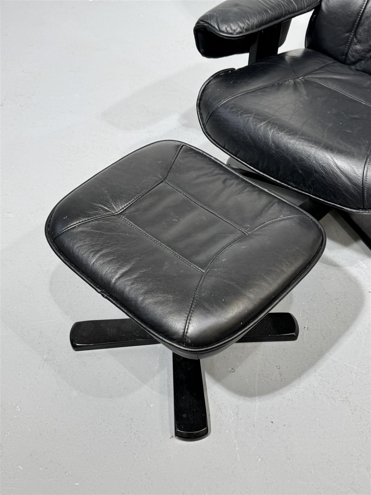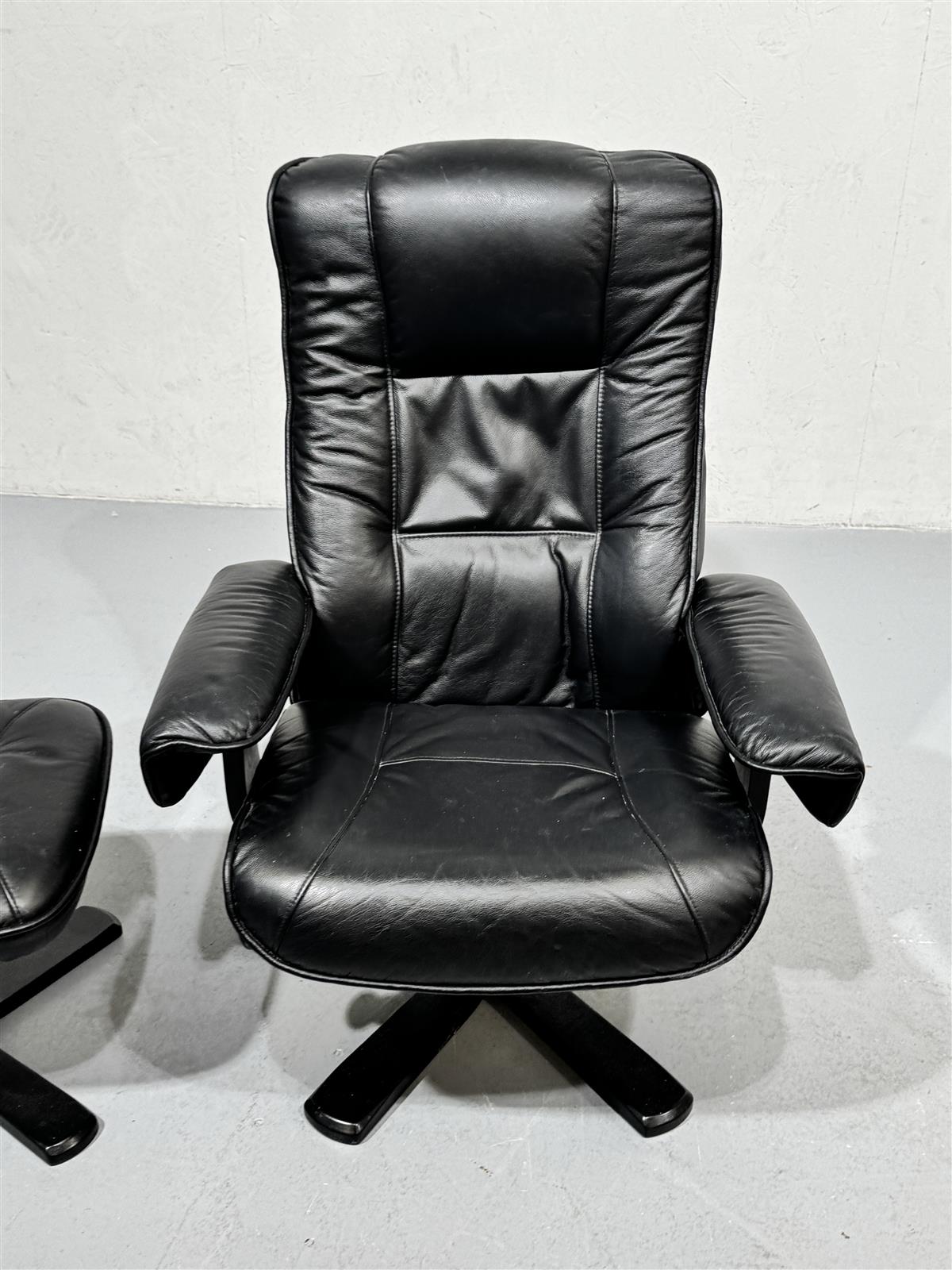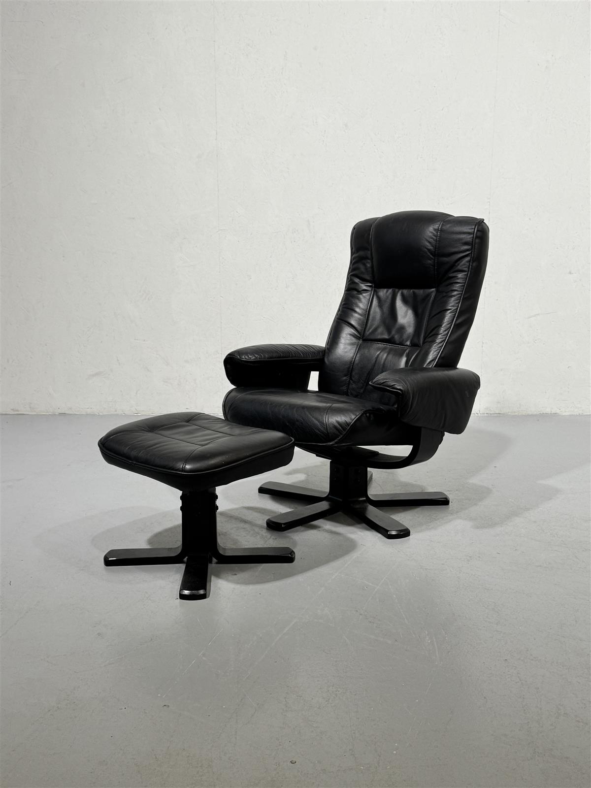 Tyylikäs 80-luvun nojatuoli, jossa on musta nahkaverhoilu ja yhteensopiva rahi. Tuolin muotoilu on ajaton ja mukava, täydellinen rentoutumiseen pitkän päivän jälkeen. Rahi tarjoaa lisämukavuutta ja tukea jaloille. Mekanismi sallii nojan painamisen hieman makuuasentoon.