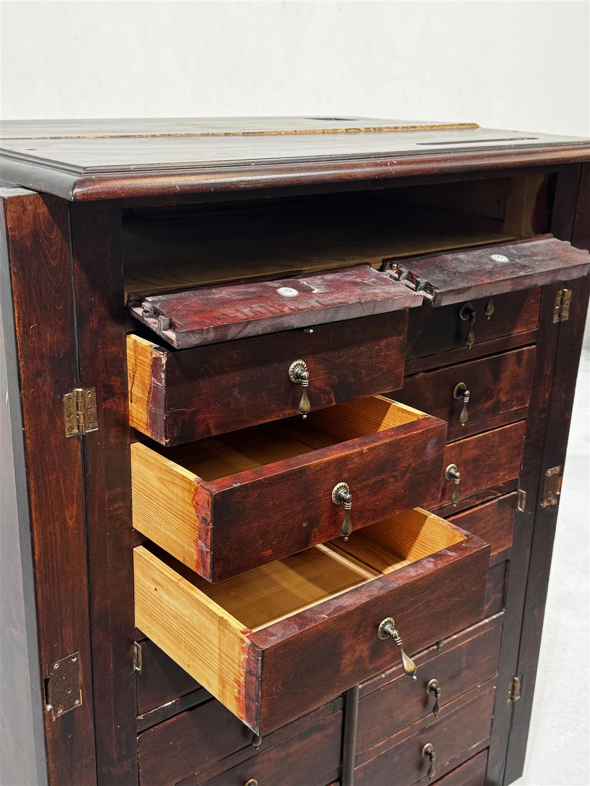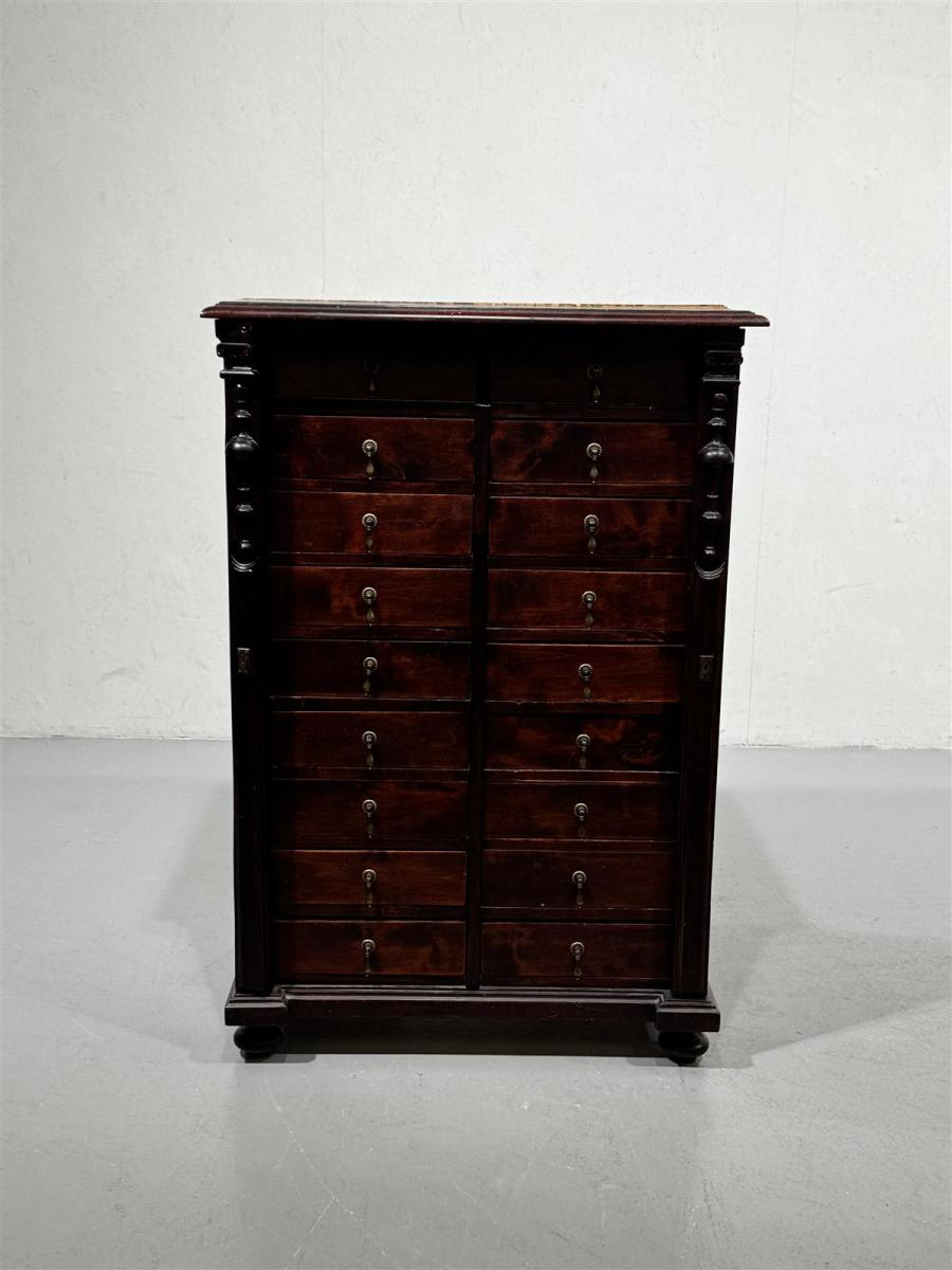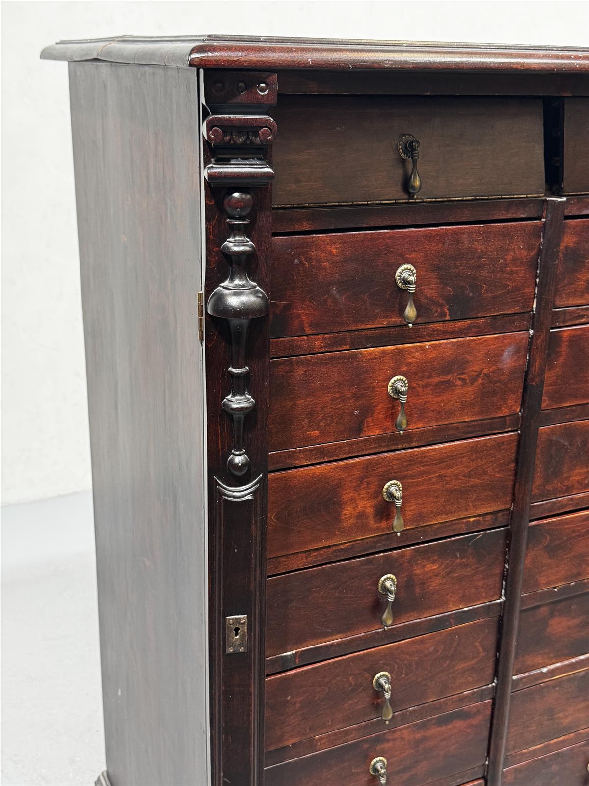 Tummanruskea vintage apteekkarin lipasto, jossa on useita vetolaatikoita ja lukitusmekanismi reunojen koristepaneeleissa. Laatikoissa on koristeelliset vetimet. Lipasto on tilava ja tarjoaa runsaasti säilytystilaa erilaisille tavaroille. Materiaali on raskasta puuta, ja se on säilyttänyt alkuperäisen värinsä hyvin.