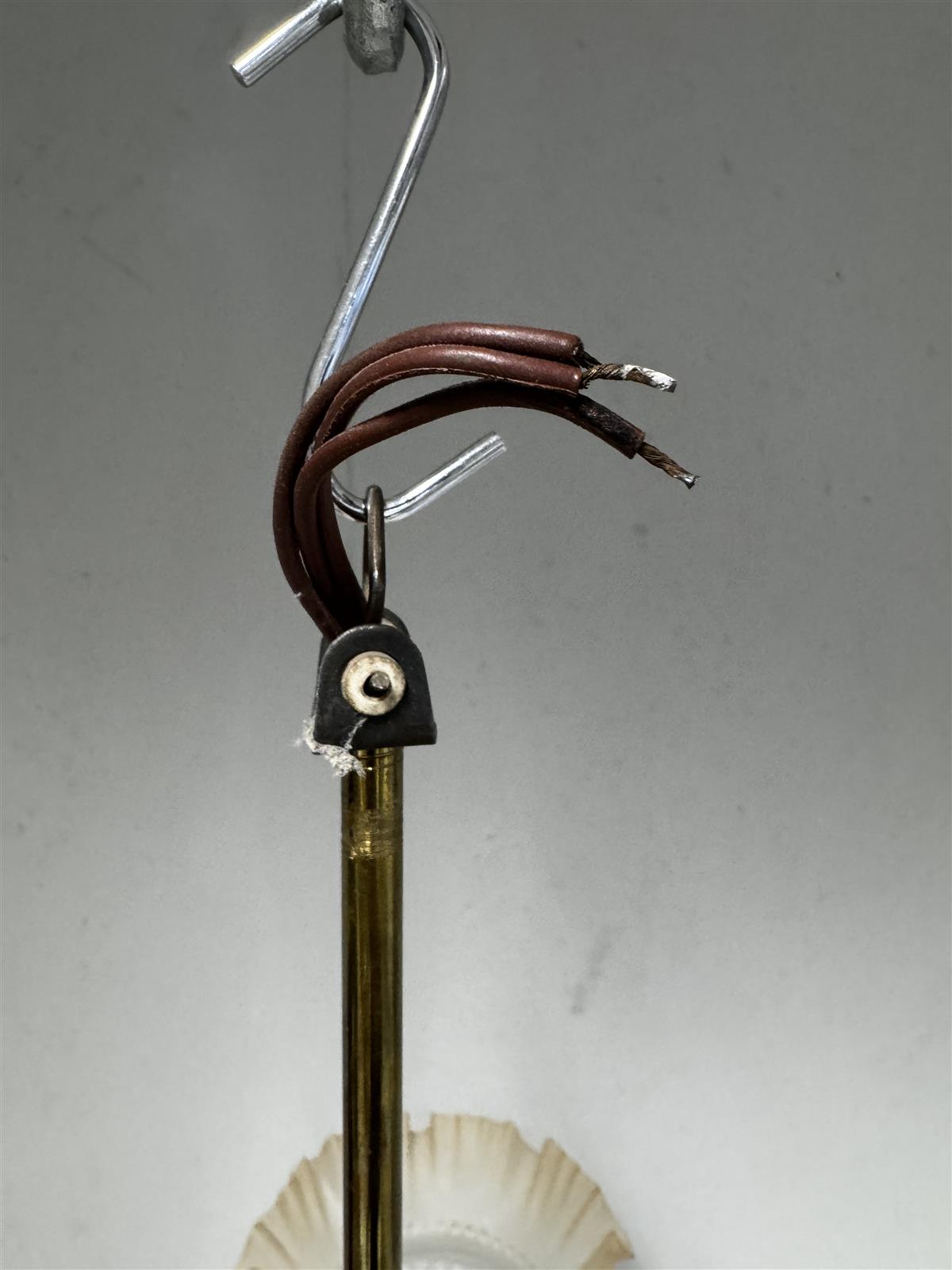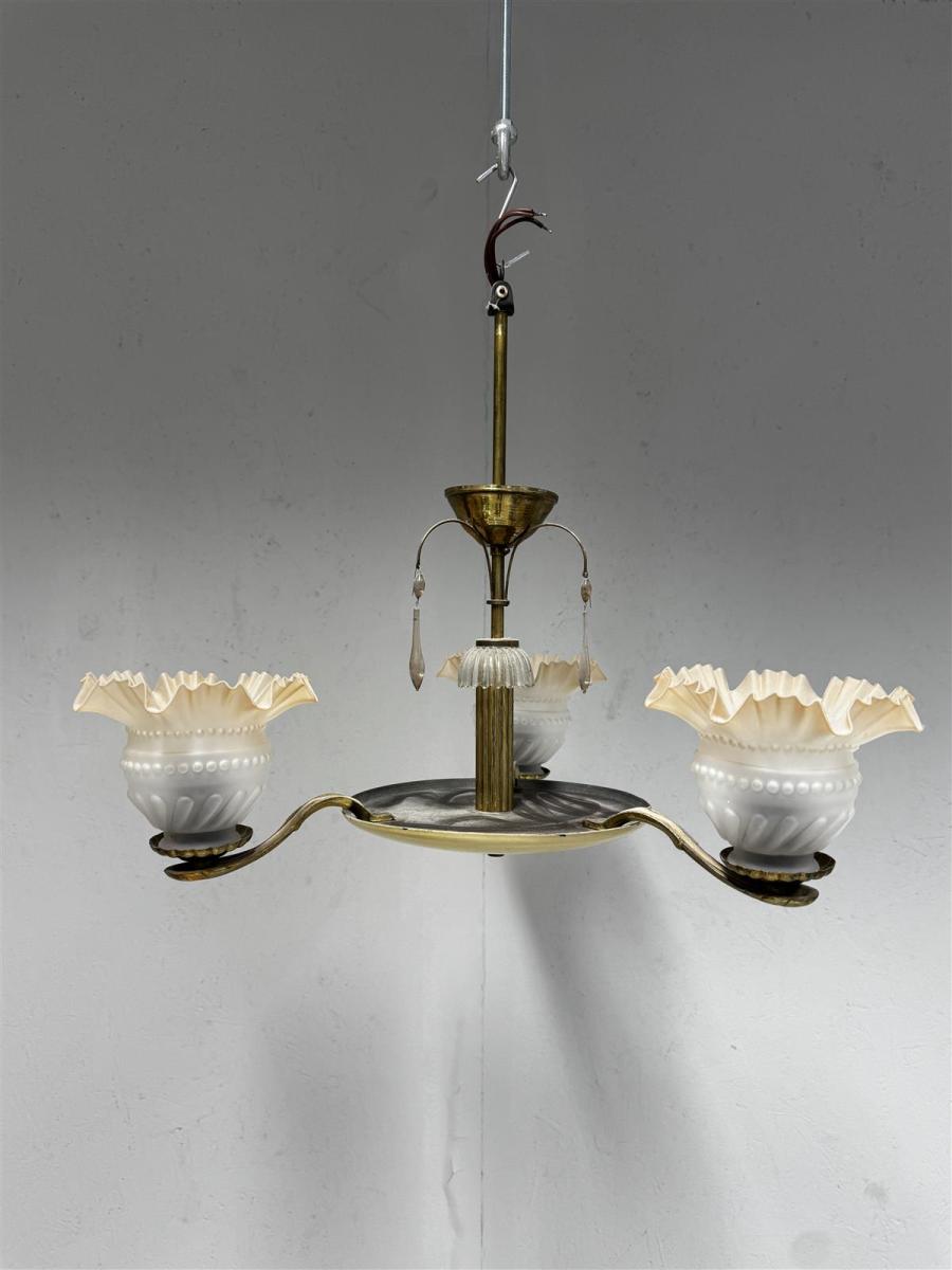 Vintage kattokruunu, jossa on kolme lasista varjostinta. Varjostimet ovat valkoisia ja niissä on koristeellisia yksityiskohtia. Rungossa on messinkinen viimeistely ja koristeellisia lasiriipuksia, jotka lisäävät valaisimen viehättävyyttä.