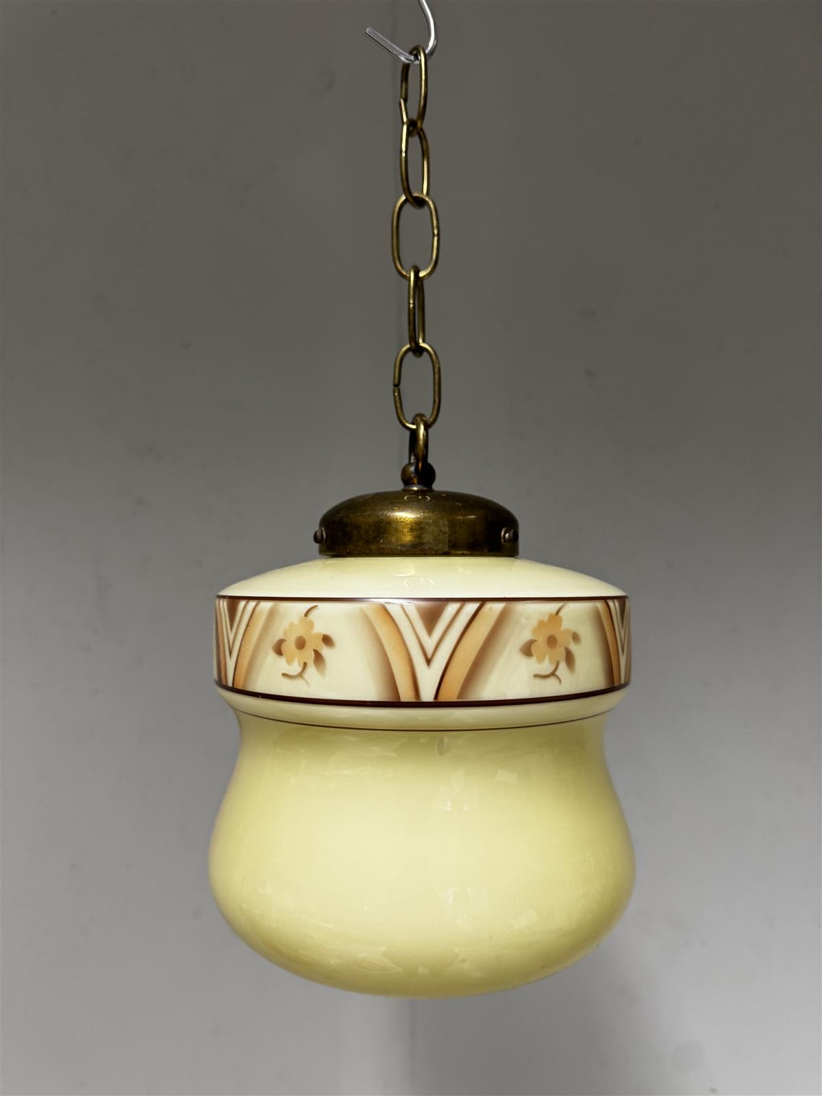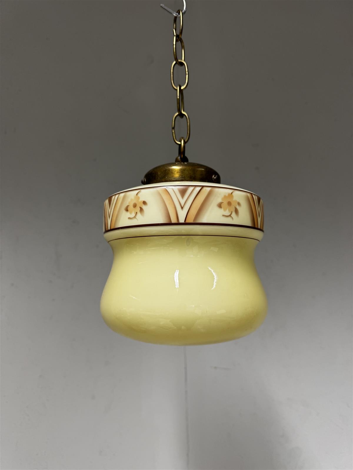 Vintage art deco kattovalaisimen kupu, jossa on kauniisti kuvioitu lasikupu. Kupua koristavat geometriset ja kukkakuvioinnit, jotka tuovat esiin aikakauden tyylin. Metallinen ripustusketju ja kiinnike ovat ajan patinoimat, mikä lisää valaisimen viehättävyyttä.