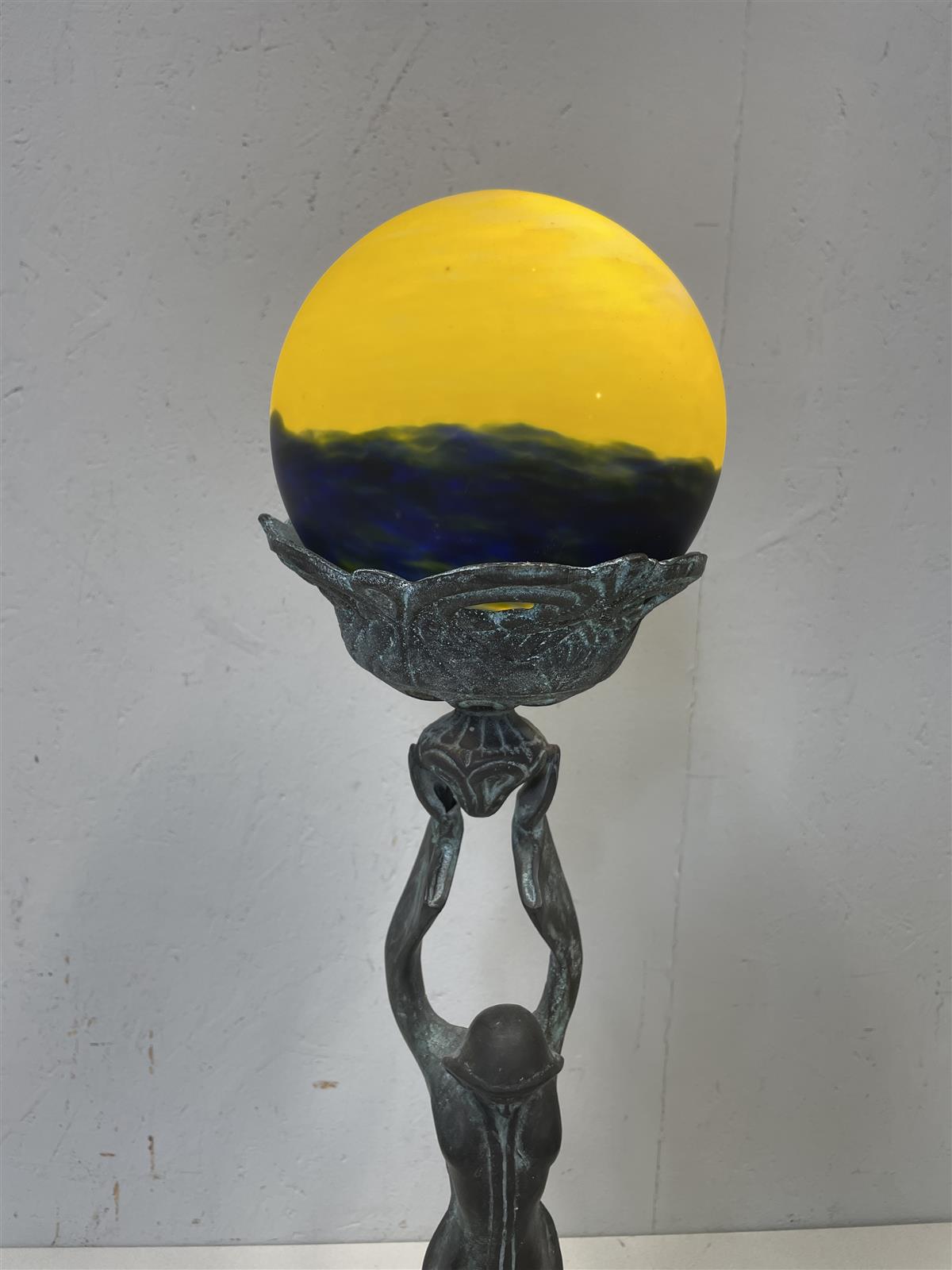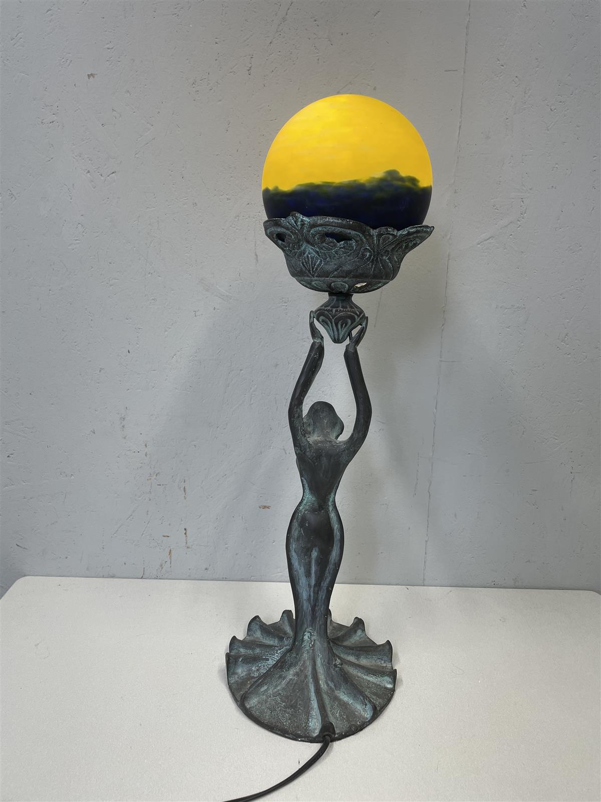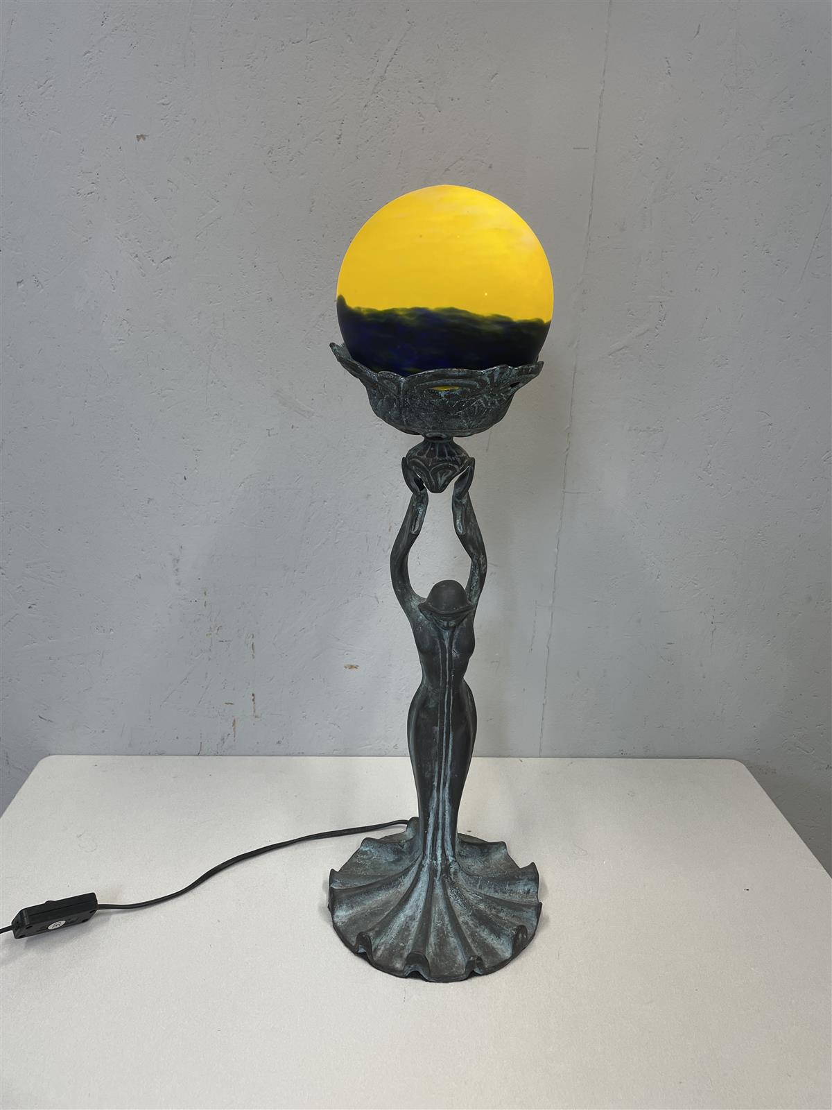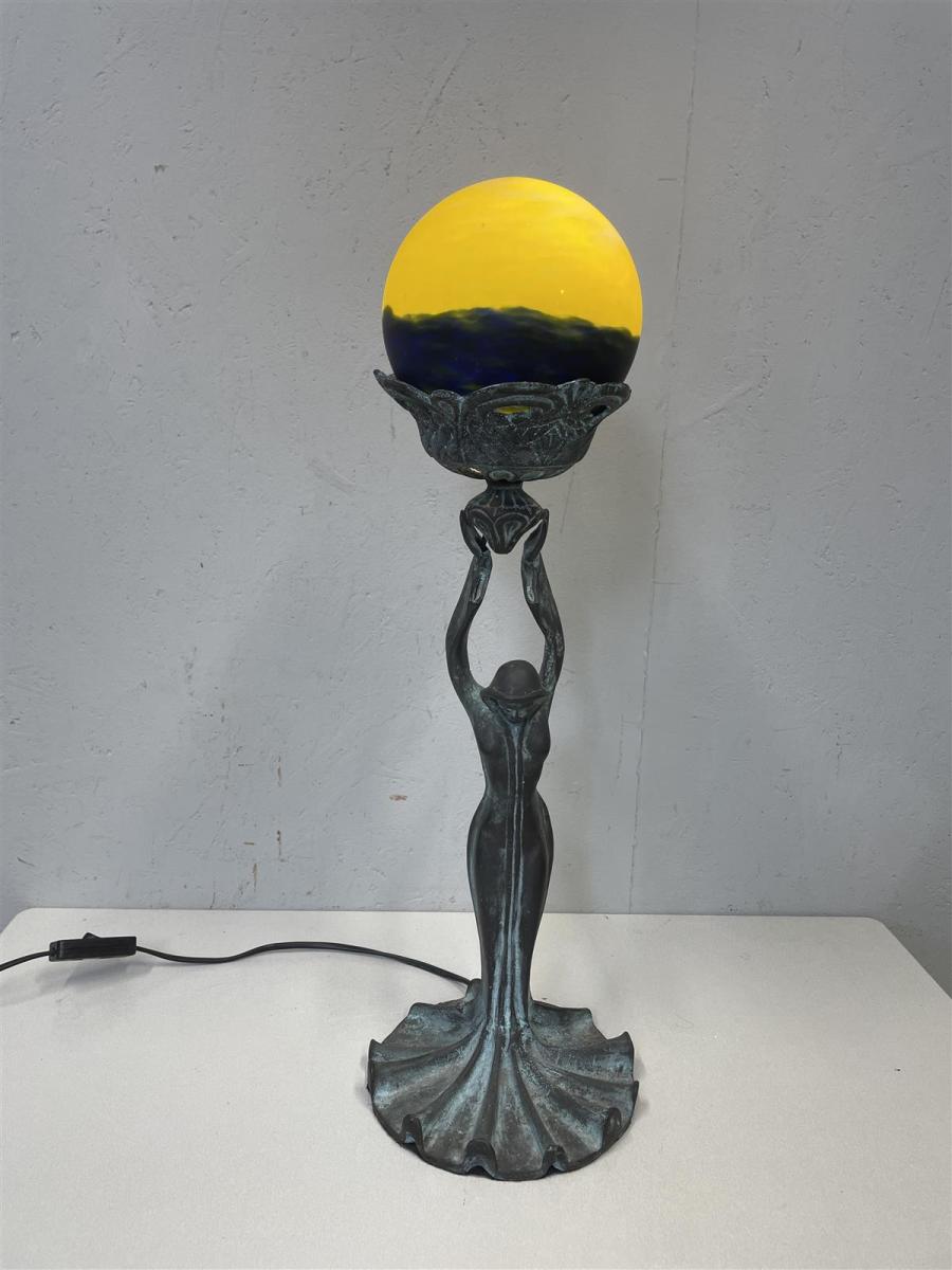 Tyylikäs art nouveau pöytävalaisin, jossa on naishahmoa esittävä jalusta ja värikäs lasikupu. Valaisin on valmistettu pronssista ja lasista, ja siinä on kauniit yksityiskohdat, jotka korostavat sen aikakautta. Lasikuvun keltainen ja sininen sävy luovat lämpimän ja kutsuvan valon.