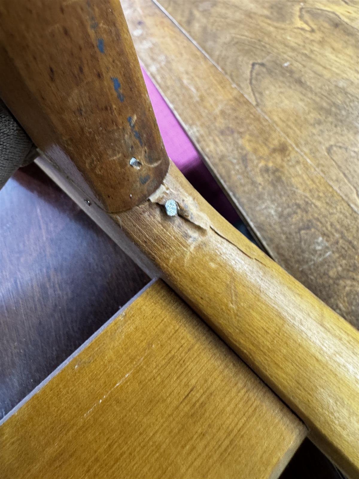 Tuolissa on havaittavissa kulumaa ja pieniä naarmuja. Yksi jalka on korjattu naulalla.