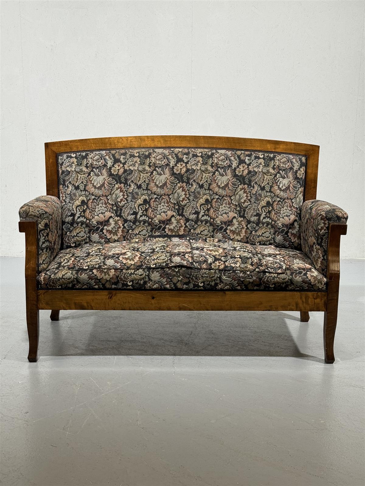 Tyylikäs biedermeier taittosohva, jossa on kauniit puurunko ja kukkakuvioinen verhoilu. Tämä sohva on erinomainen esimerkki 1800-luvun alun eurooppalaisesta muotoilusta, jossa yhdistyvät eleganssi ja käytännöllisyys.