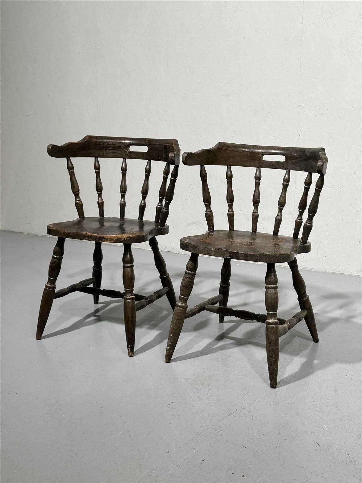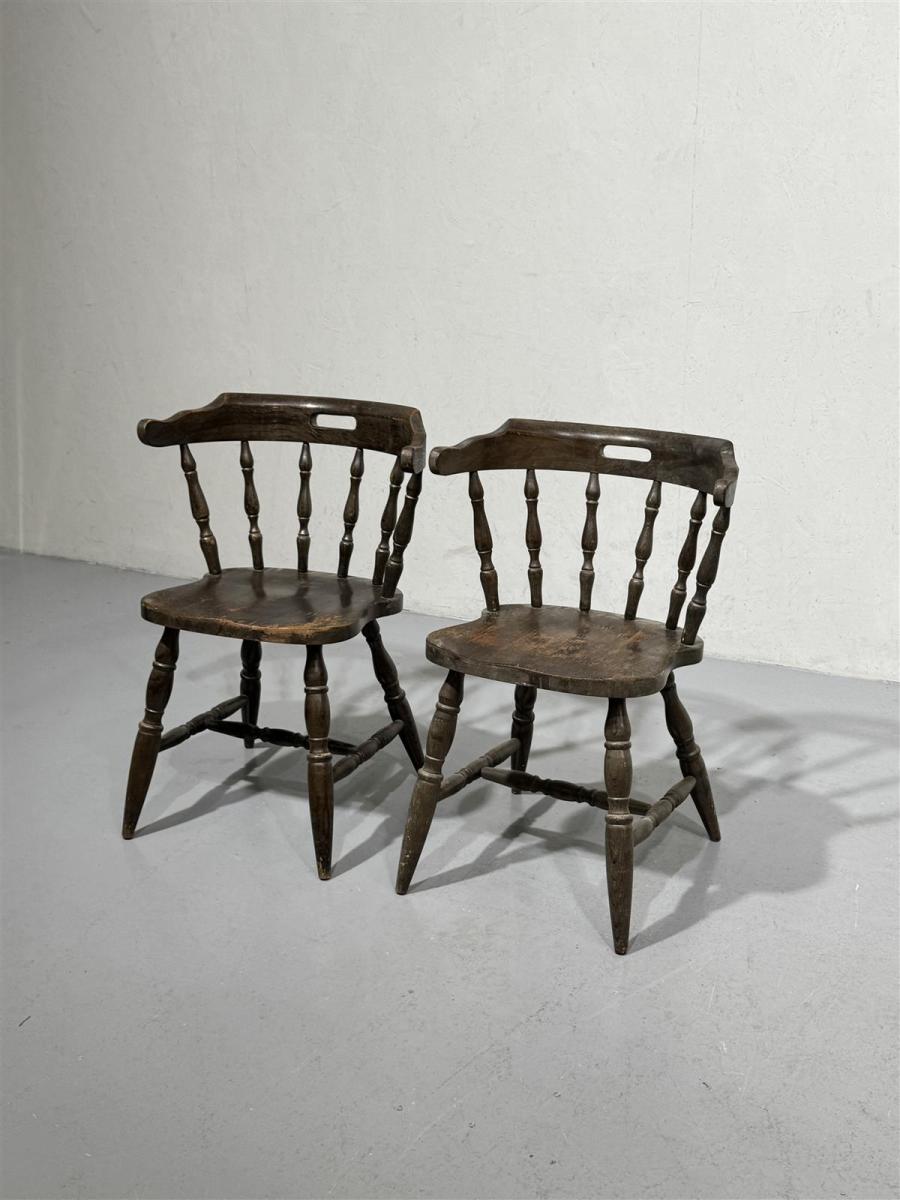 Kaksi vanhaa bonanza tyylistä, joissa on ruskea puupinta ja selkänojan kaarevat pinnat. Tuolit ovat tukevat ja niissä on perinteinen muotoilu, joka tuo mieleen menneiden aikojen maalaistalot.