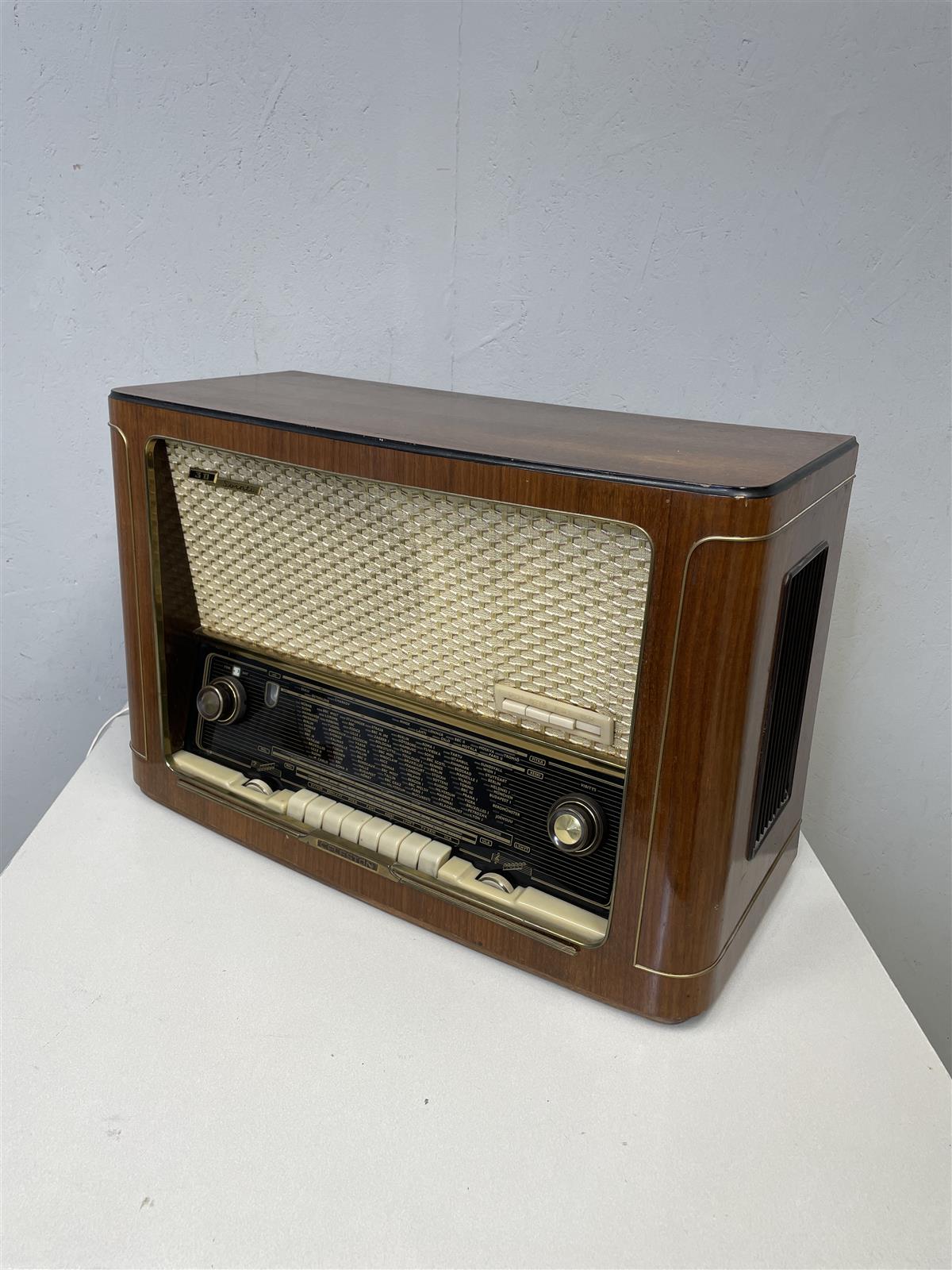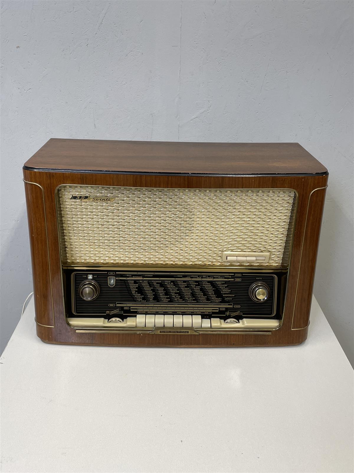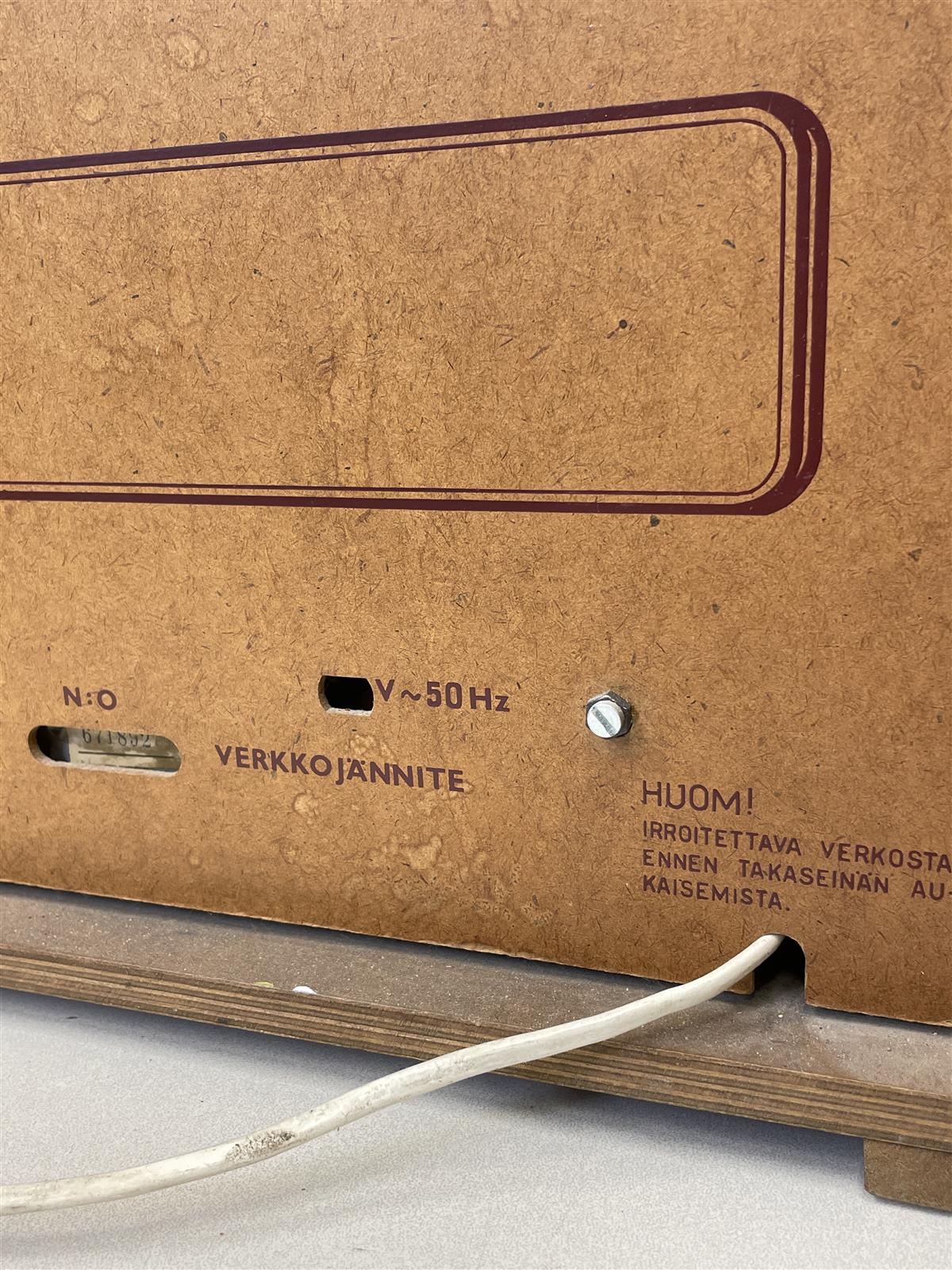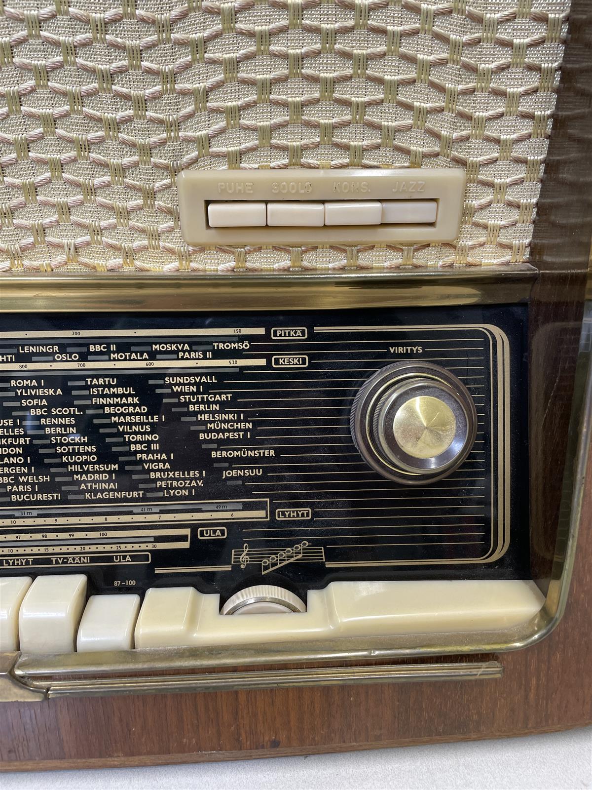 Vintage Celeston Royal radio, puinen kotelo, etupaneelissa kangasverhoilu ja säätimet. Takalevyssä liitännät magnetofonille ja nauhoitukselle.