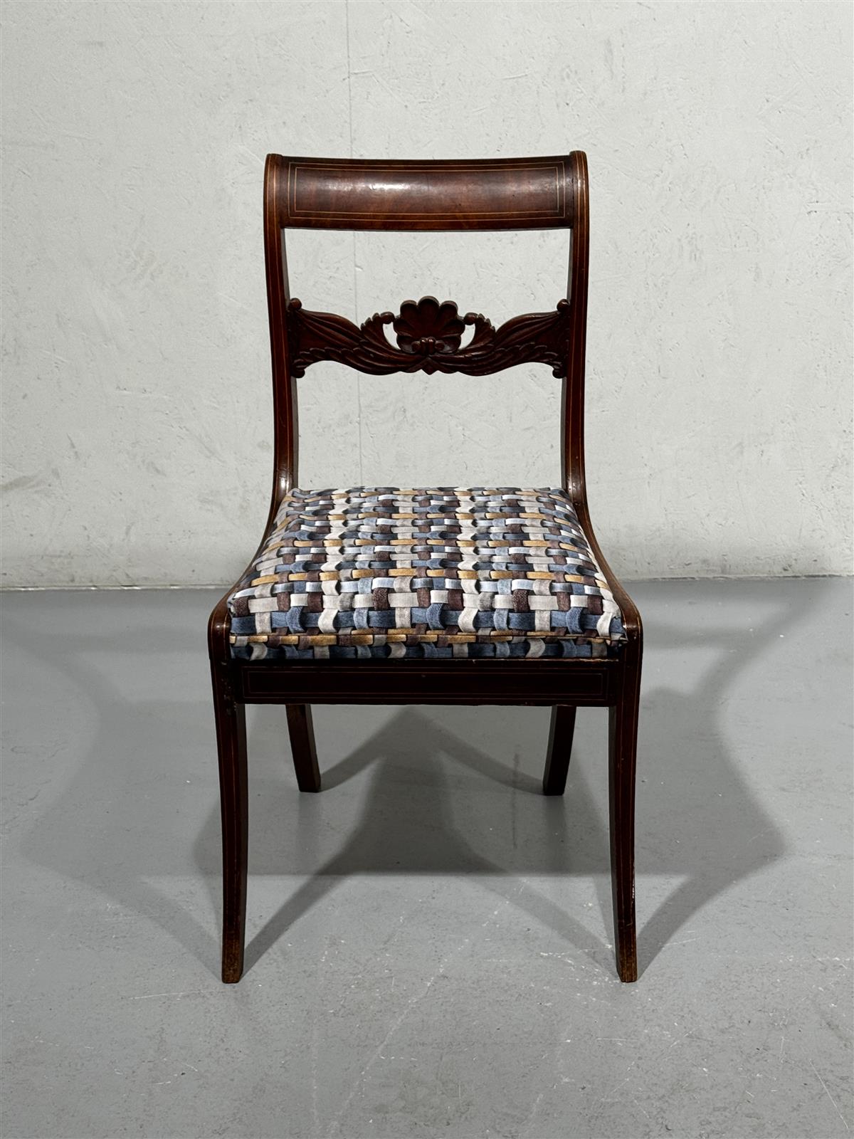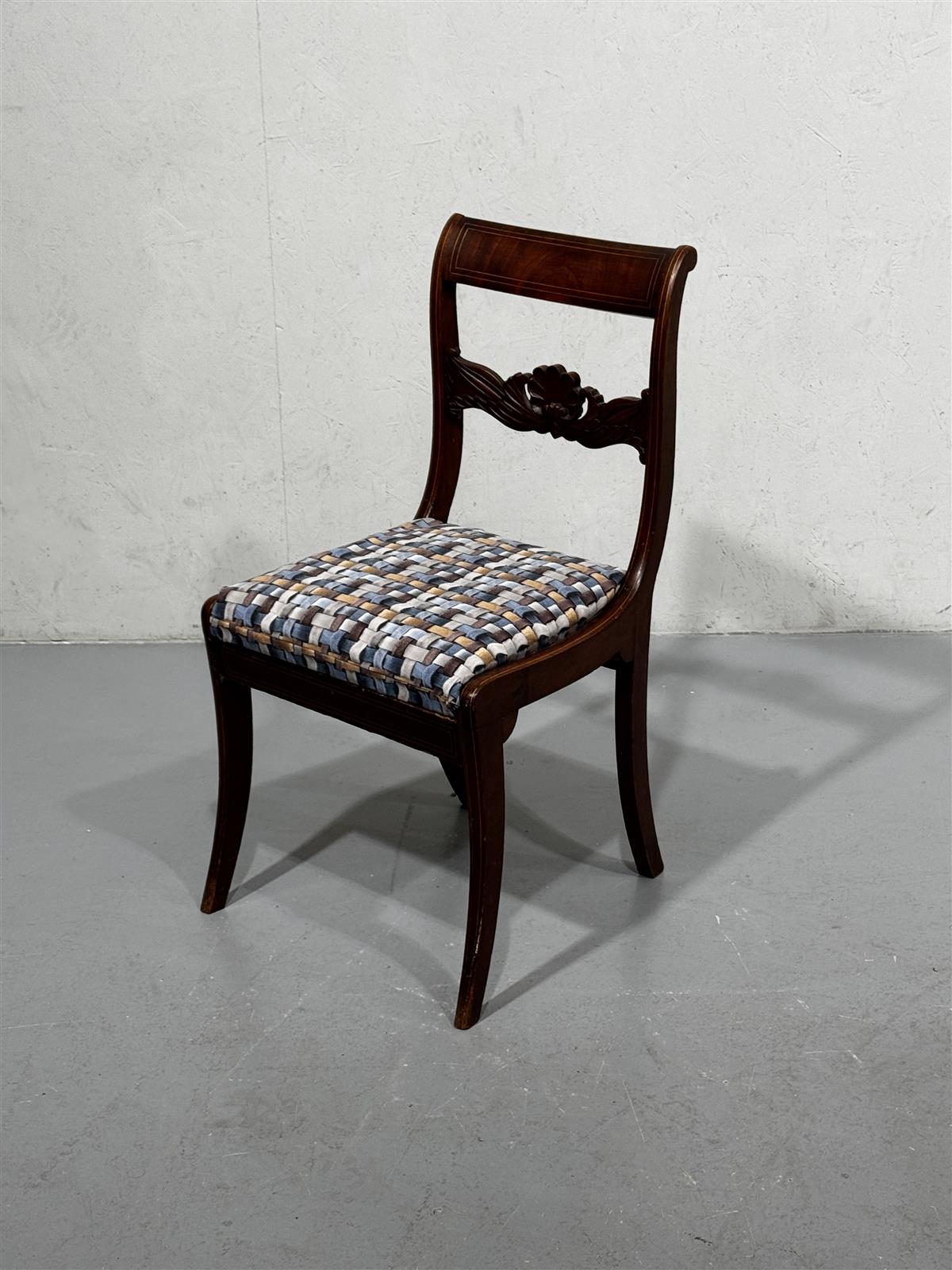 Tyylikäs empire-tyylinen tuoli, jossa on koristeellinen selkänoja ja monivärinen istuinverhoilu. Puuosat ovat tummanruskeat ja kauniisti muotoillut, mikä tuo esiin aikakauden tyylin hienostuneisuuden.