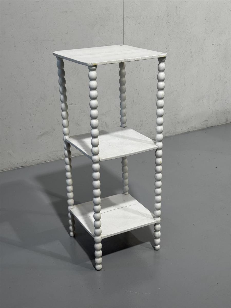 Kolmitasoinen siro vintage valkoinen hyllykkö, jossa on koristeelliset jalat. Hyllykkö on valmistettu puusta.